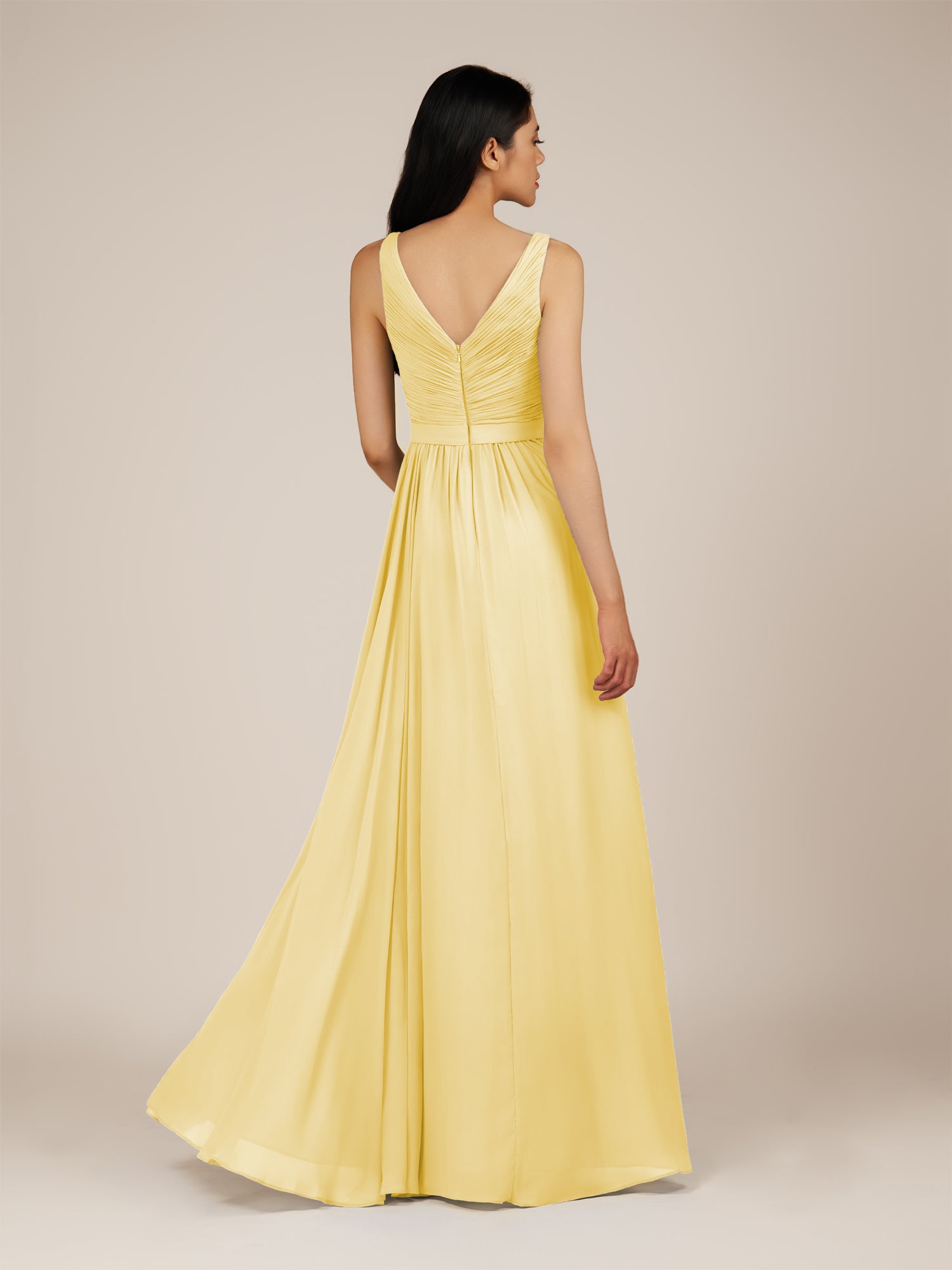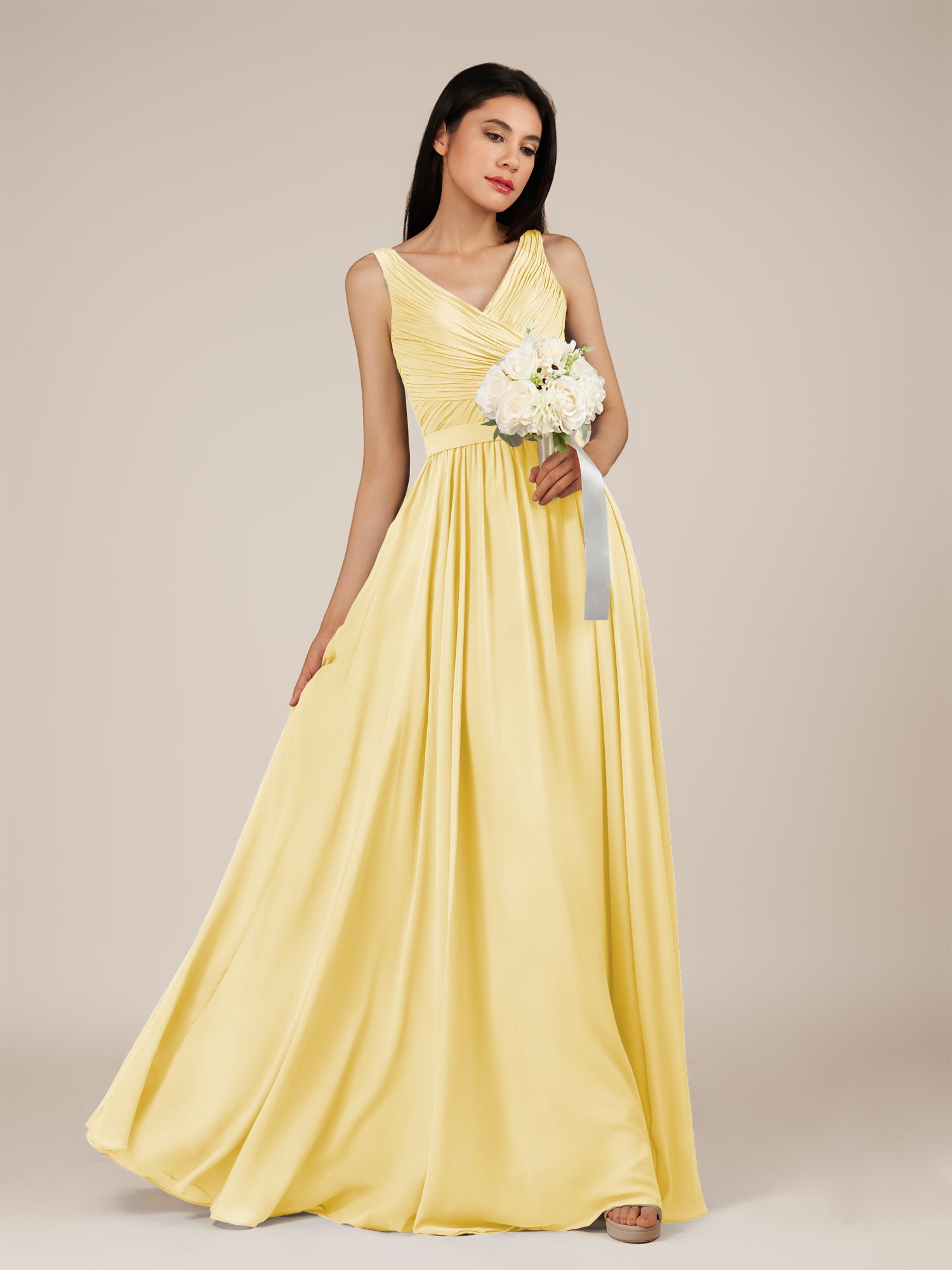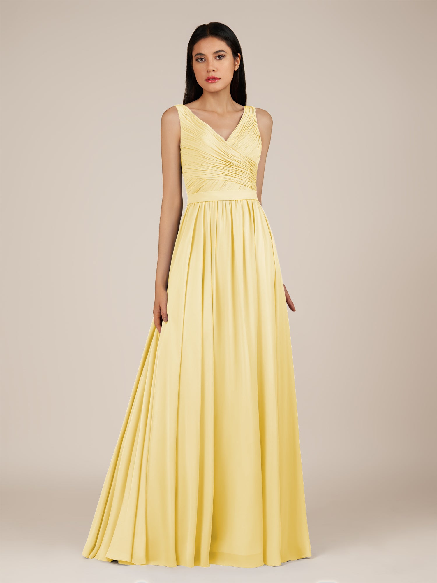 Lysander | Pastel Yellow - A Line Chiffon V Neck Pleated Long Bridesmaid Dress