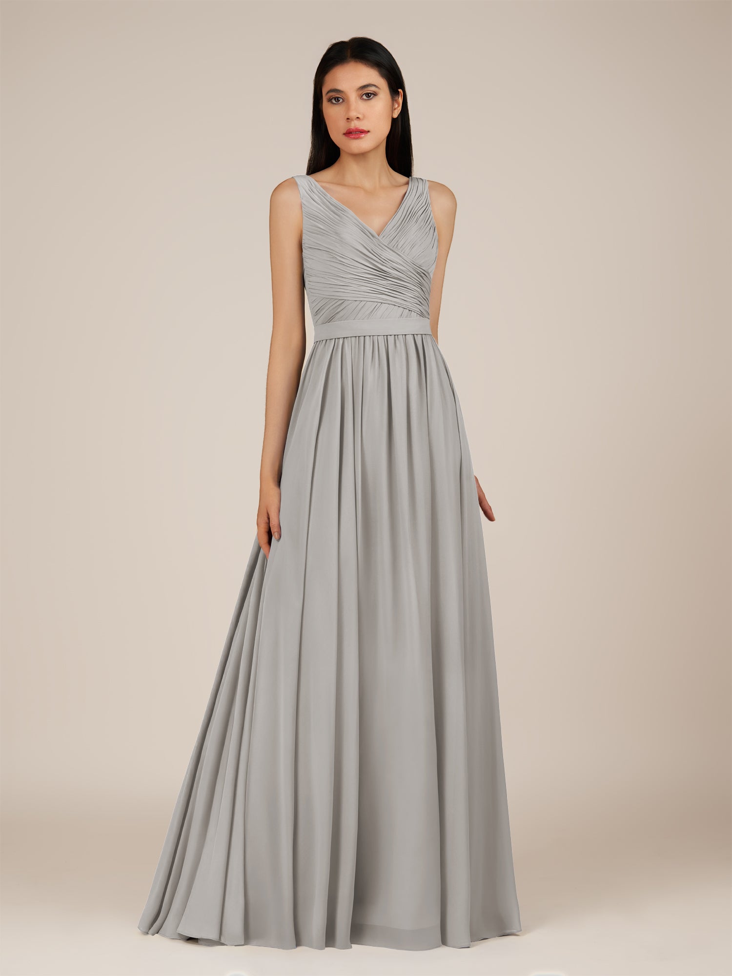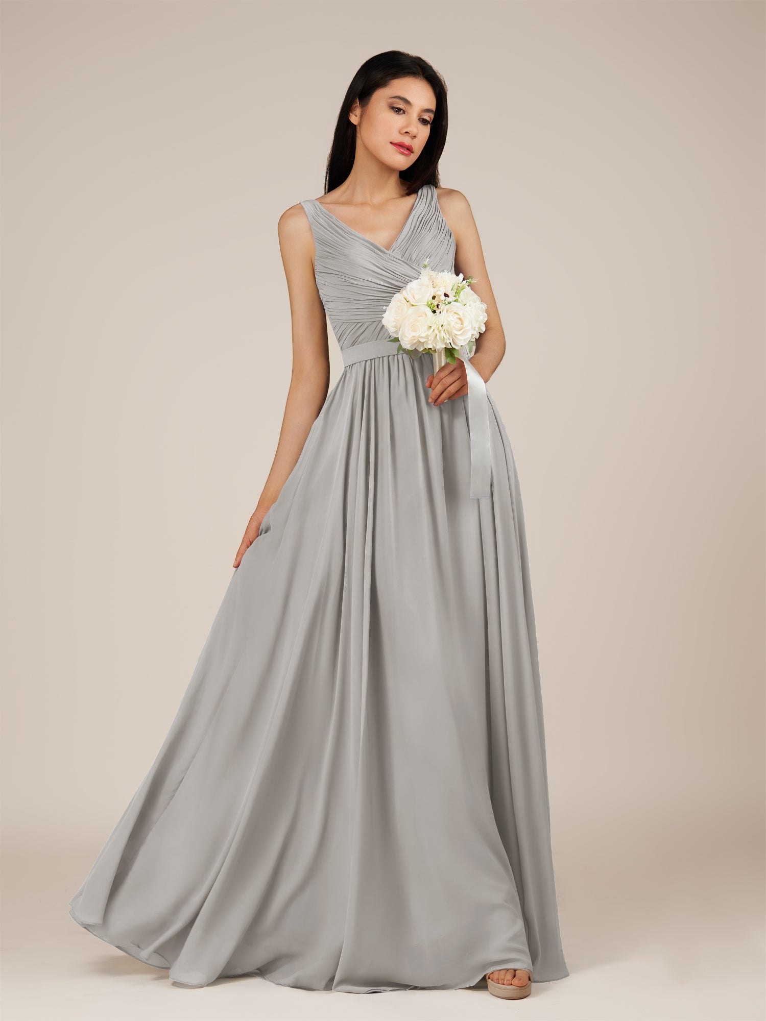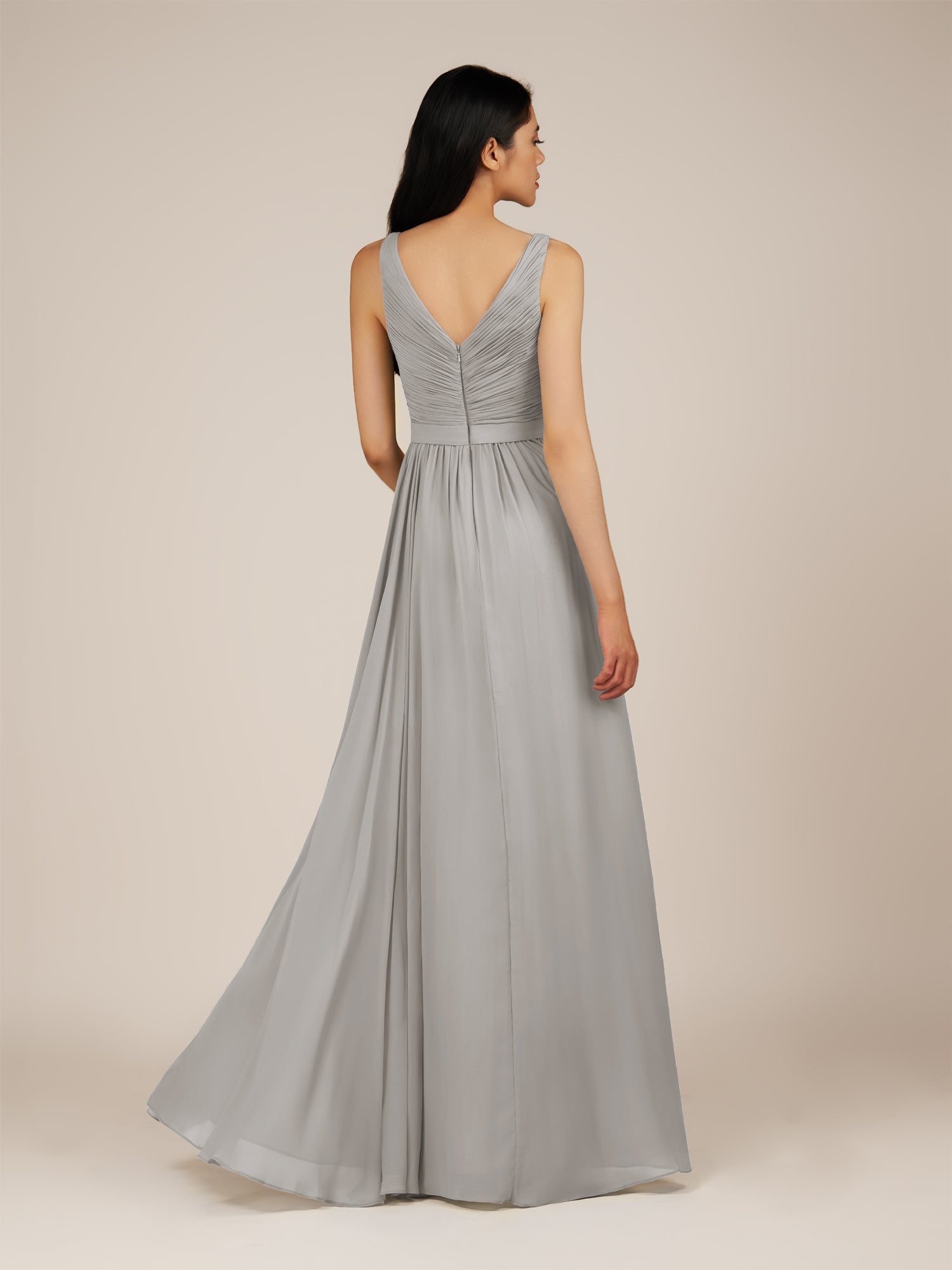 Lysander | Silver - A Line Chiffon V Neck Pleated Long Bridesmaid Dress