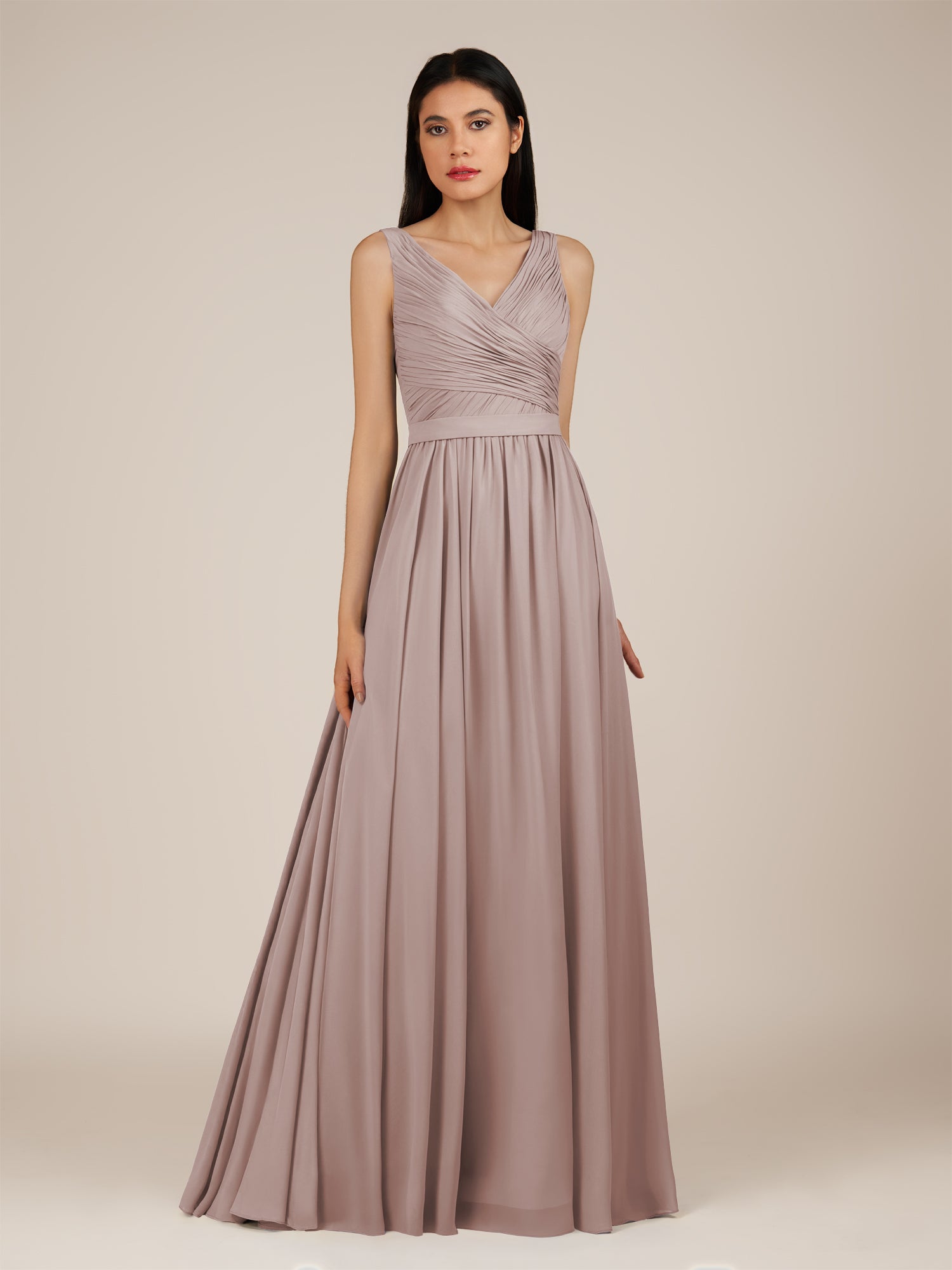 Lysander brings a timeless touch of elegance to your bridal party. Crafted from soft chiffon, this A-line bridesmaid dress features a flattering V-neckline and a pleated bodice that enhances the natural waistline. The floor-length skirt flows effortlessly, creating graceful movement with every step. Finished with a classic zipper back, Lysander offers a refined and romantic look that¡¯s perfect for any season or wedding theme.