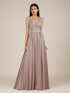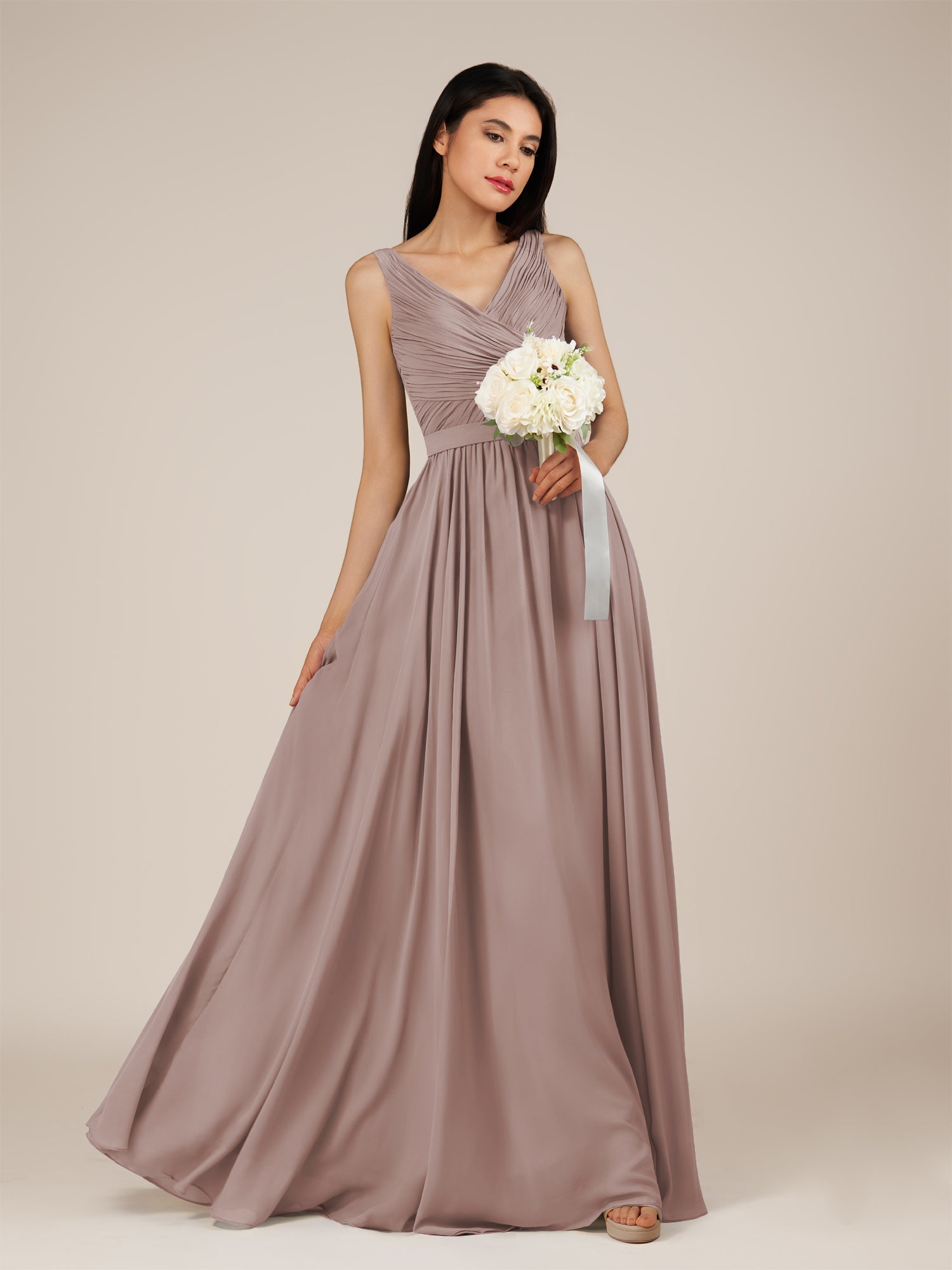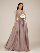 Lysander | Toffee - A Line Chiffon V Neck Pleated Long Bridesmaid Dress