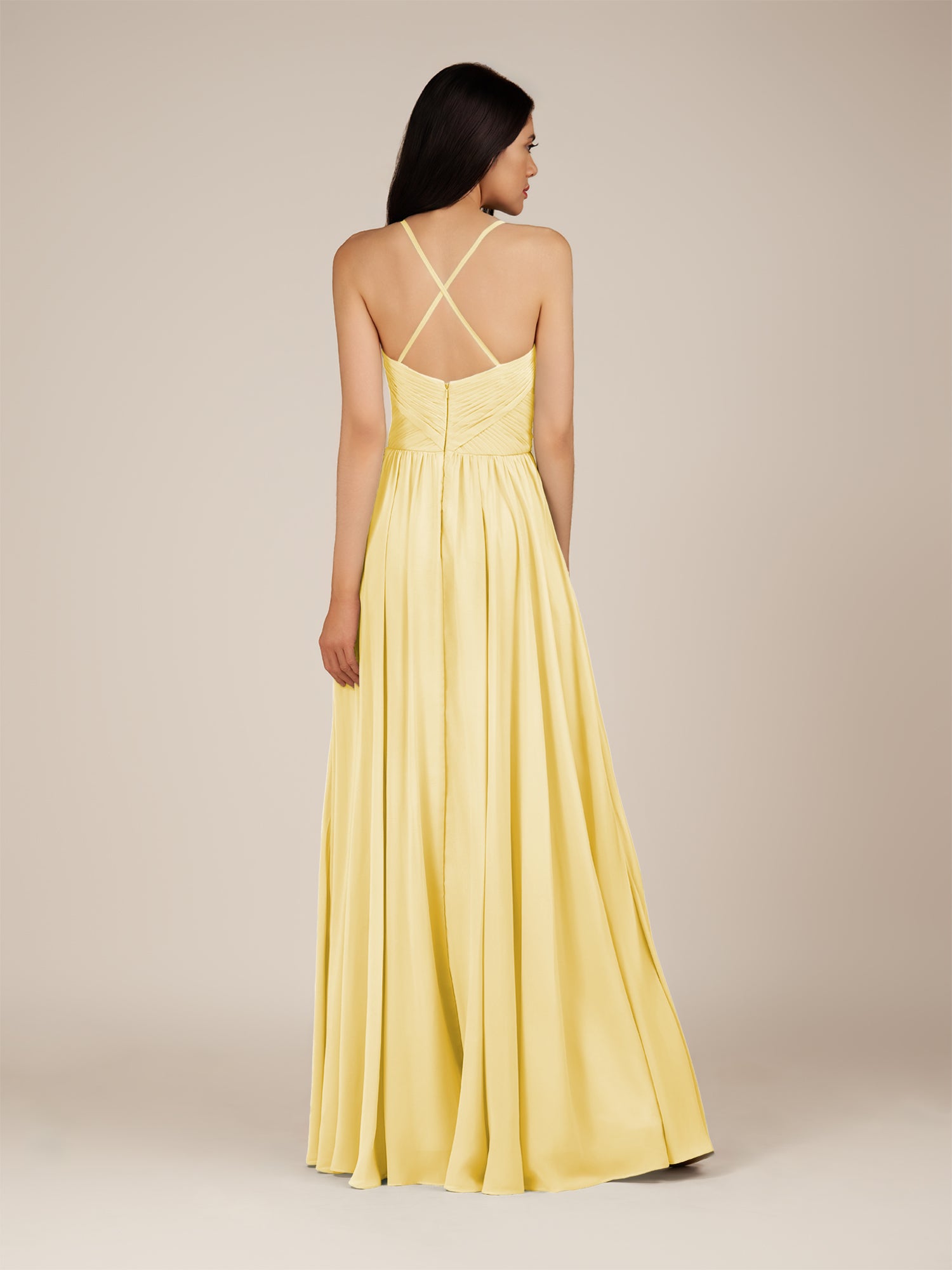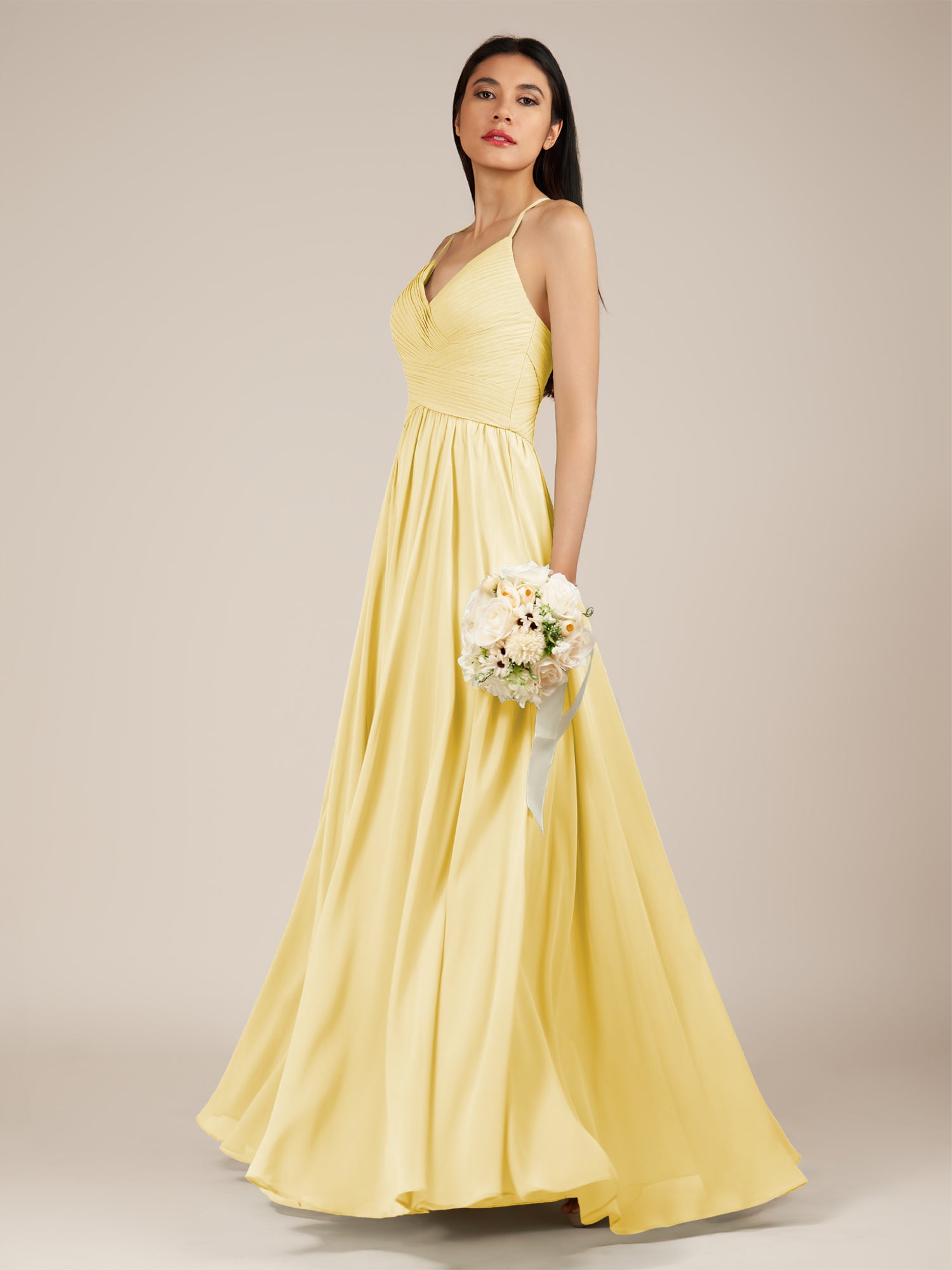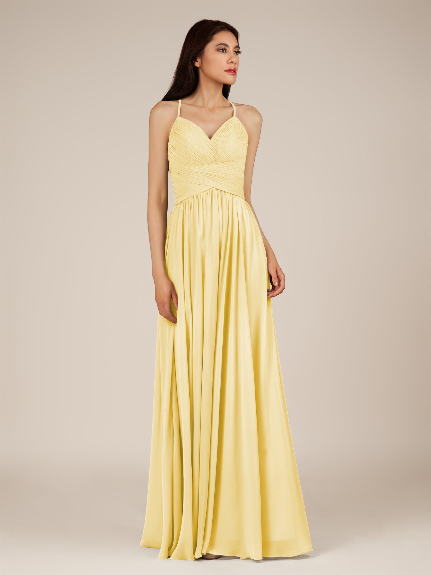 Nolana | Pastel Yellow - A Line V Neck Chiffon Pleated Long Bridesmaid Dress