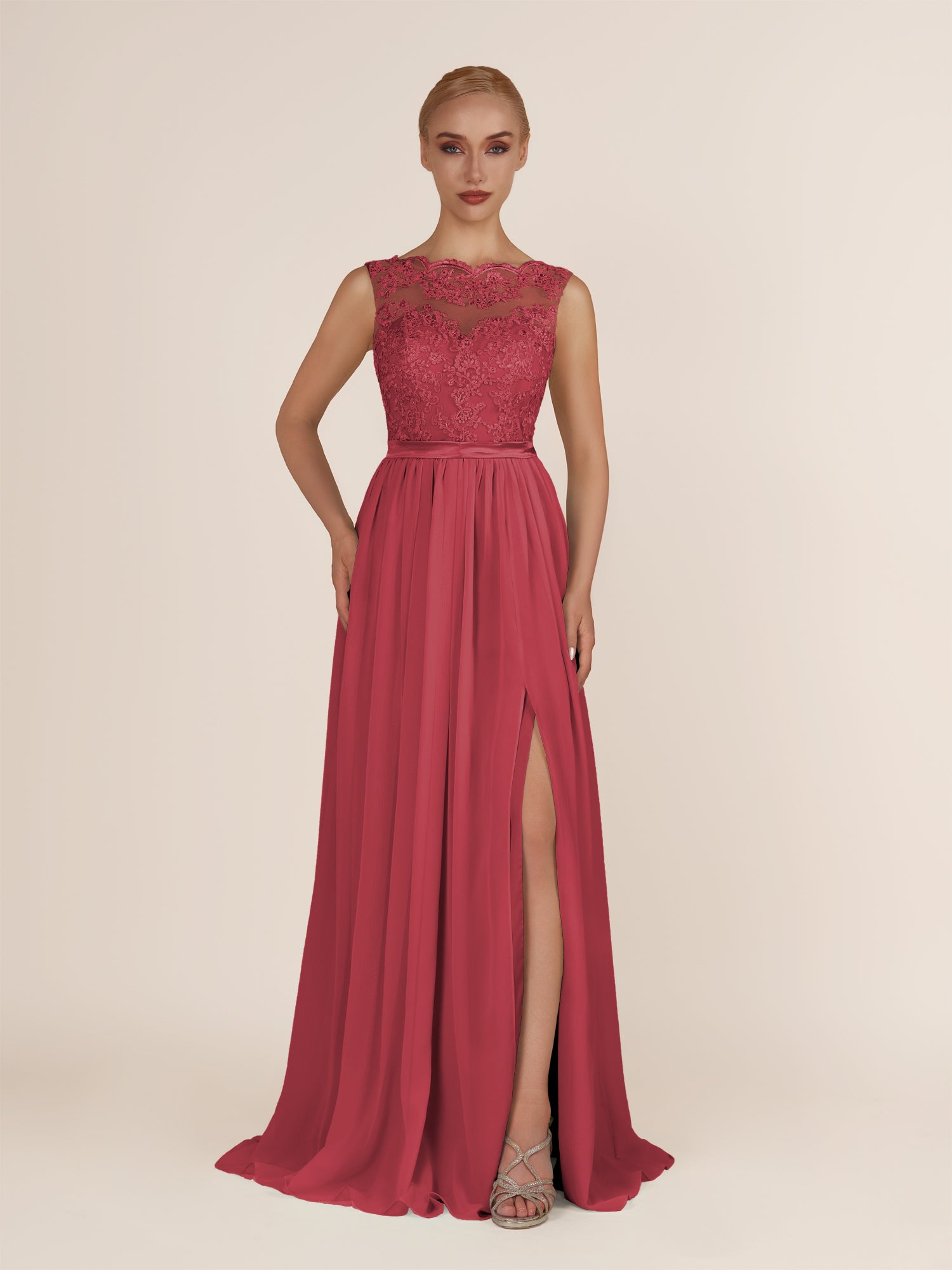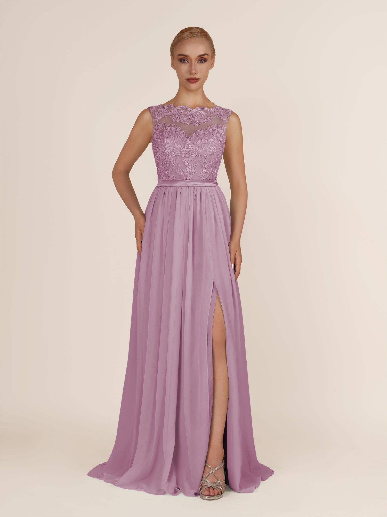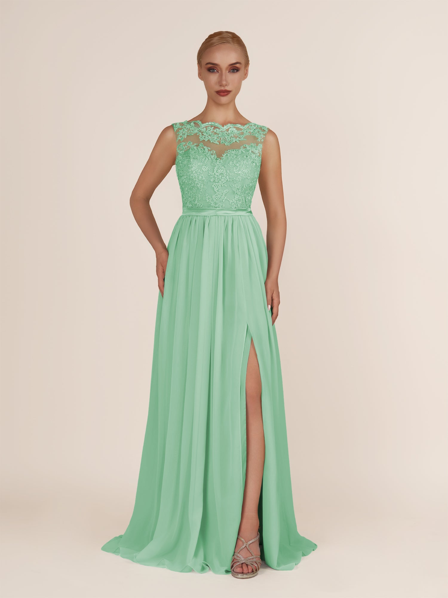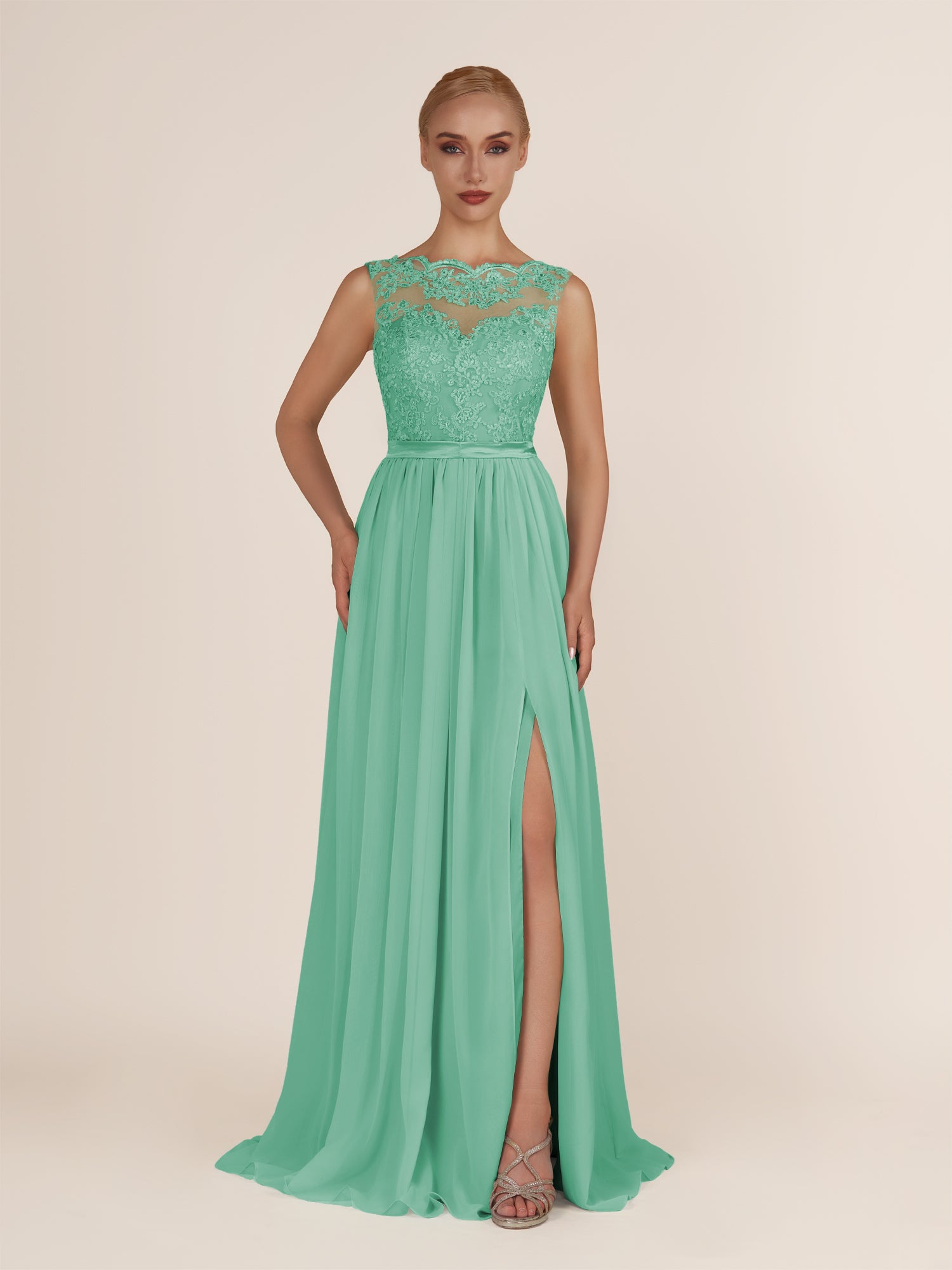 Sable | A-Line Illusion Neck Chiffon Long Bridesmaid Dress with Lace Appliques