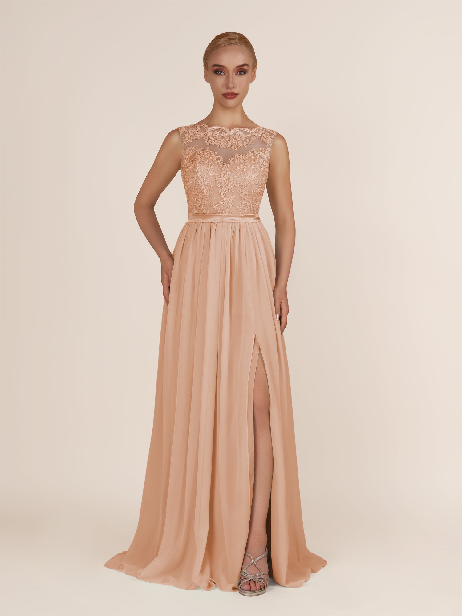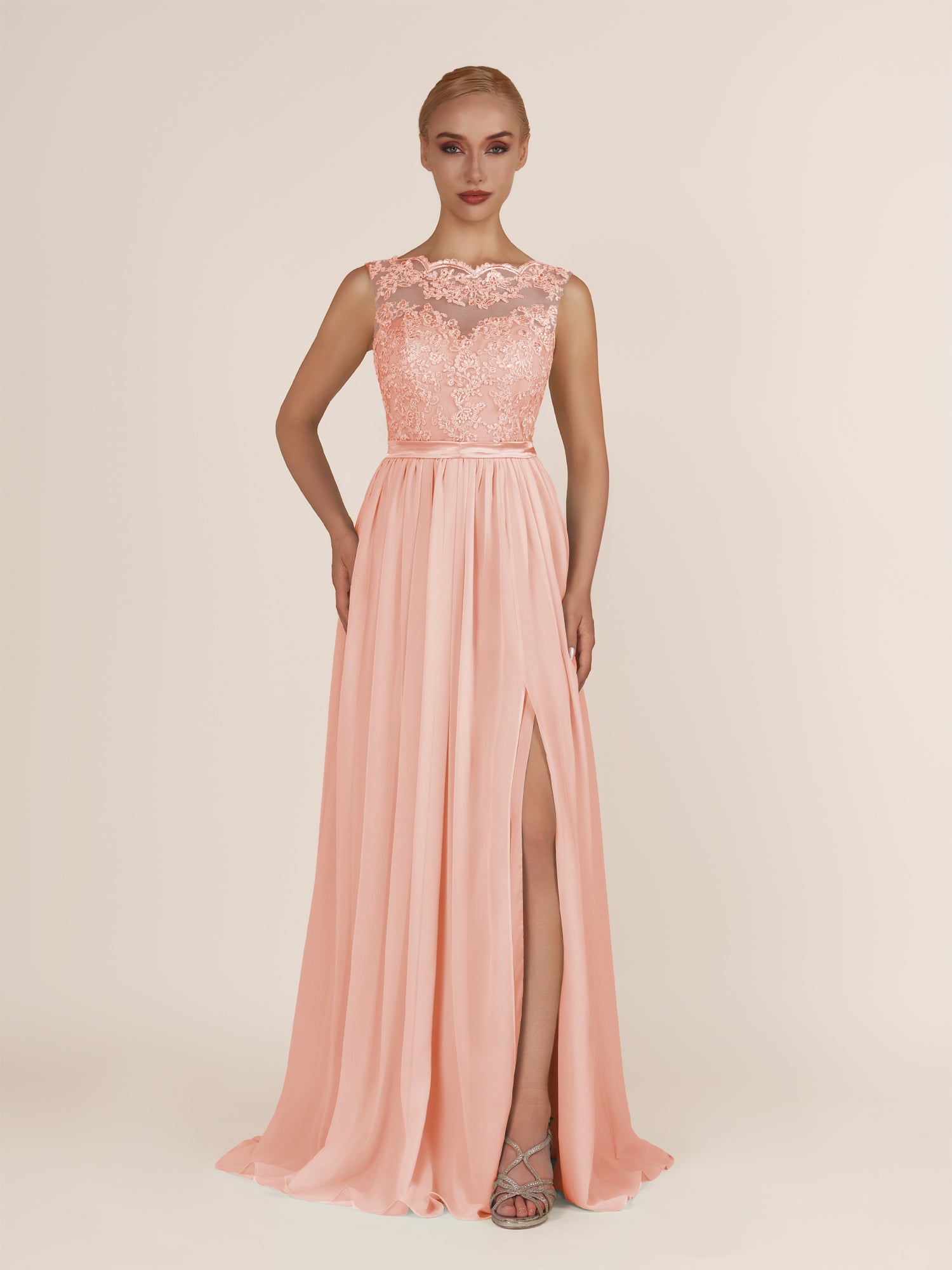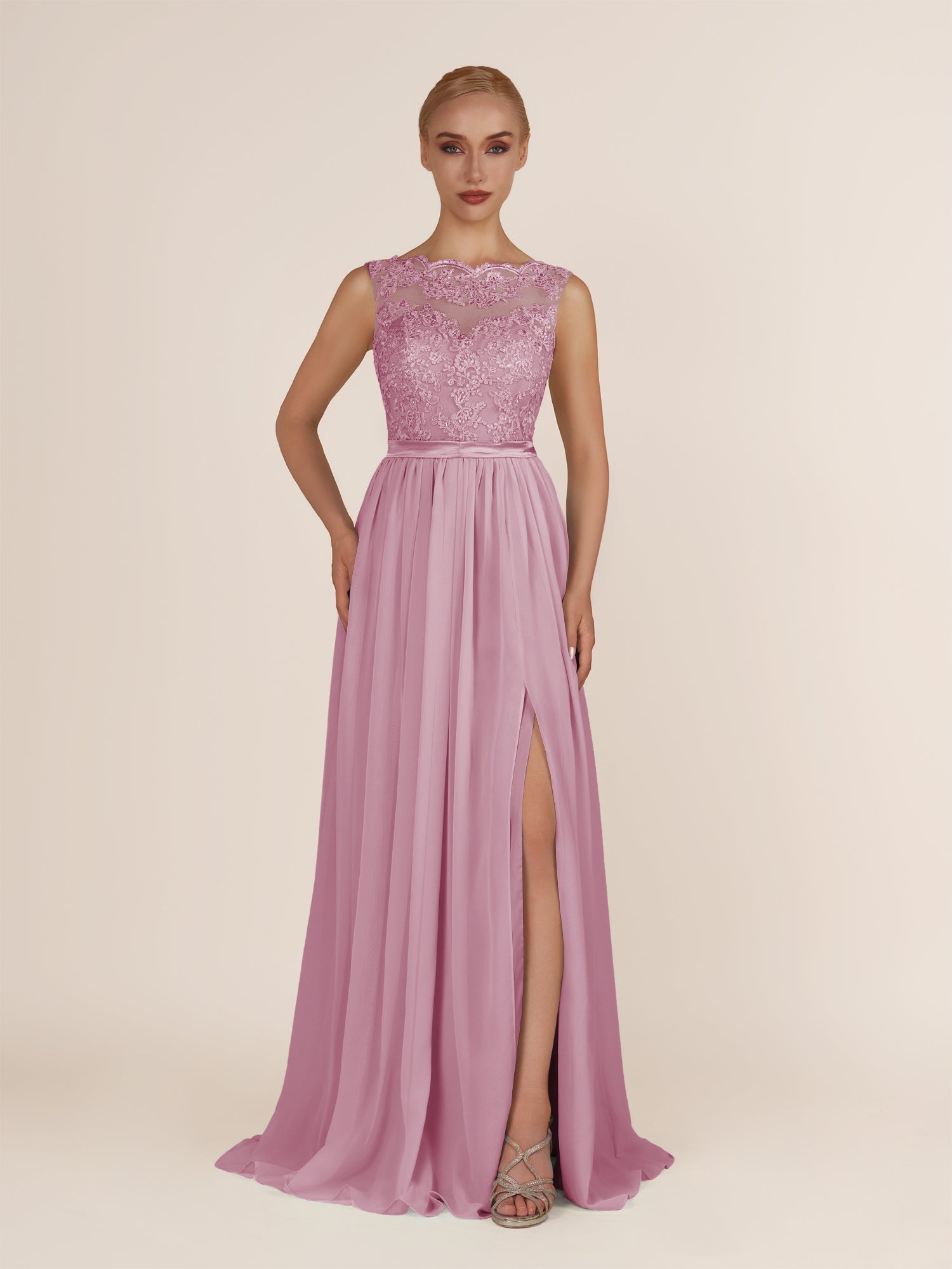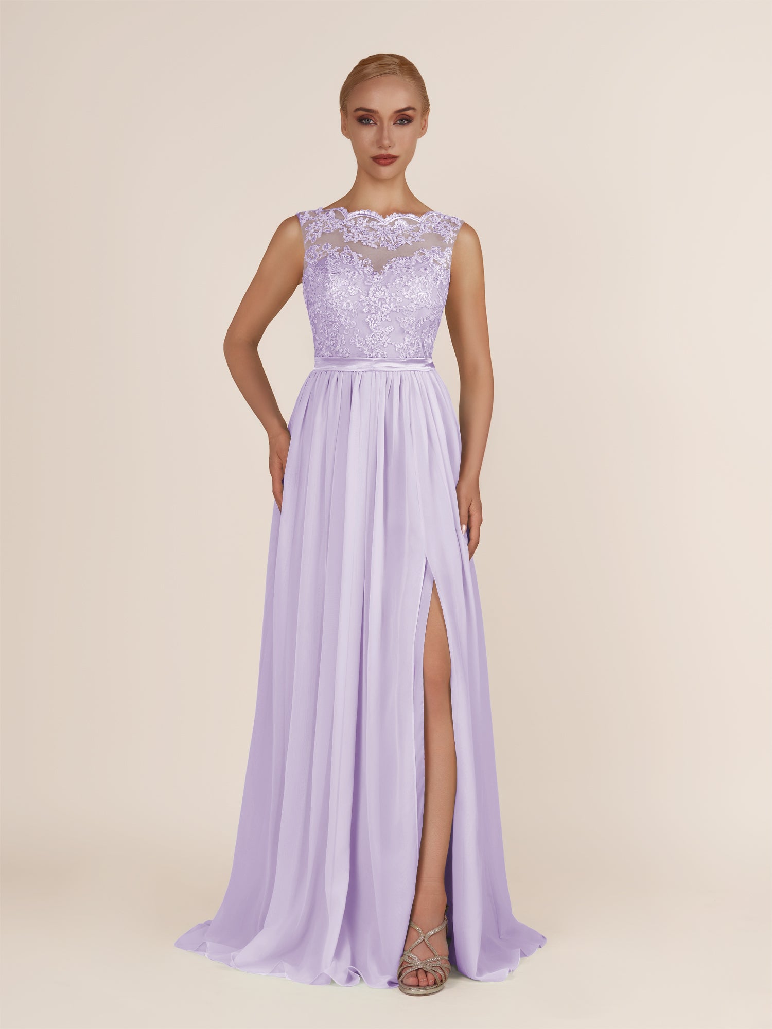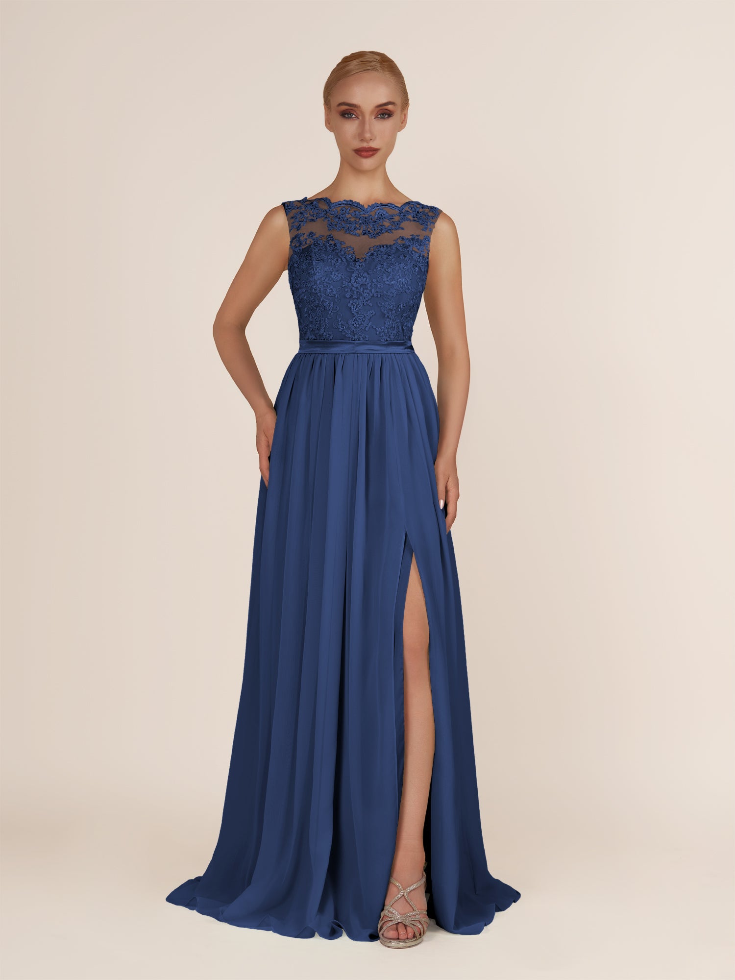 Sable | A-Line Illusion Neck Chiffon Long Bridesmaid Dress with Lace Appliques