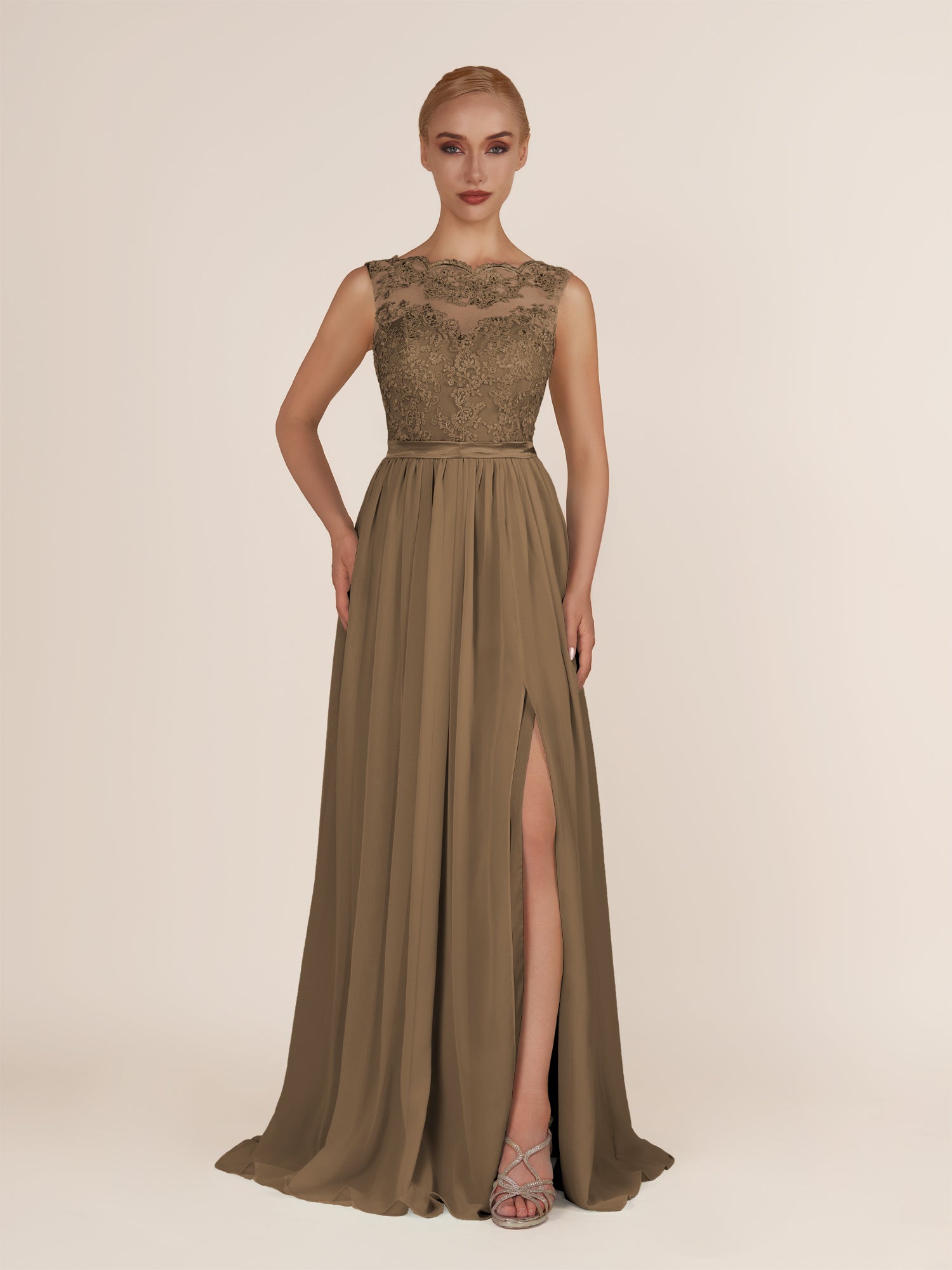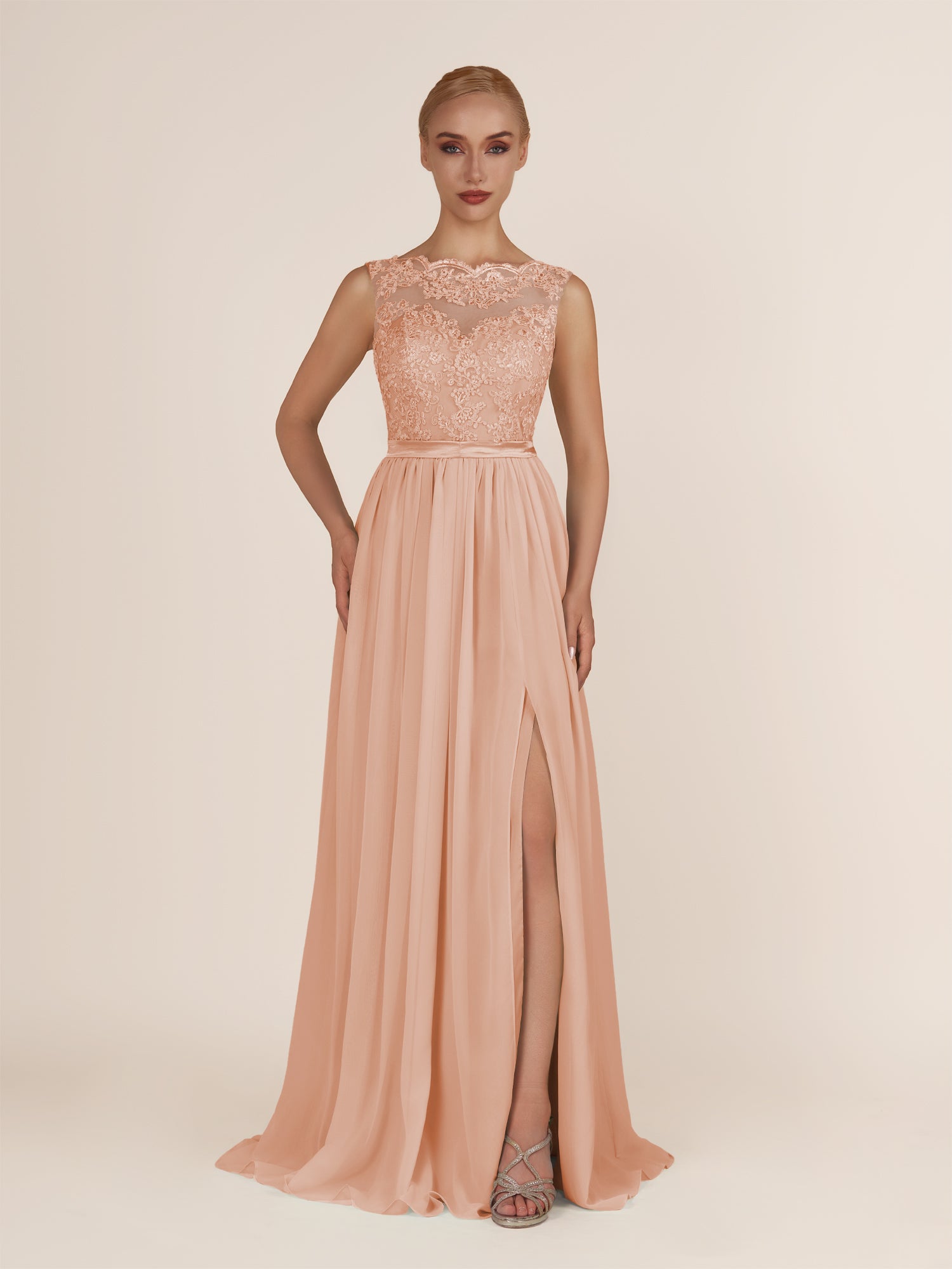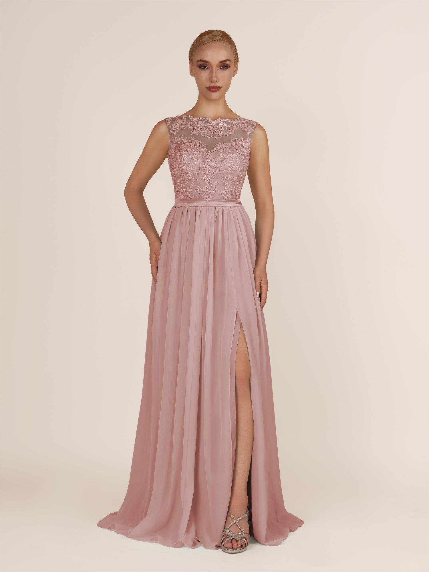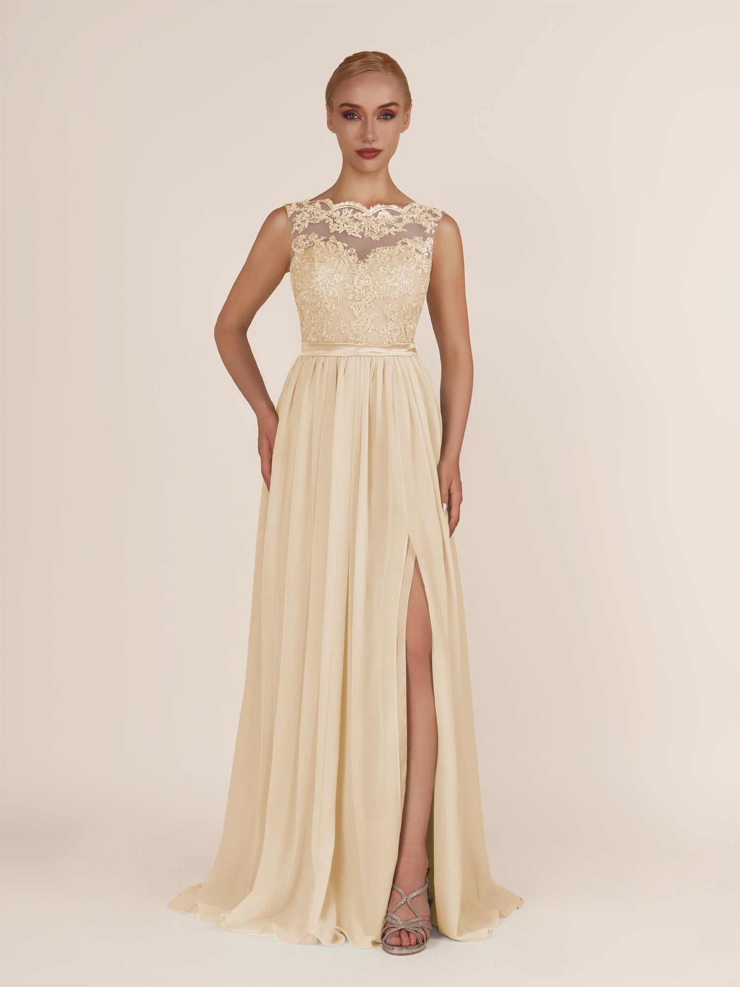 Sable | A-Line Illusion Neck Chiffon Long Bridesmaid Dress with Lace Appliques