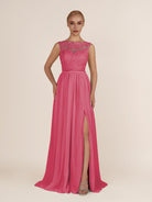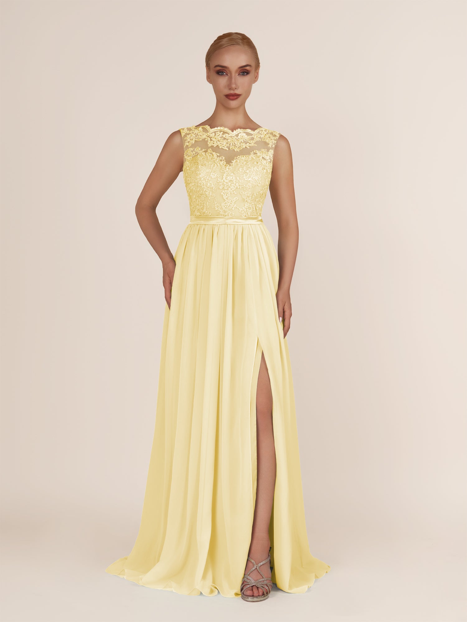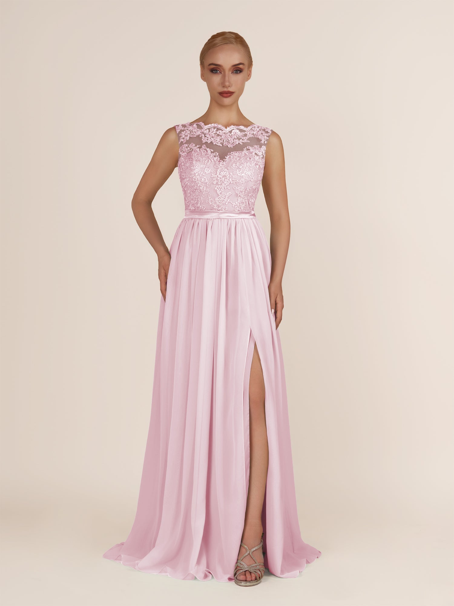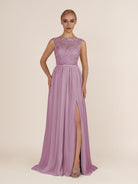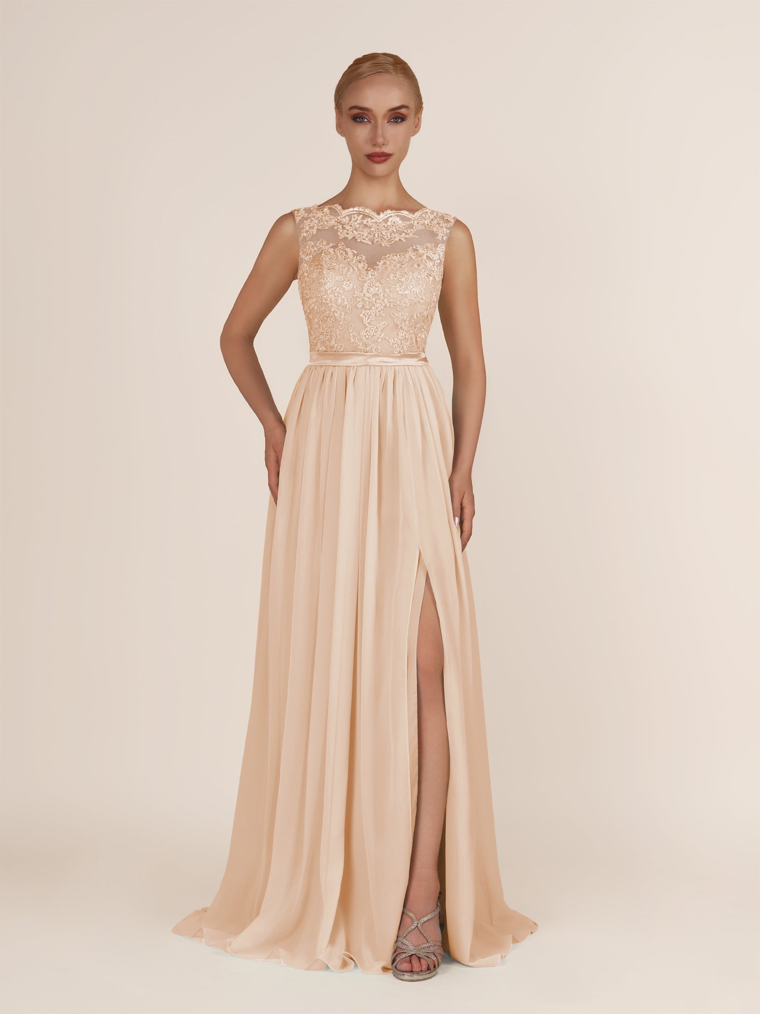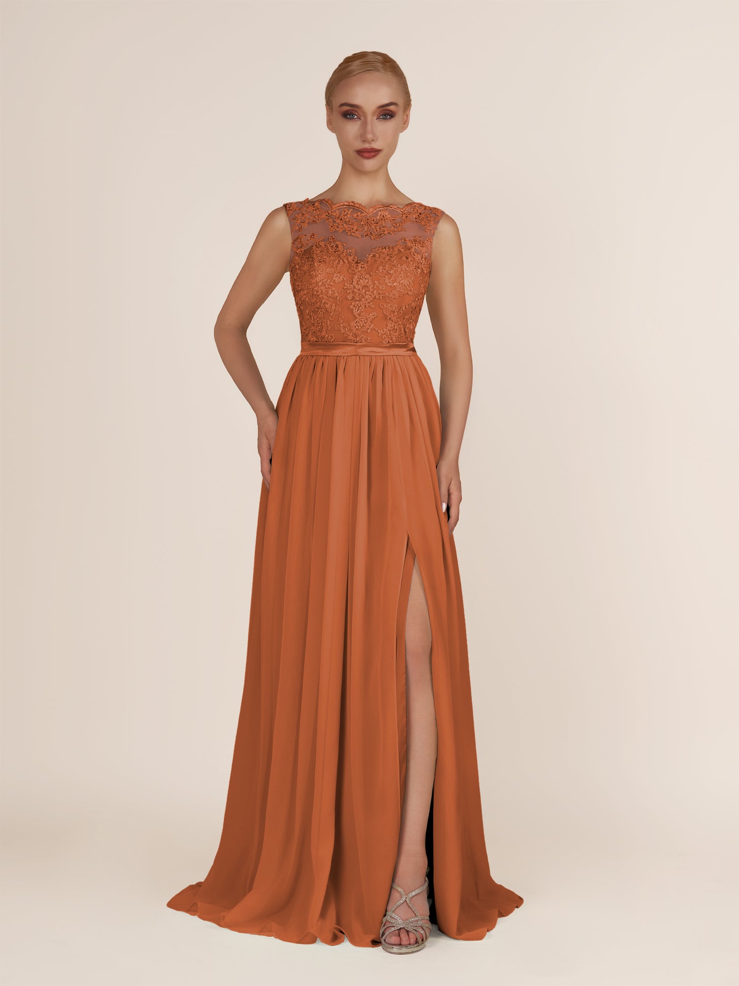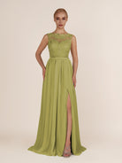 Sable | A-Line Illusion Neck Chiffon Long Bridesmaid Dress with Lace Appliques