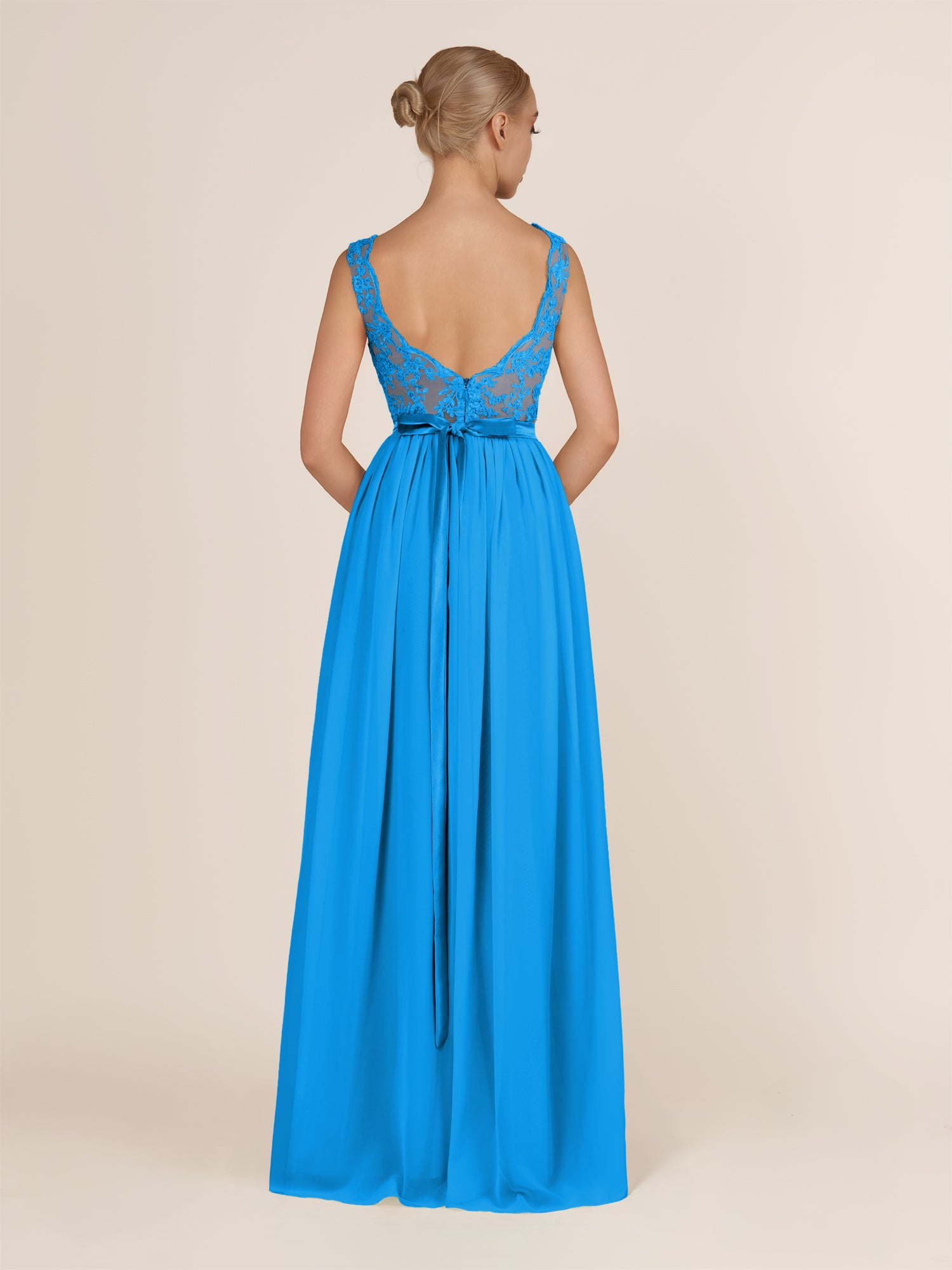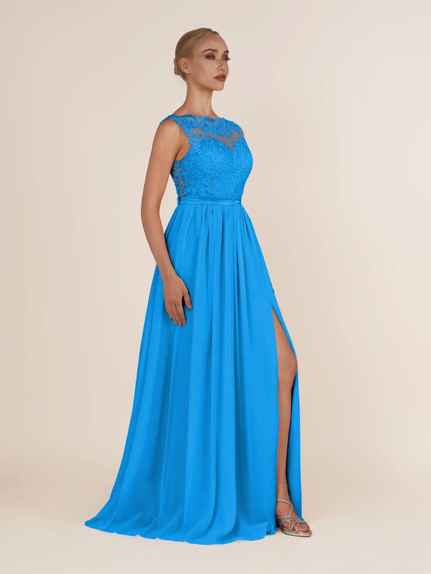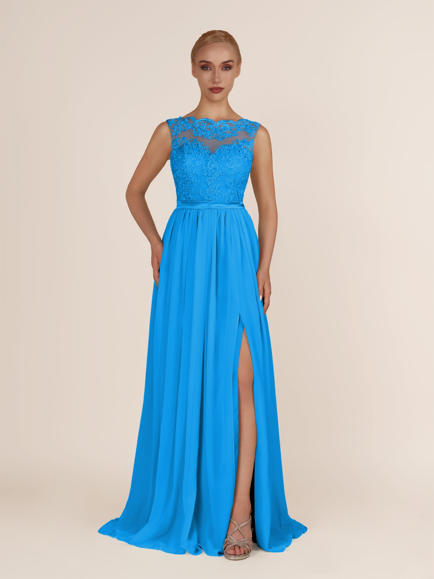 Elegant and refined, this airy chiffon bridesmaid dress features a sleek a line silhouette and a delicate illusion neckline. The sleeveless design offers a modern touch, while the lace appliques add a hint of romance and sophistication. Finished with a smooth zipper back and floor-length hem, it’s a graceful choice for weddings, receptions, or formal celebrations.