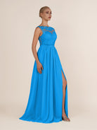 Sable | Blue Jay - A-Line Illusion Neck Chiffon Long Bridesmaid Dress with Lace Appliques