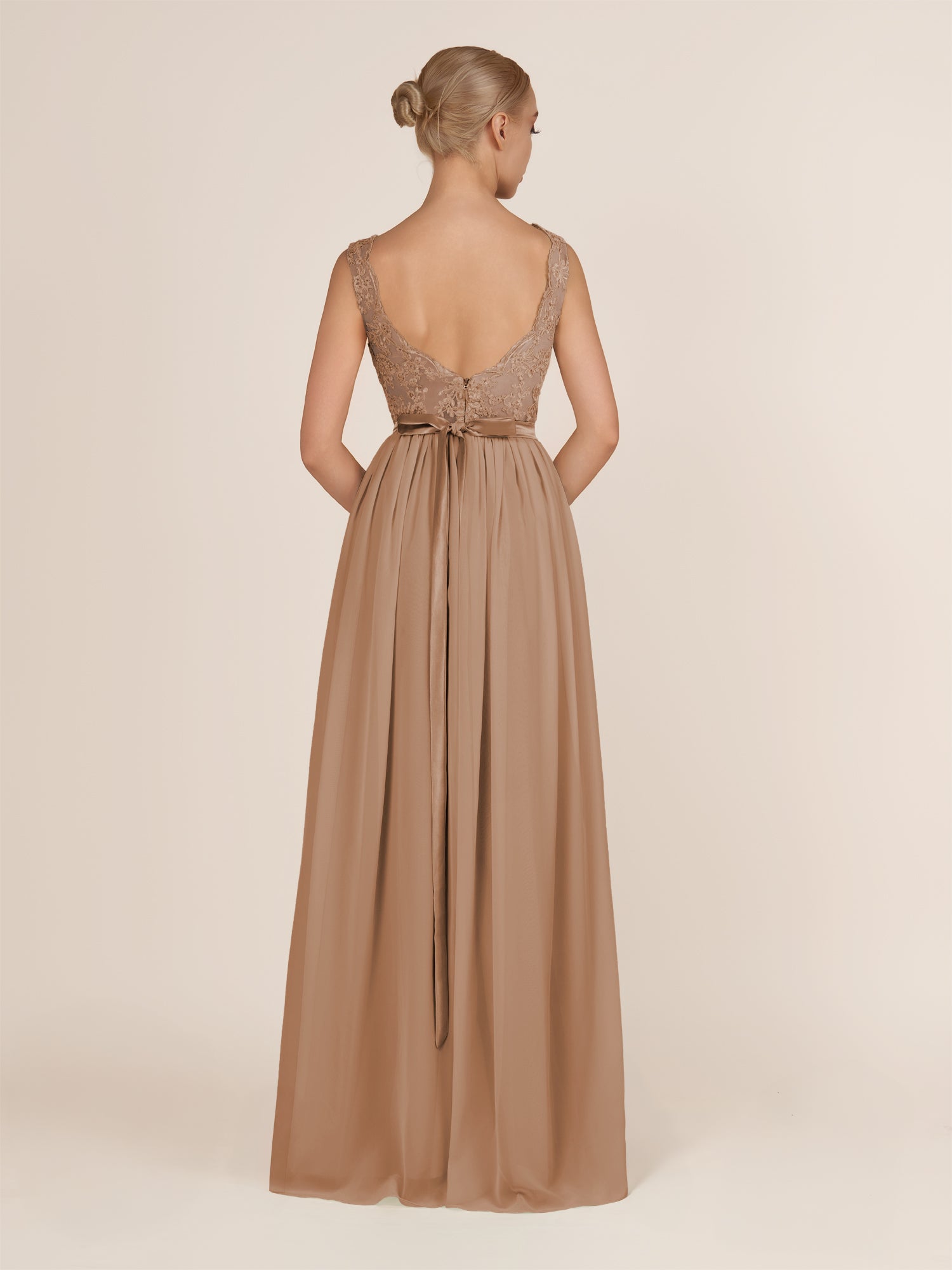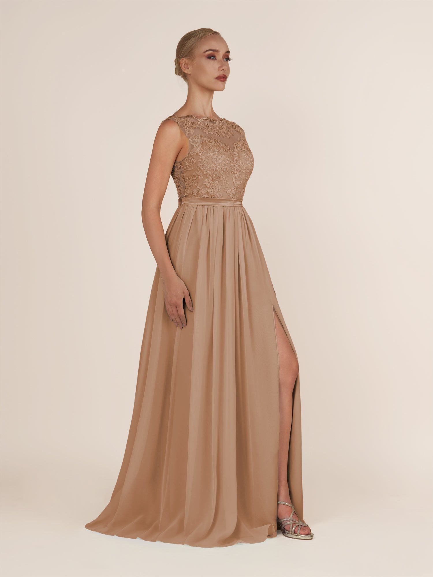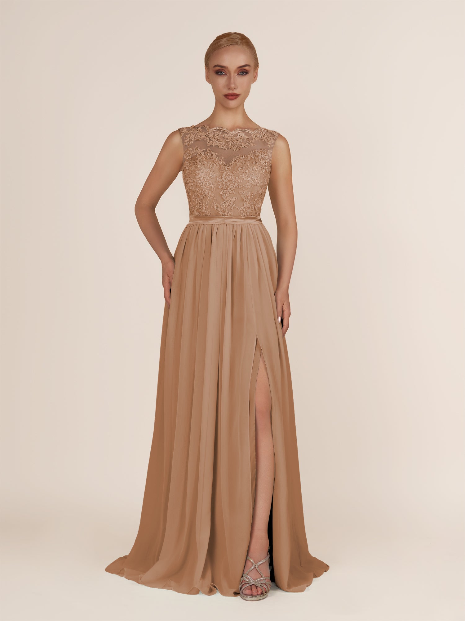 Sable | Bronzer - A-Line Illusion Neck Chiffon Long Bridesmaid Dress with Lace Appliques
