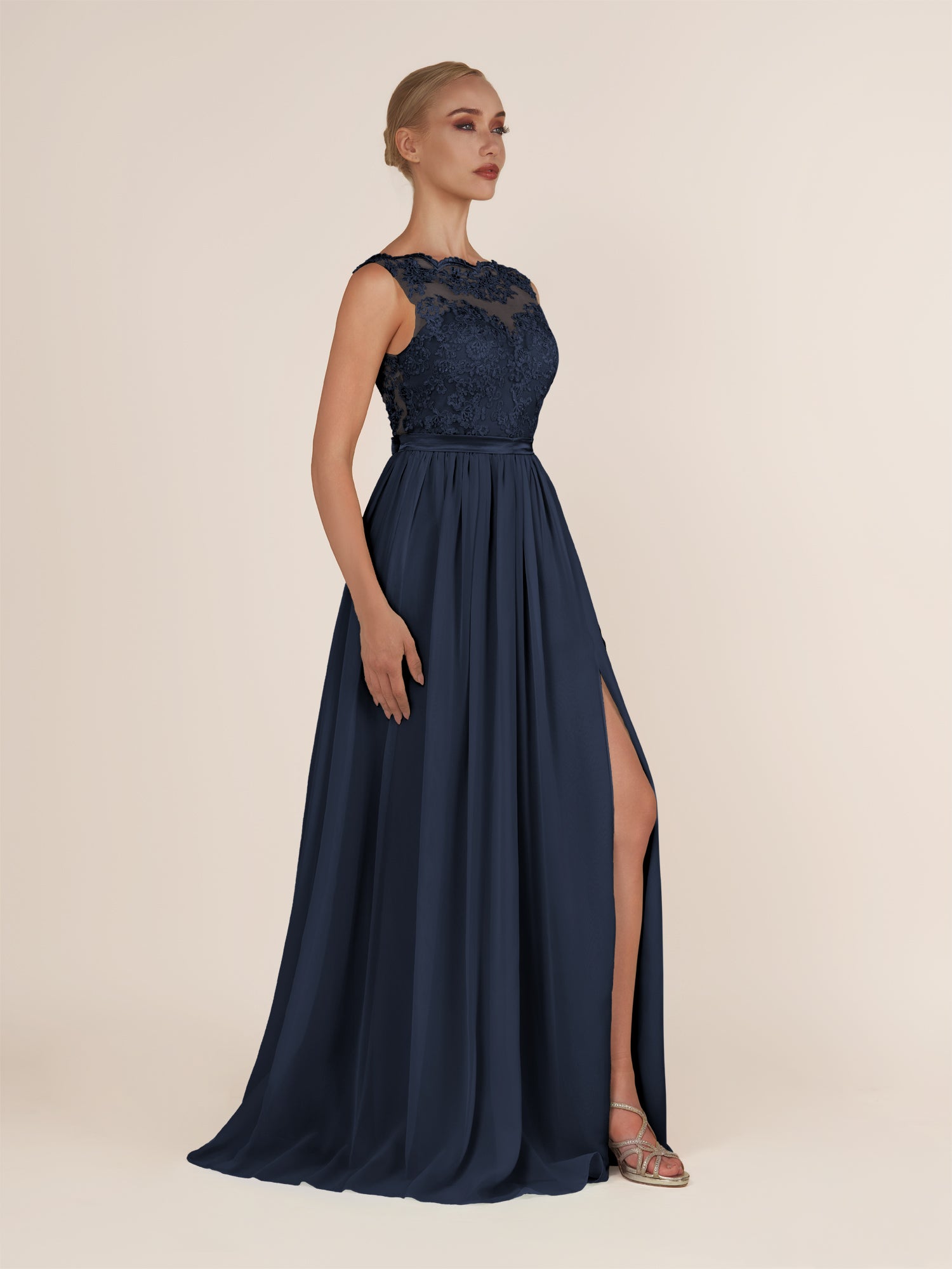 Sable | Dark Navy - A-Line Illusion Neck Chiffon Long Bridesmaid Dress with Lace Appliques
