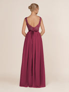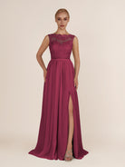 Elegant and refined, this airy chiffon bridesmaid dress features a sleek a line silhouette and a delicate illusion neckline. The sleeveless design offers a modern touch, while the lace appliques add a hint of romance and sophistication. Finished with a smooth zipper back and floor-length hem, it’s a graceful choice for weddings, receptions, or formal celebrations.