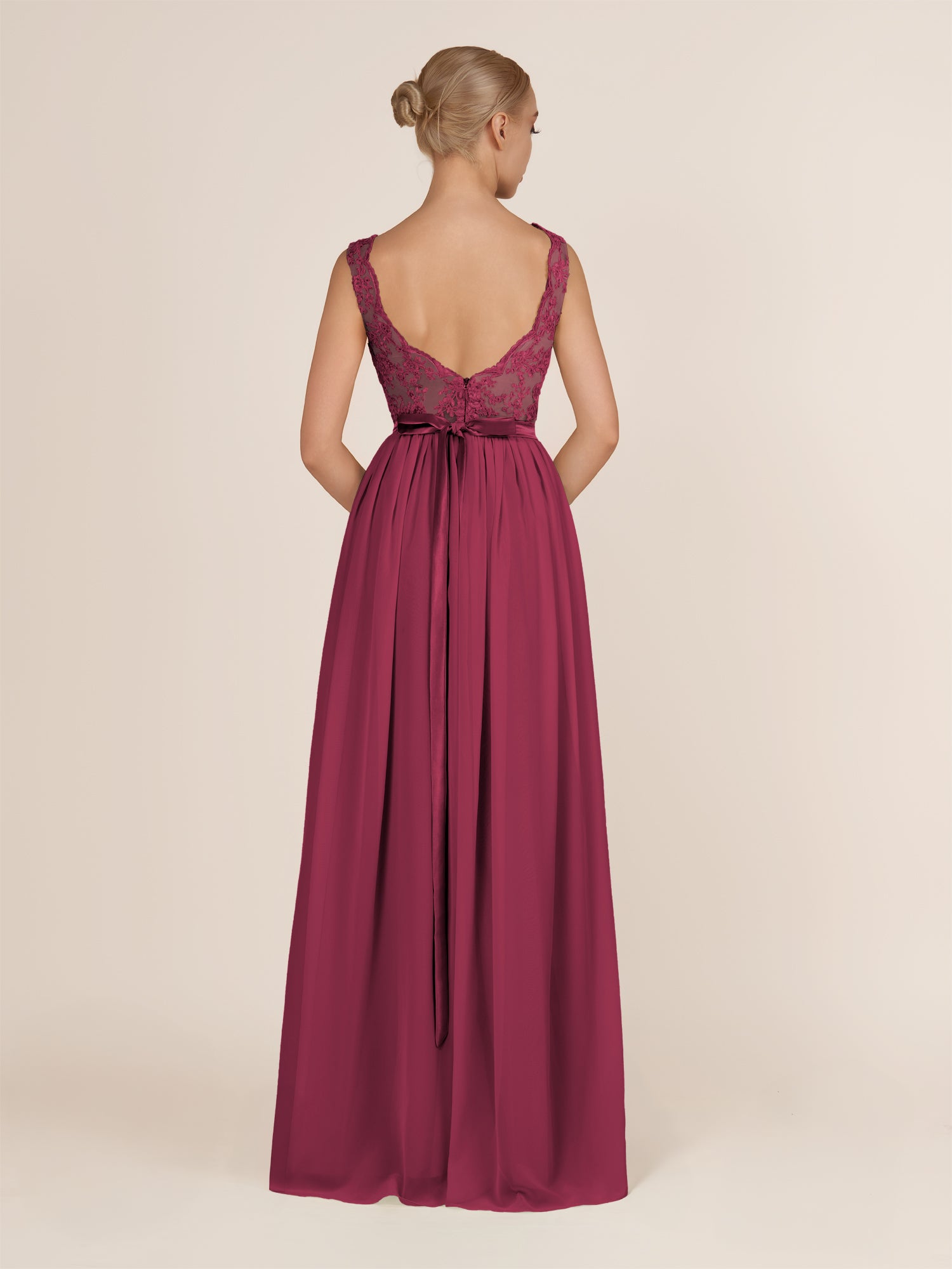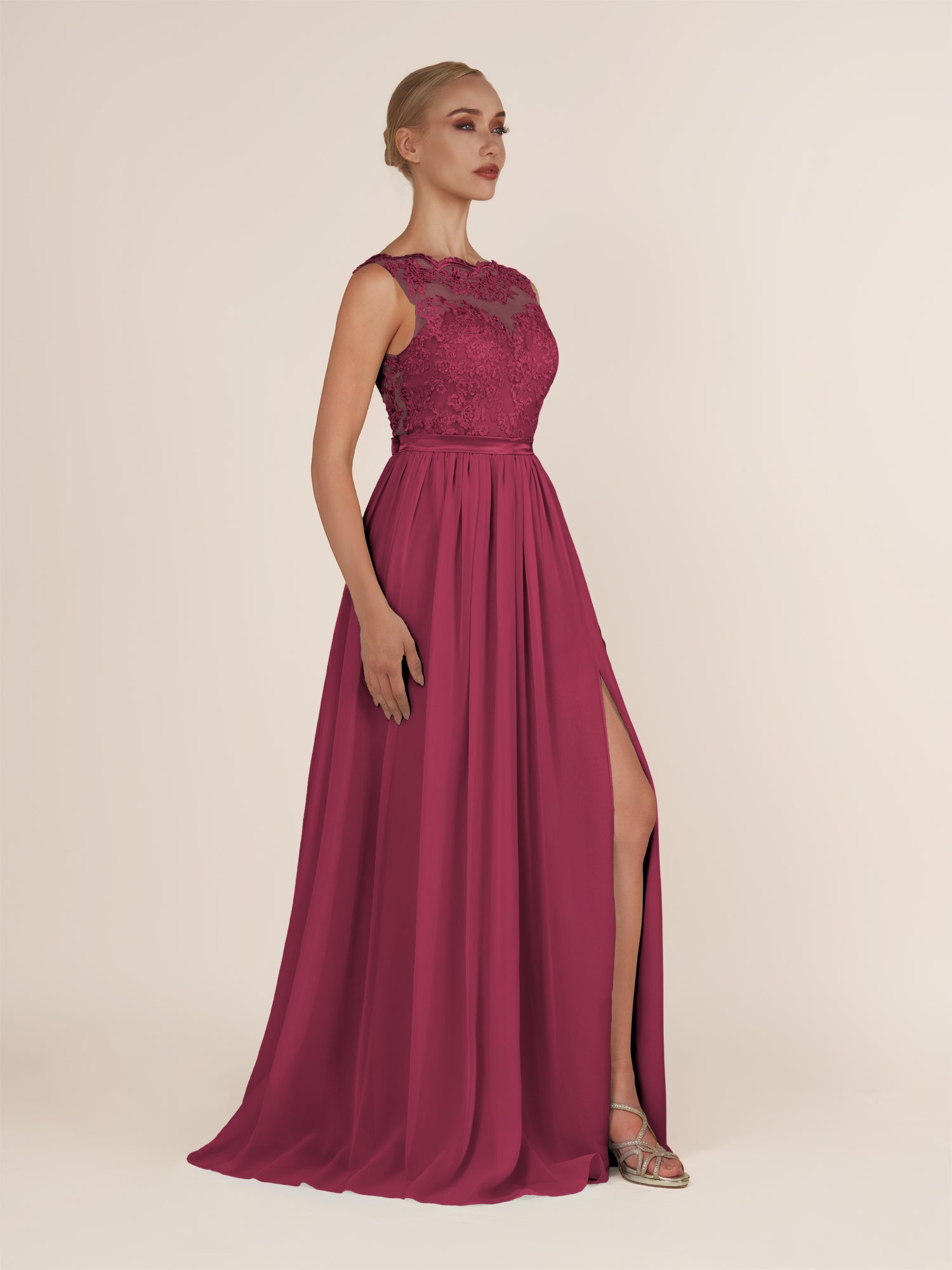 Sable | Desert Rose - A-Line Illusion Neck Chiffon Long Bridesmaid Dress with Lace Appliques
