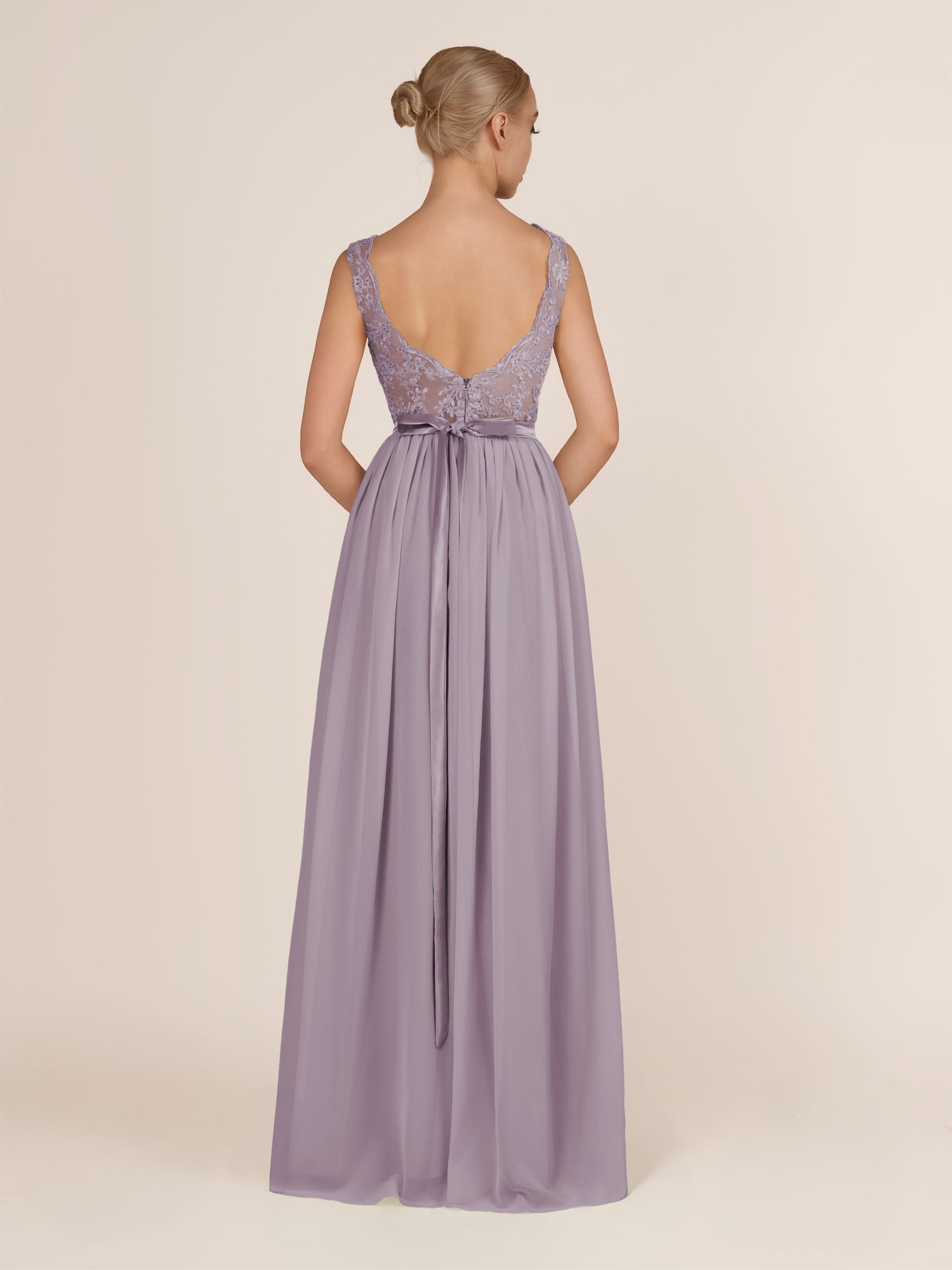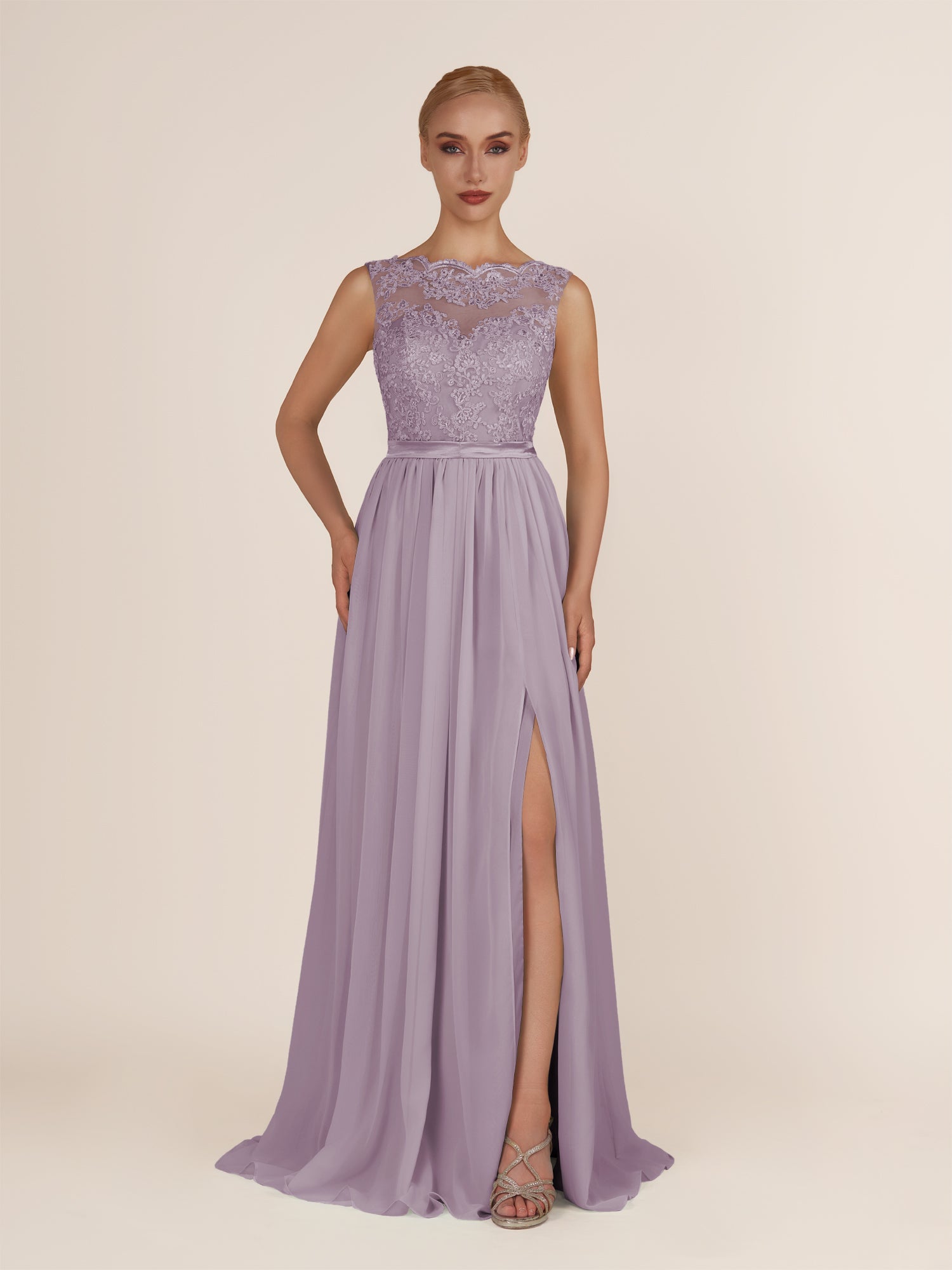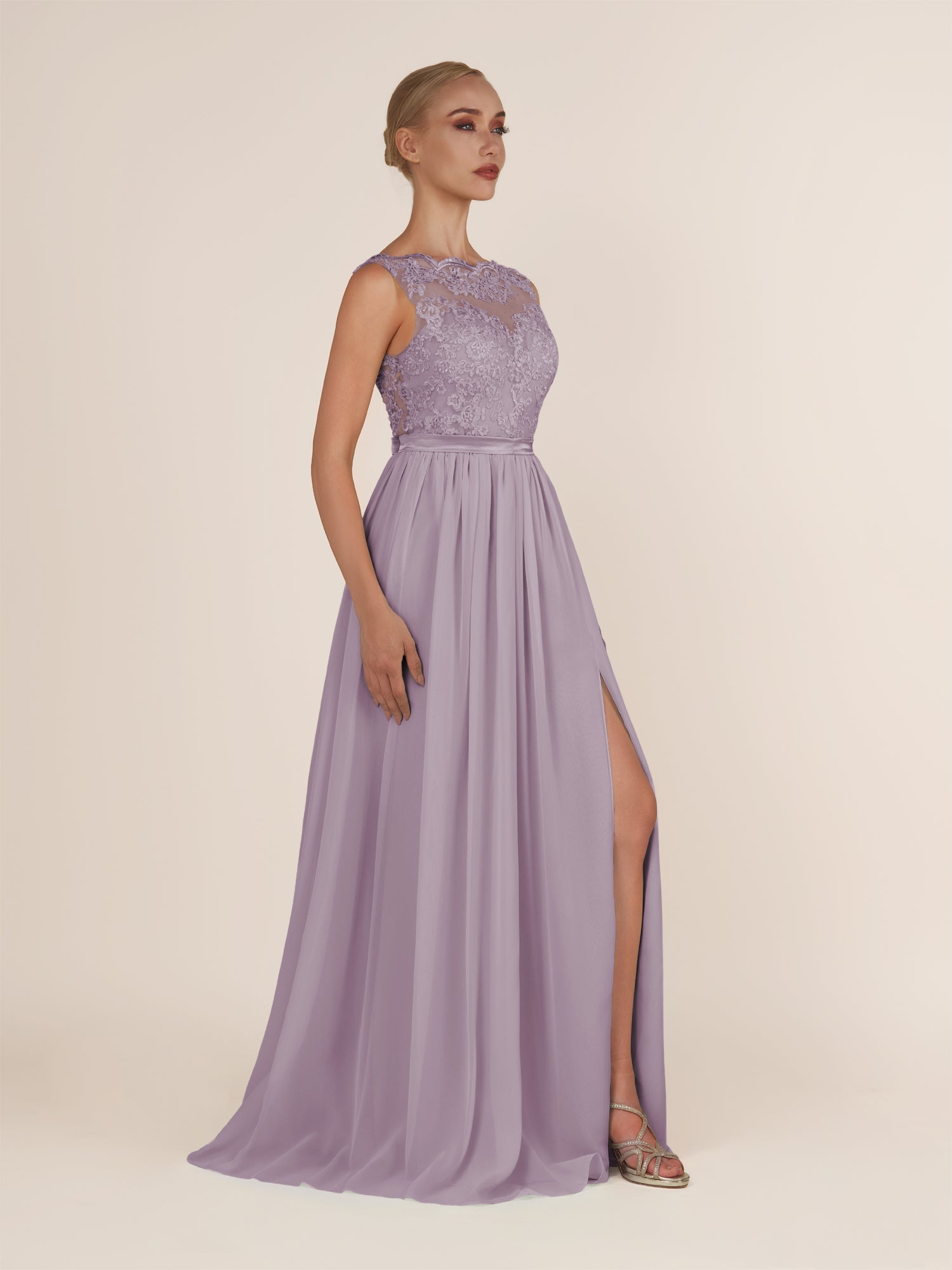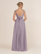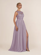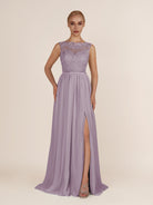Elegant and refined, this airy chiffon bridesmaid dress features a sleek a line silhouette and a delicate illusion neckline. The sleeveless design offers a modern touch, while the lace appliques add a hint of romance and sophistication. Finished with a smooth zipper back and floor-length hem, it’s a graceful choice for weddings, receptions, or formal celebrations.