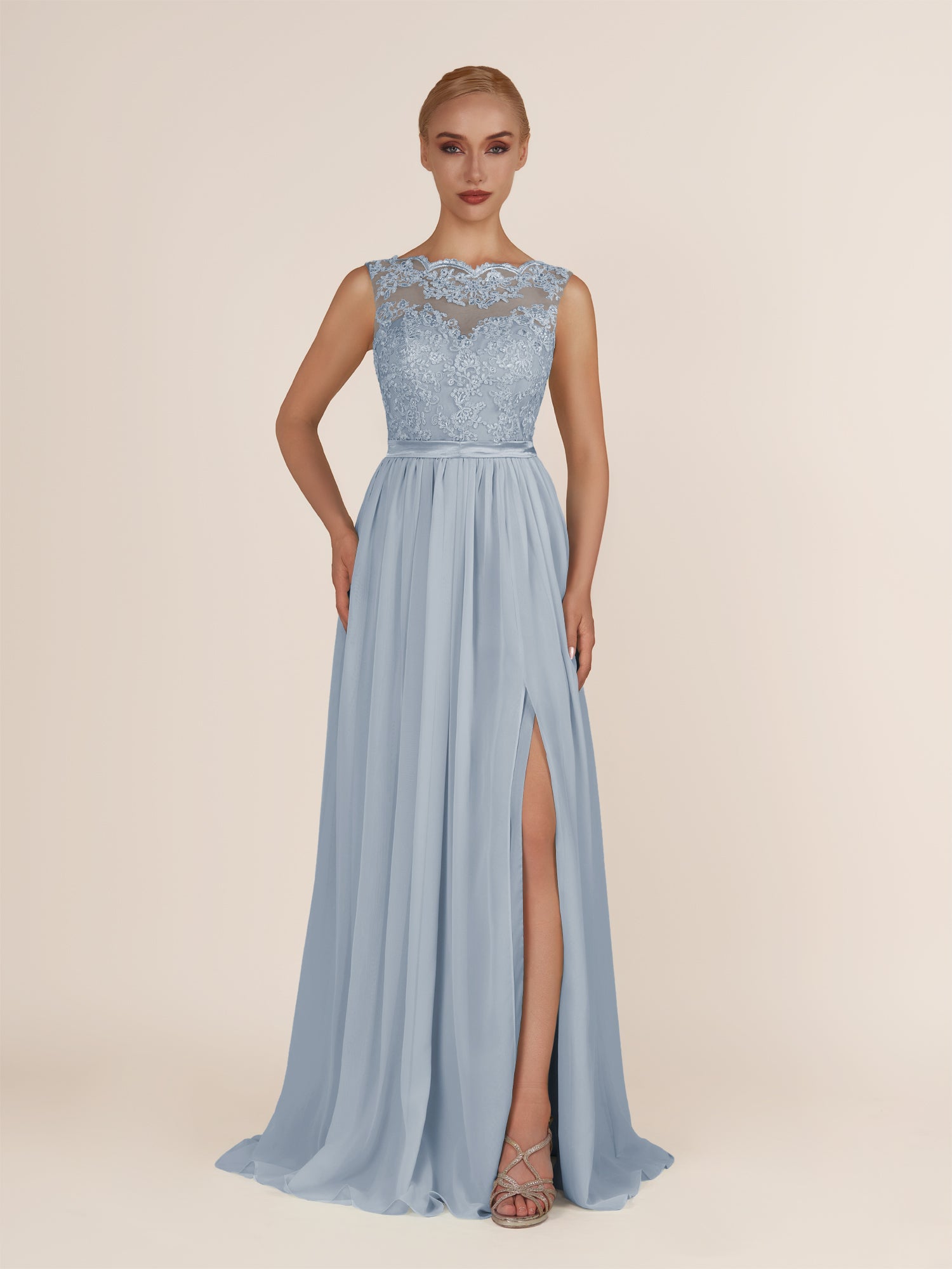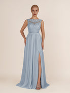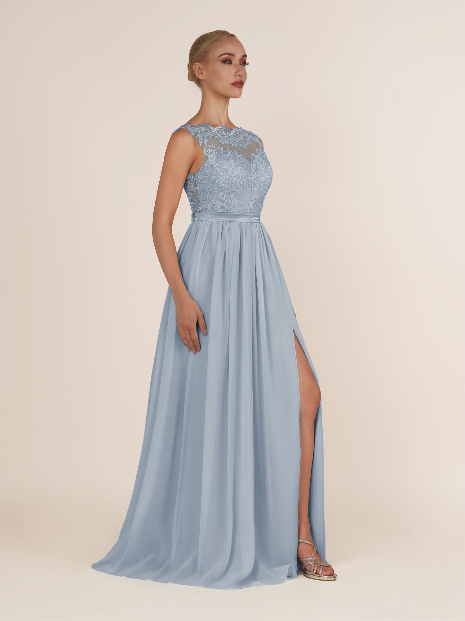 Sable | Dusty Blue - A-Line Illusion Neck Chiffon Long Bridesmaid Dress with Lace Appliques
