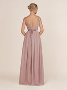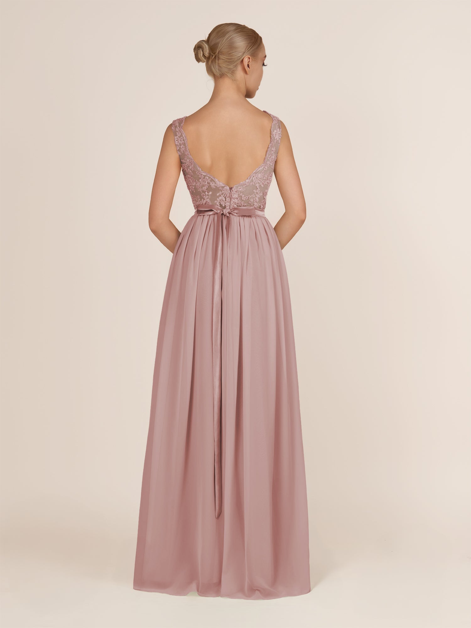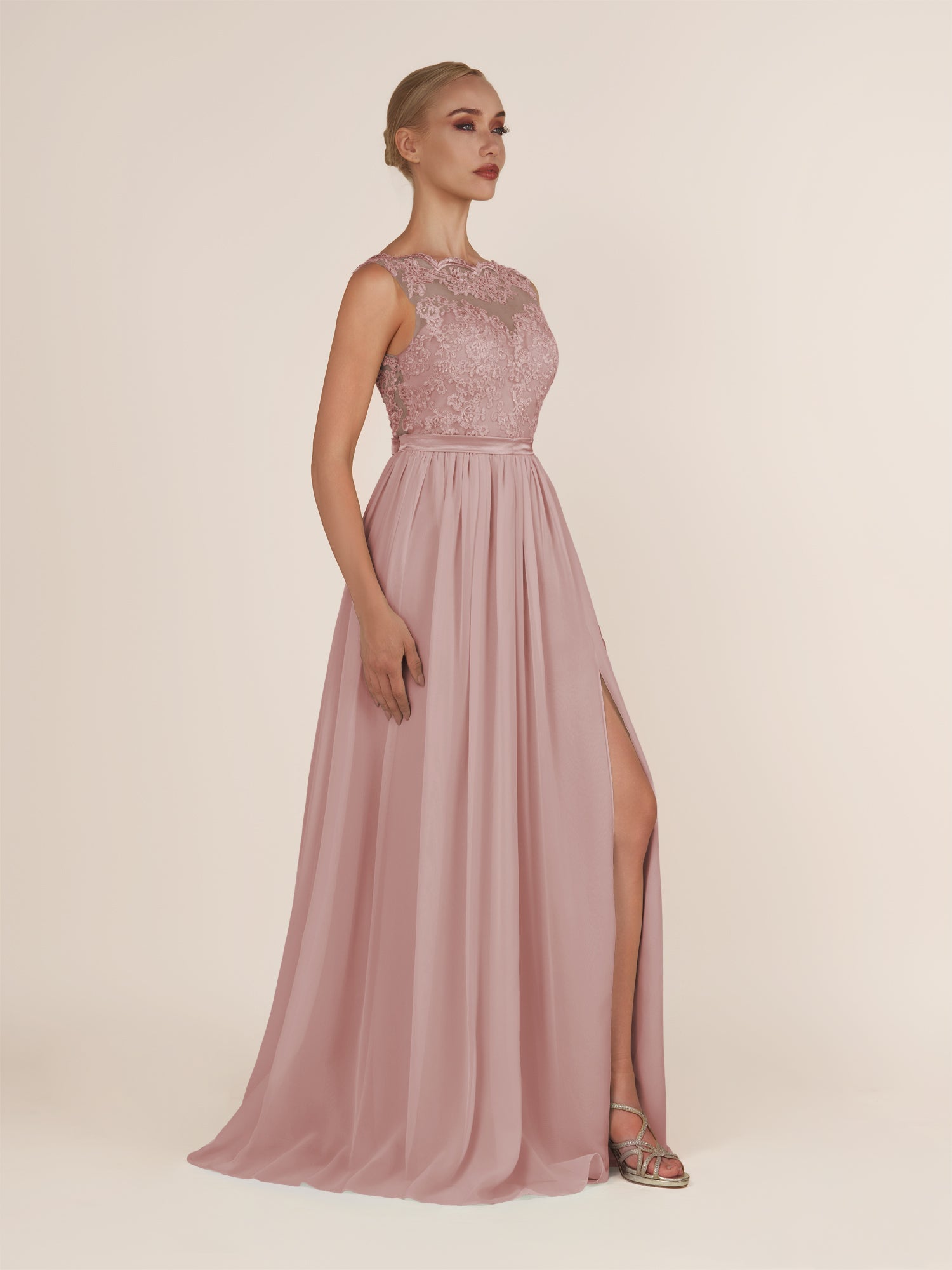 Sable | Dusty Rose - A-Line Illusion Neck Chiffon Long Bridesmaid Dress with Lace Appliques