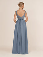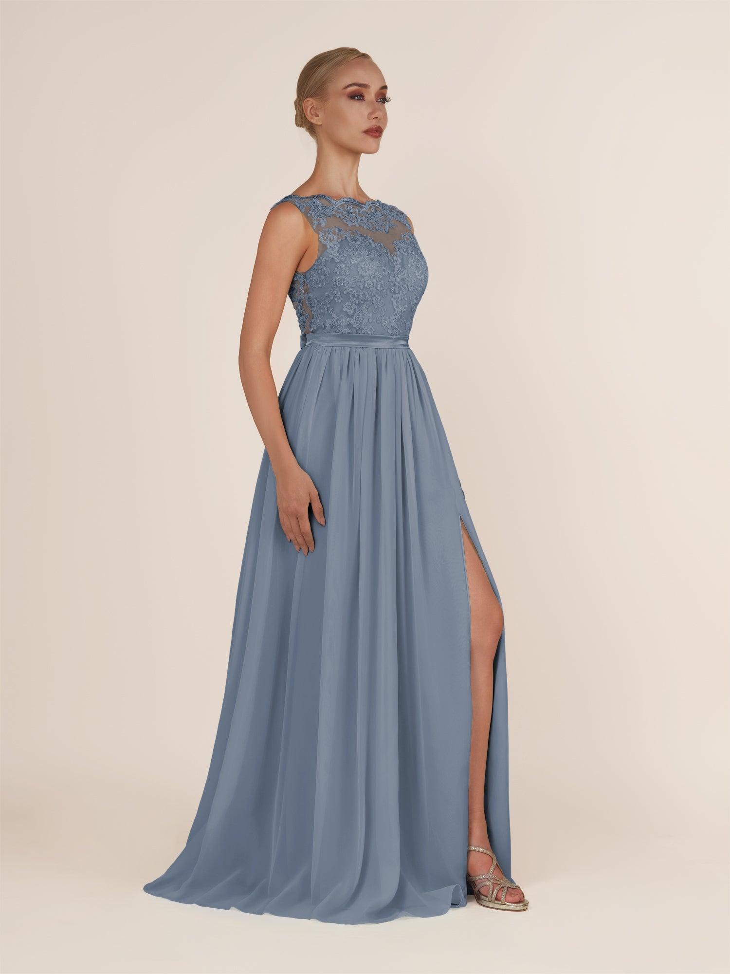 Elegant and refined, this airy chiffon bridesmaid dress features a sleek a line silhouette and a delicate illusion neckline. The sleeveless design offers a modern touch, while the lace appliques add a hint of romance and sophistication. Finished with a smooth zipper back and floor-length hem, it’s a graceful choice for weddings, receptions, or formal celebrations.