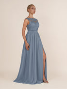 Sable | Neptune - A-Line Illusion Neck Chiffon Long Bridesmaid Dress with Lace Appliques