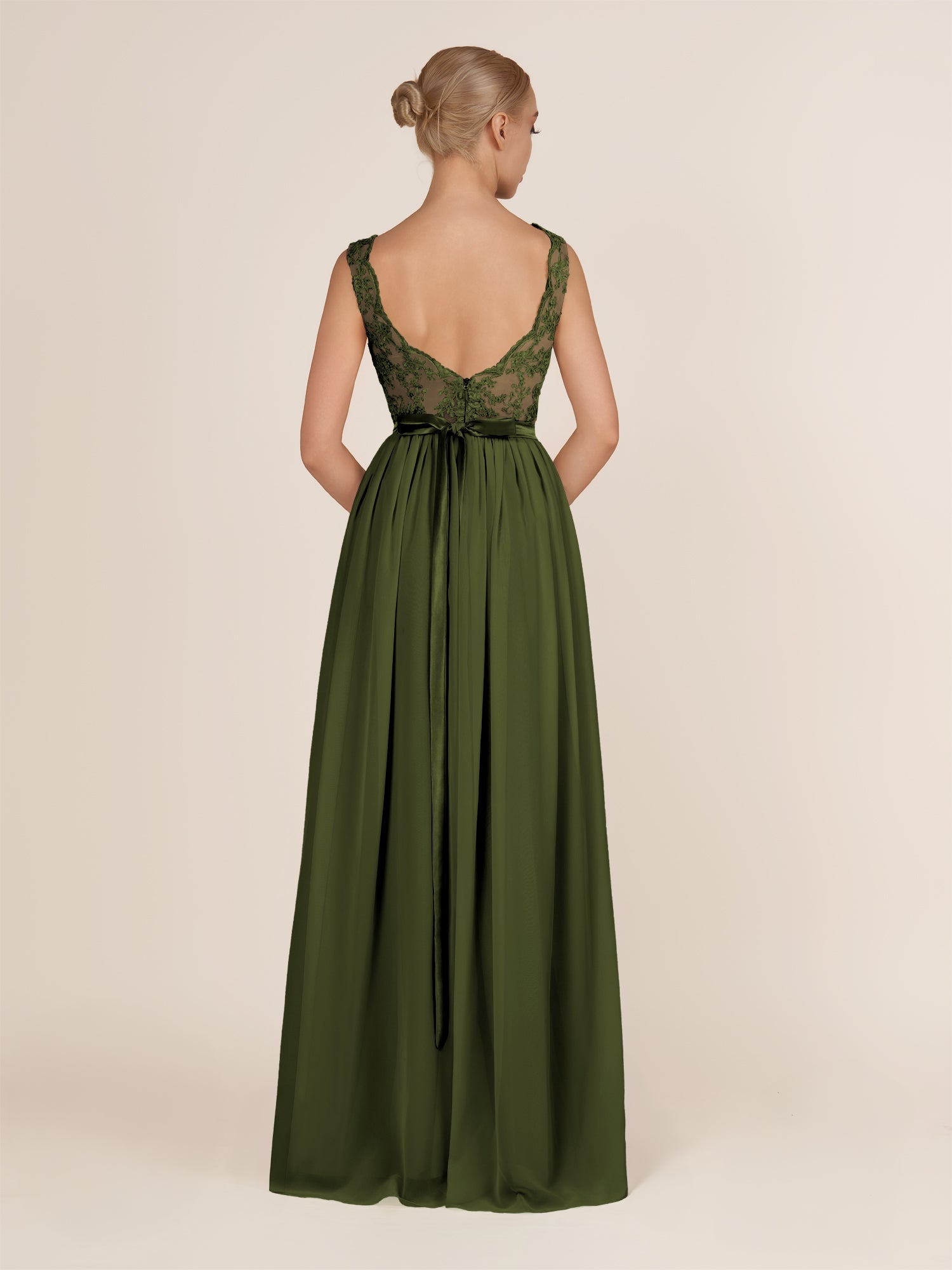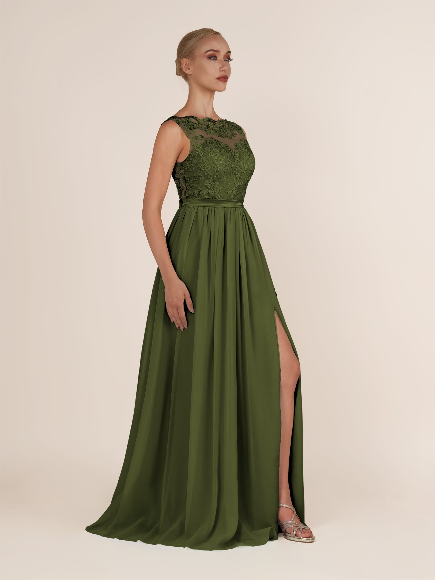 Sable | Olive - A-Line Illusion Neck Chiffon Long Bridesmaid Dress with Lace Appliques