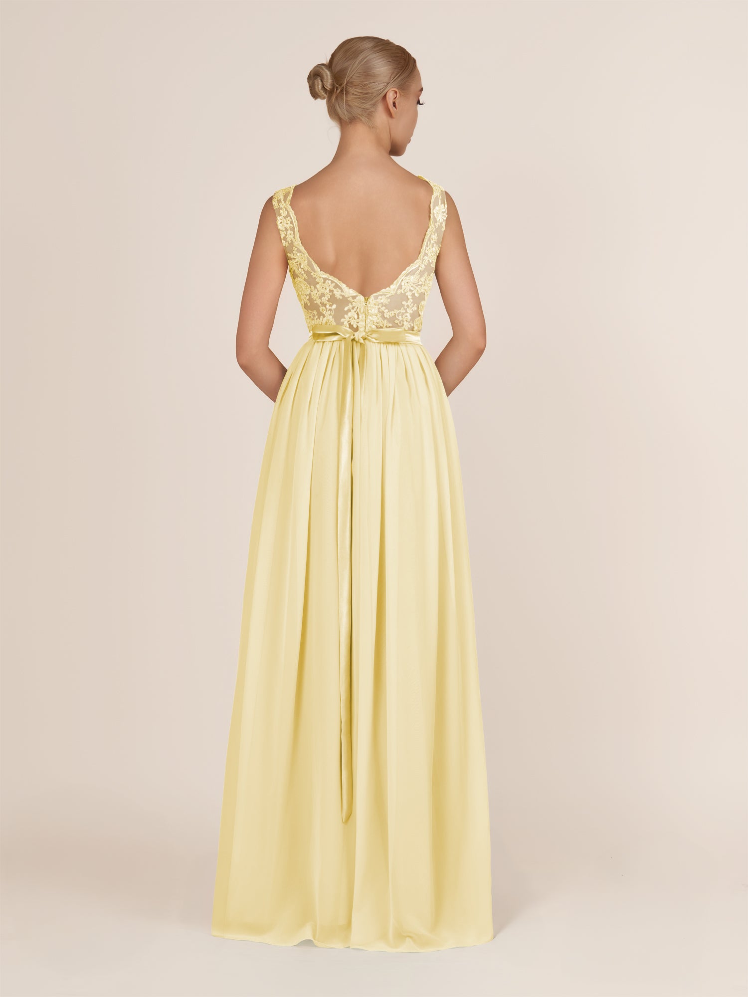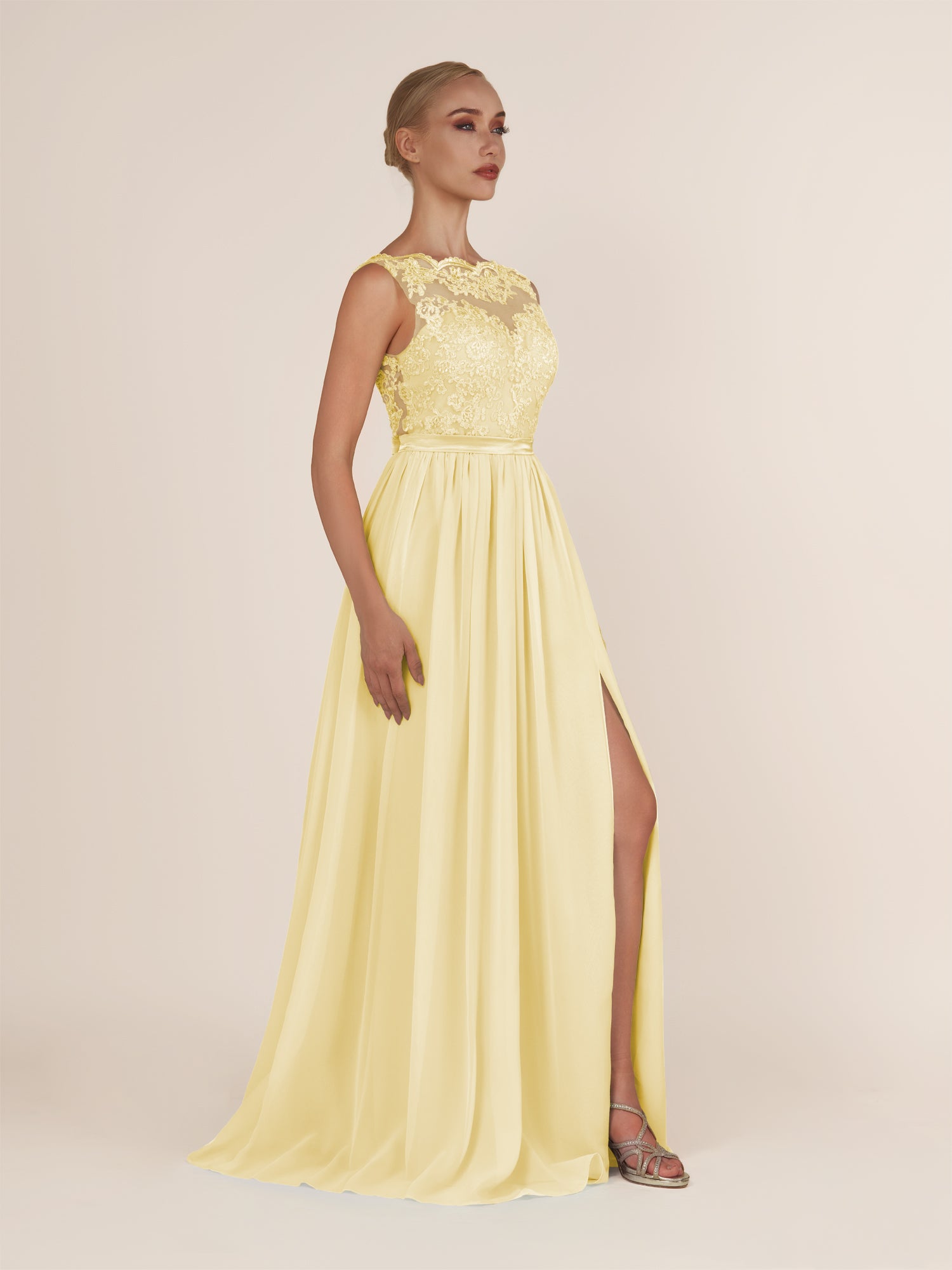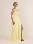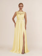 Sable | Pastel Yellow - A-Line Illusion Neck Chiffon Long Bridesmaid Dress with Lace Appliques
