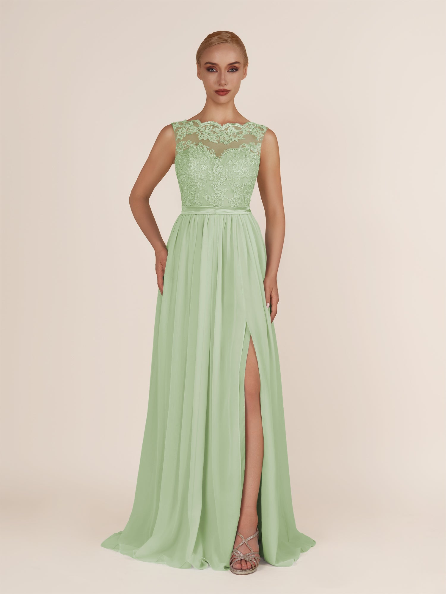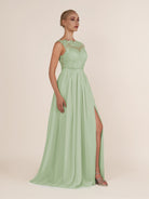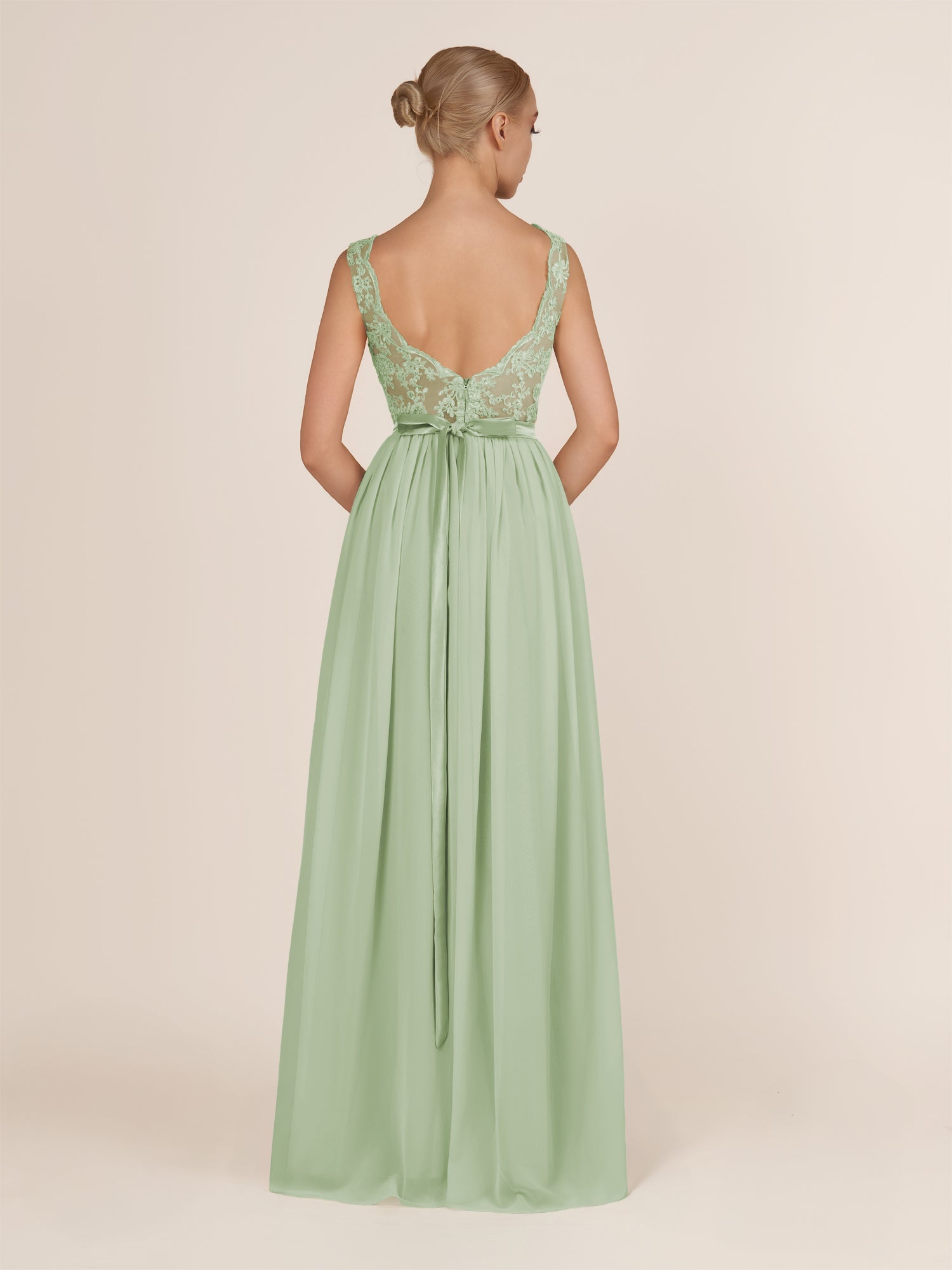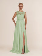 Sable | Sage - A-Line Illusion Neck Chiffon Long Bridesmaid Dress with Lace Appliques
