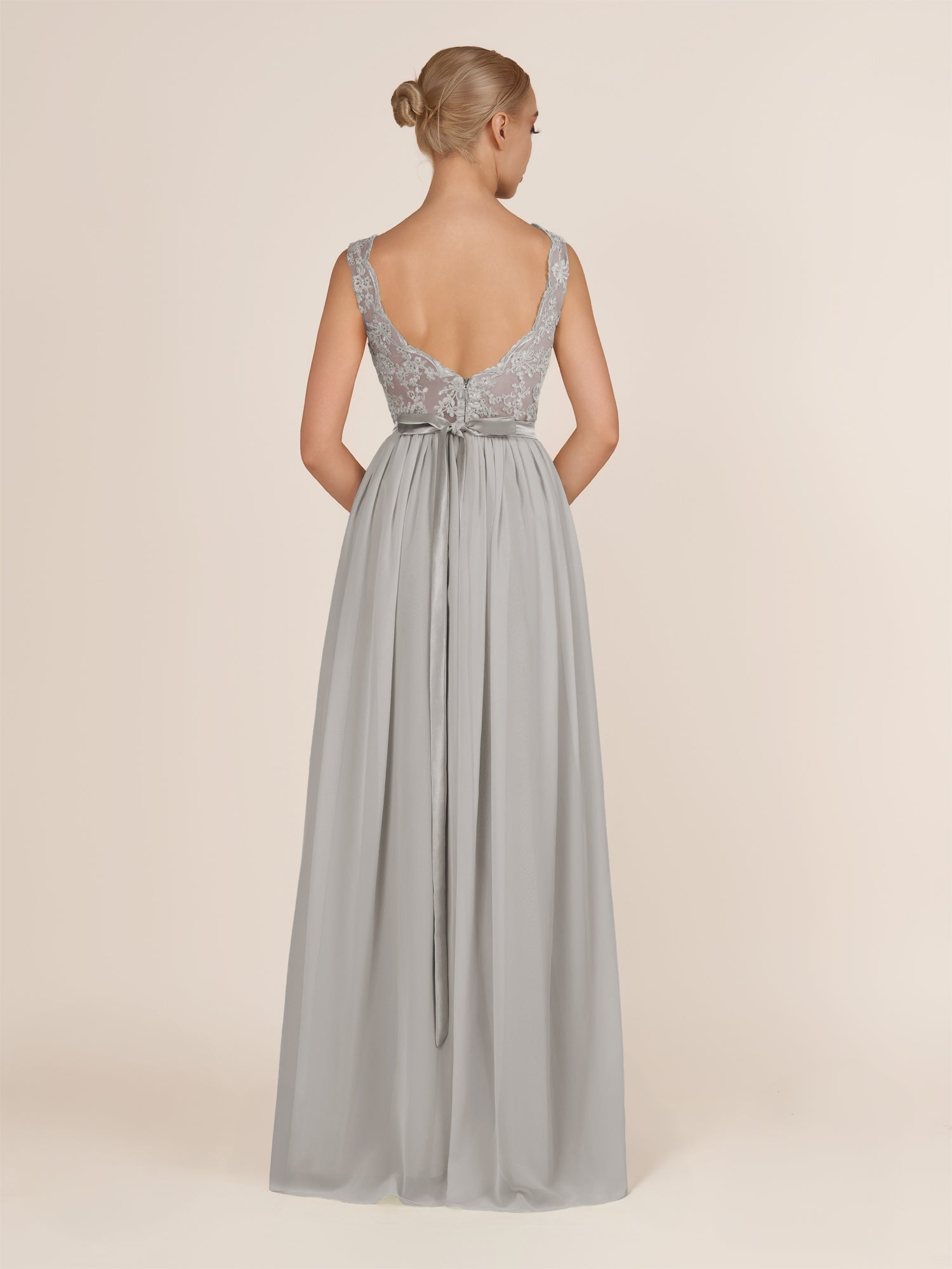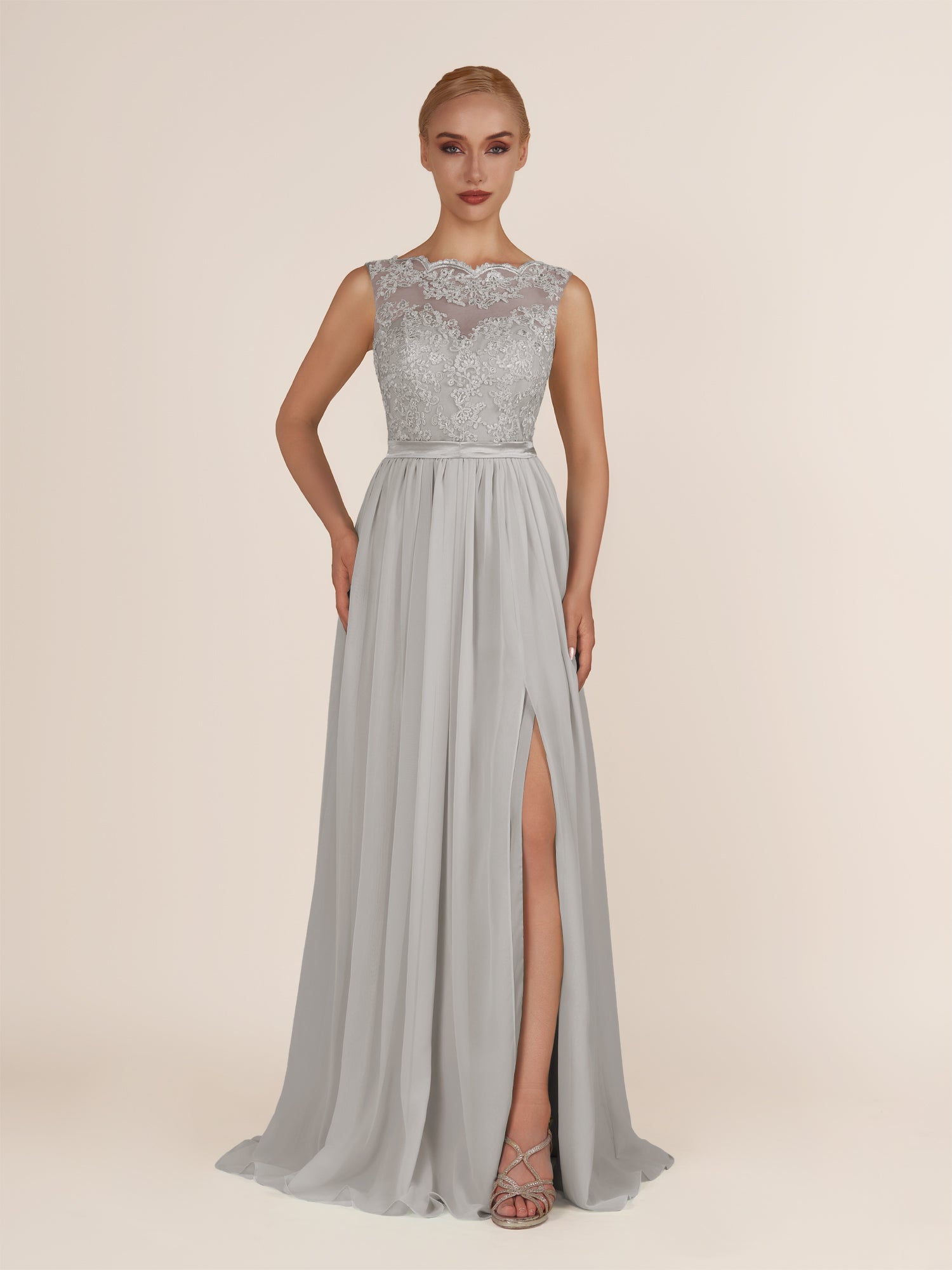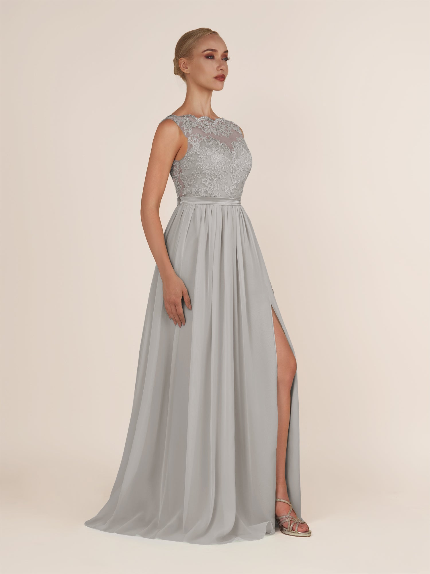Sable | Silver - A-Line Illusion Neck Chiffon Long Bridesmaid Dress with Lace Appliques