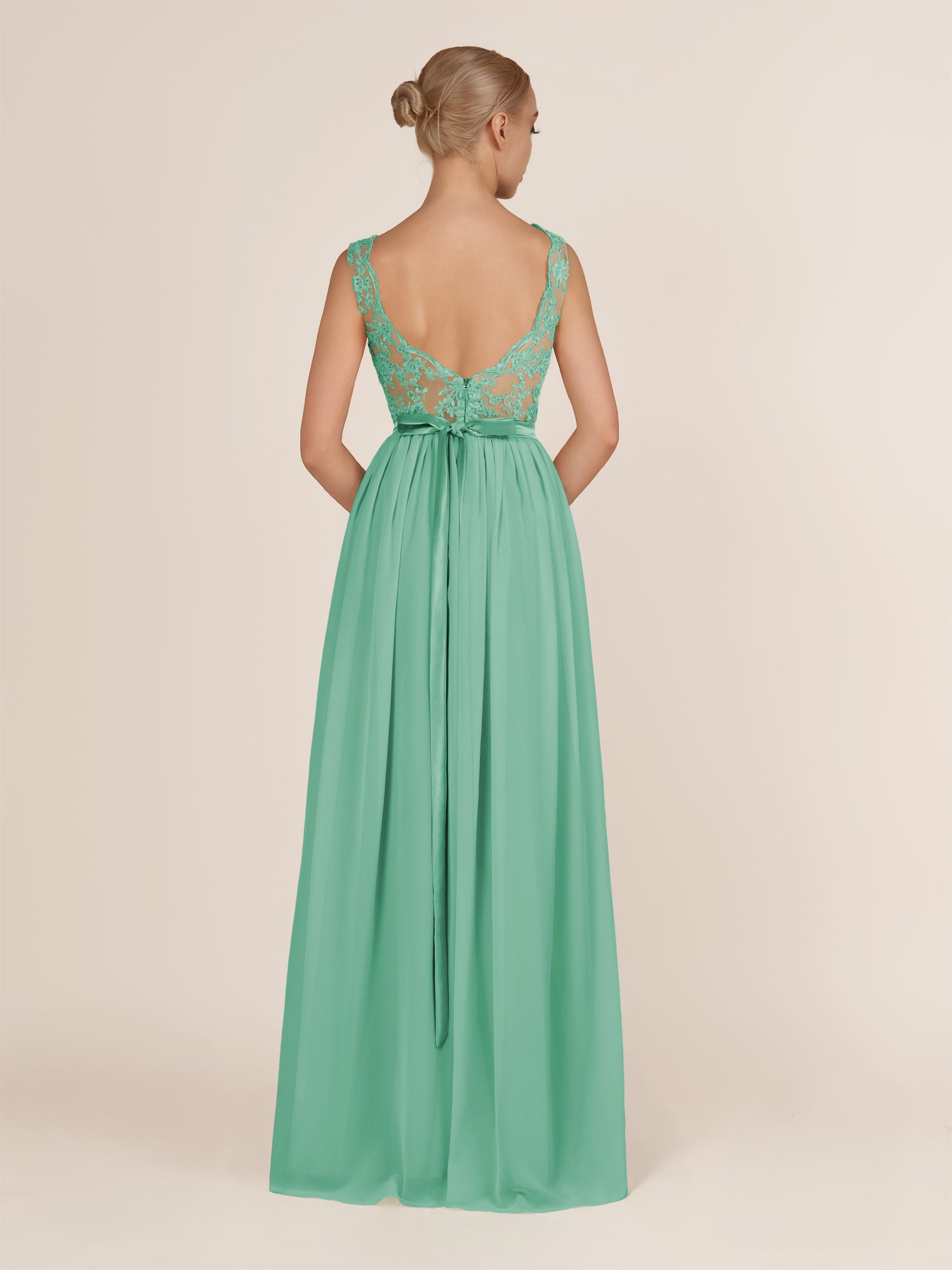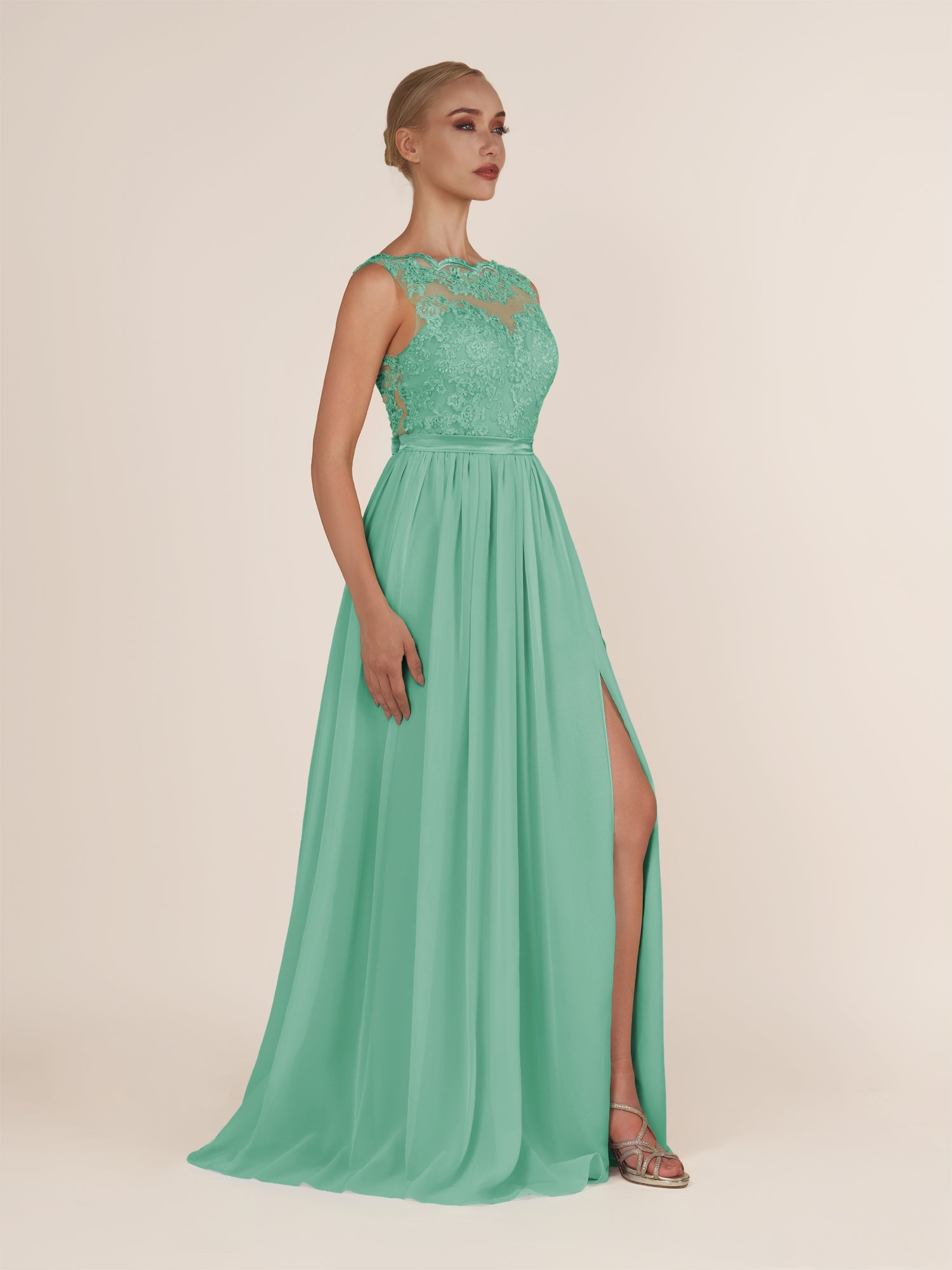 Sable | Turquoise - A-Line Illusion Neck Chiffon Long Bridesmaid Dress with Lace Appliques