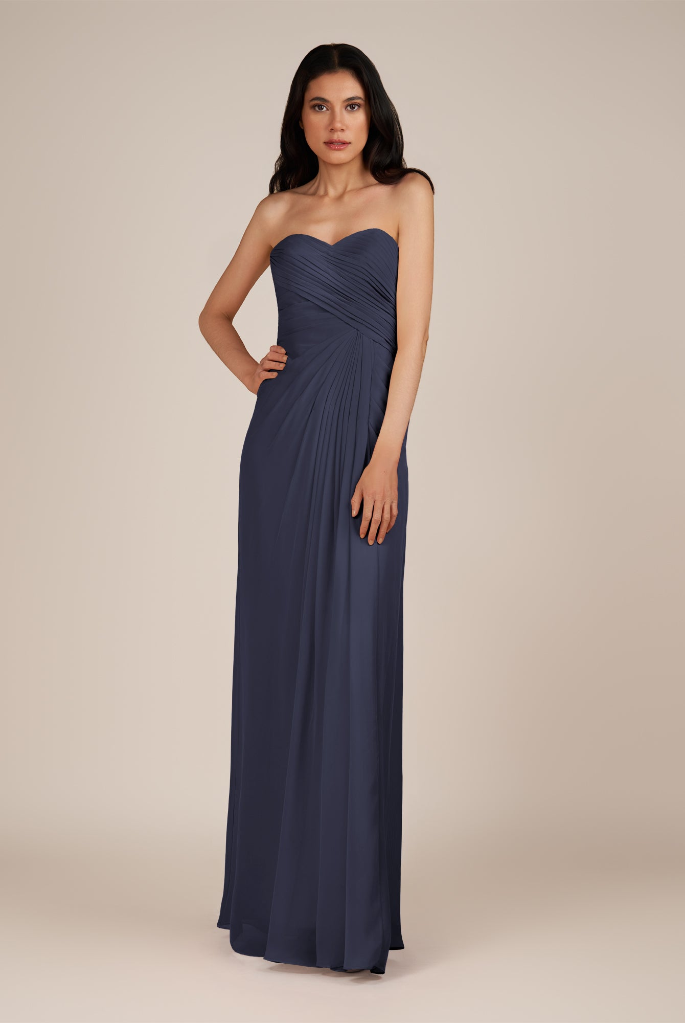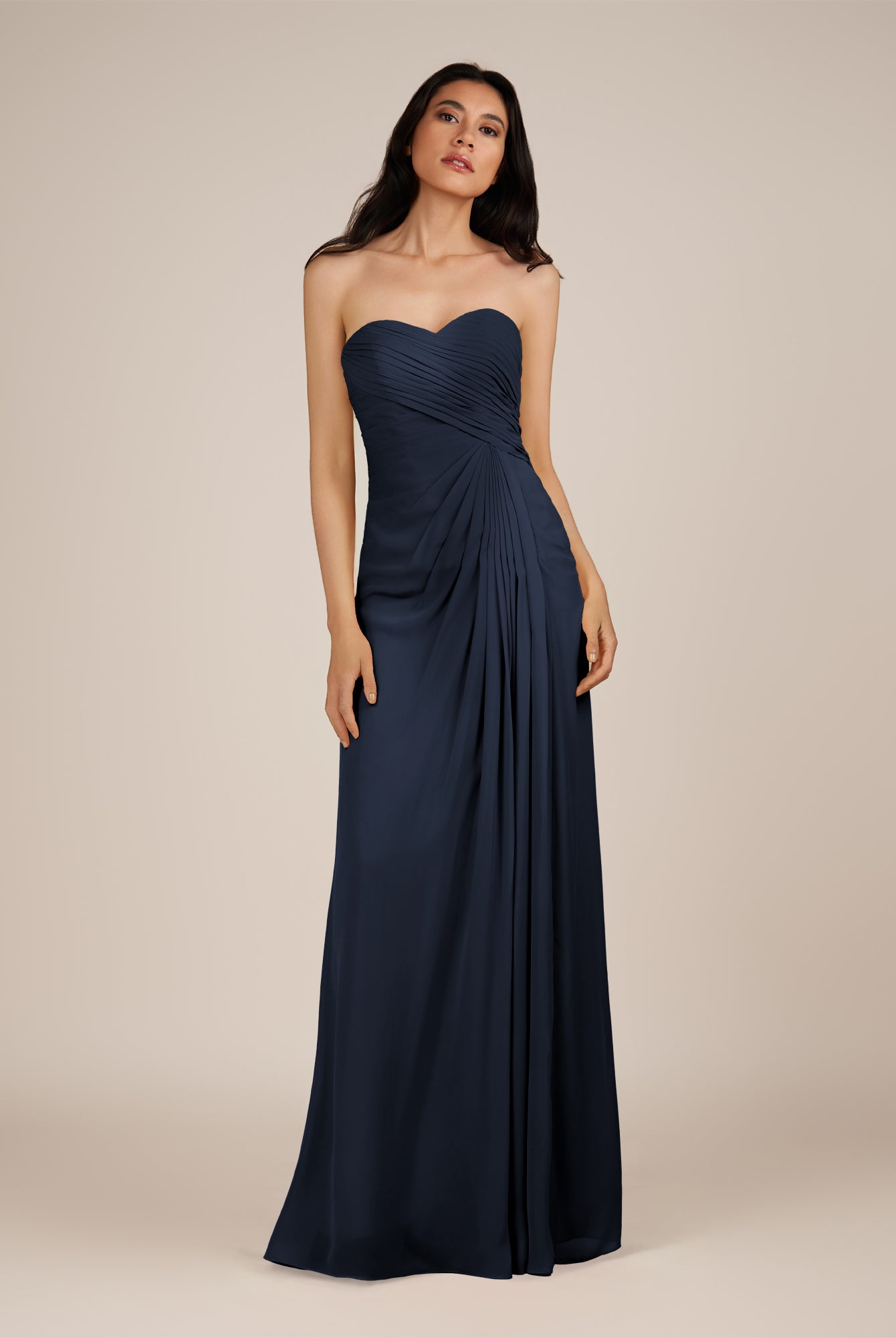 Wanlian | Navy - A Line Chiffon Sweetheart Long Bridesmaid Dress with Pleats
