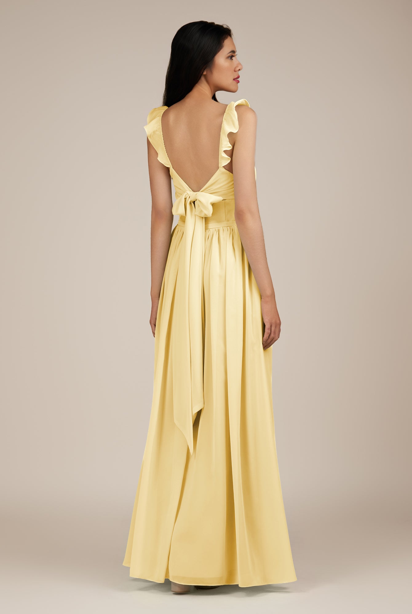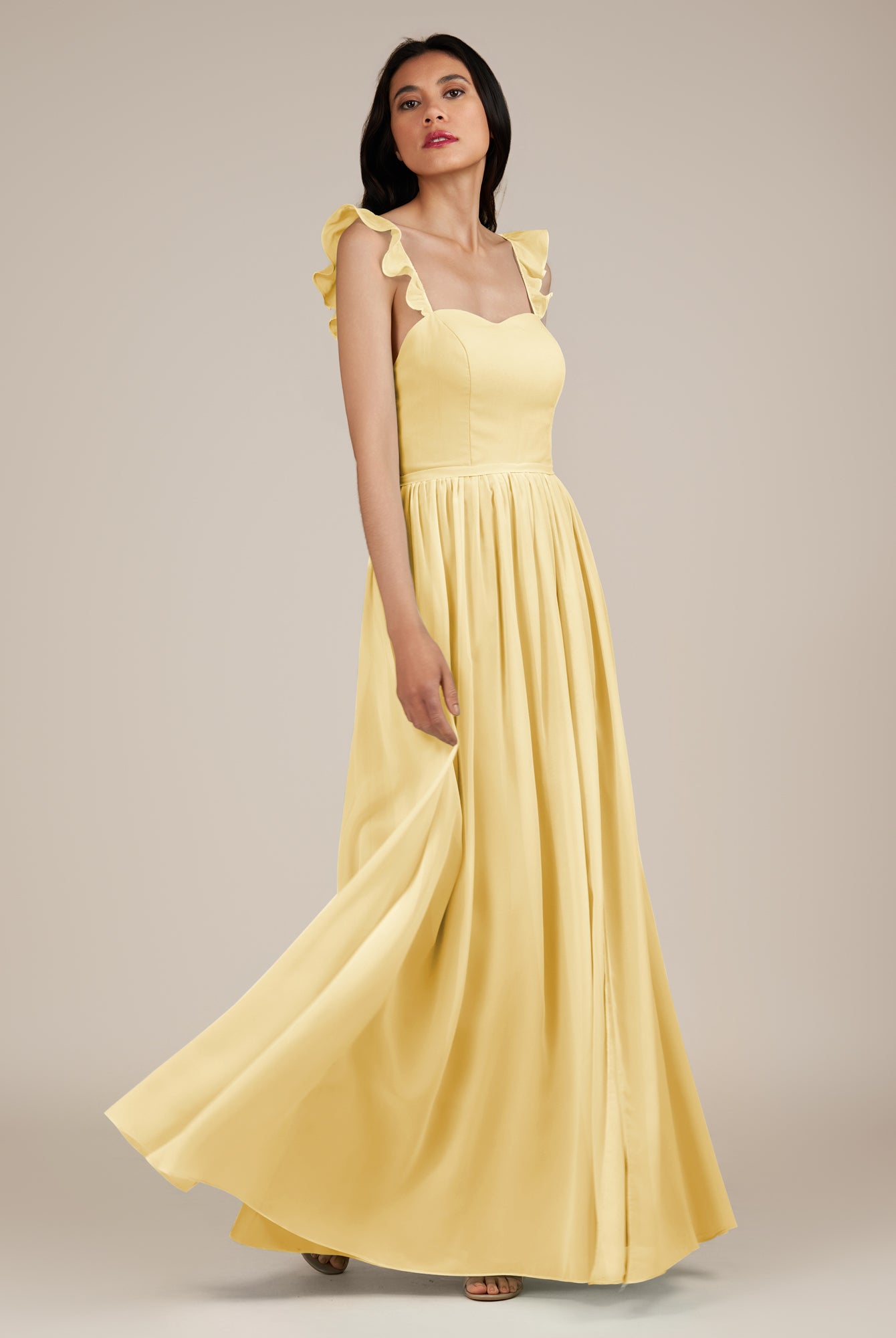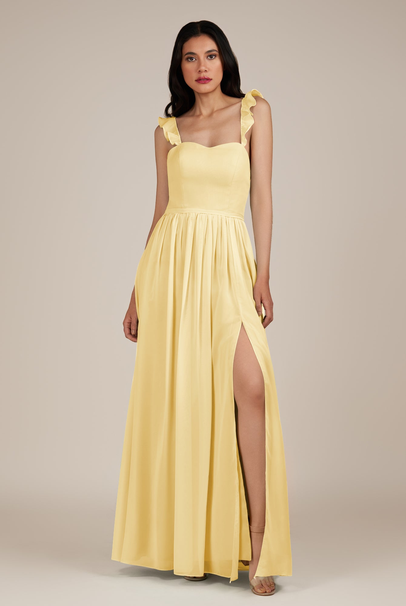 Onyx | Pastel Yellow - A Line Sweetheart Chiffon Ruffled Long Bridesmaid Dress with Slit