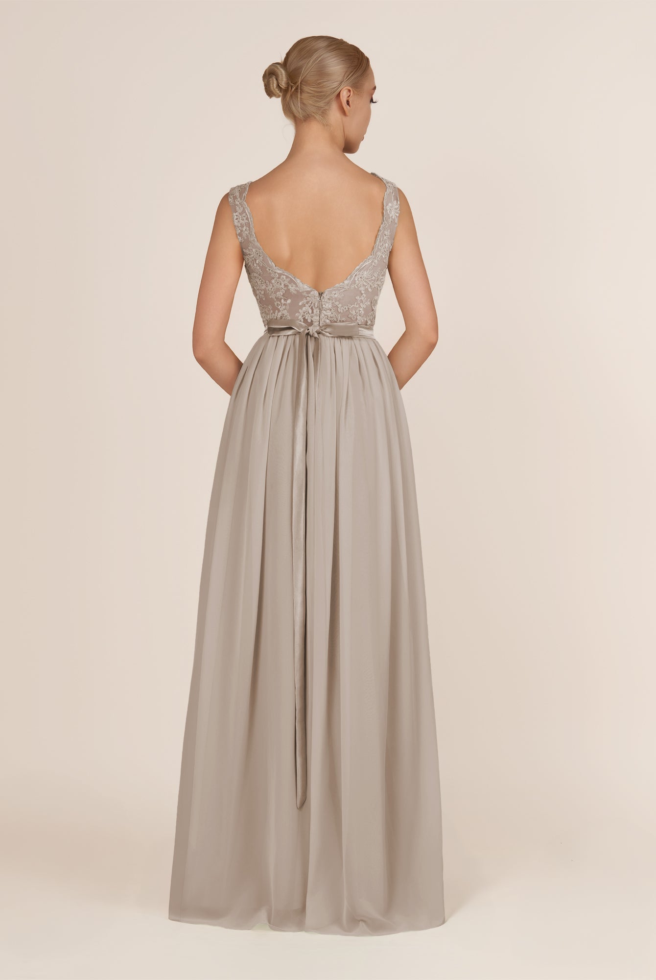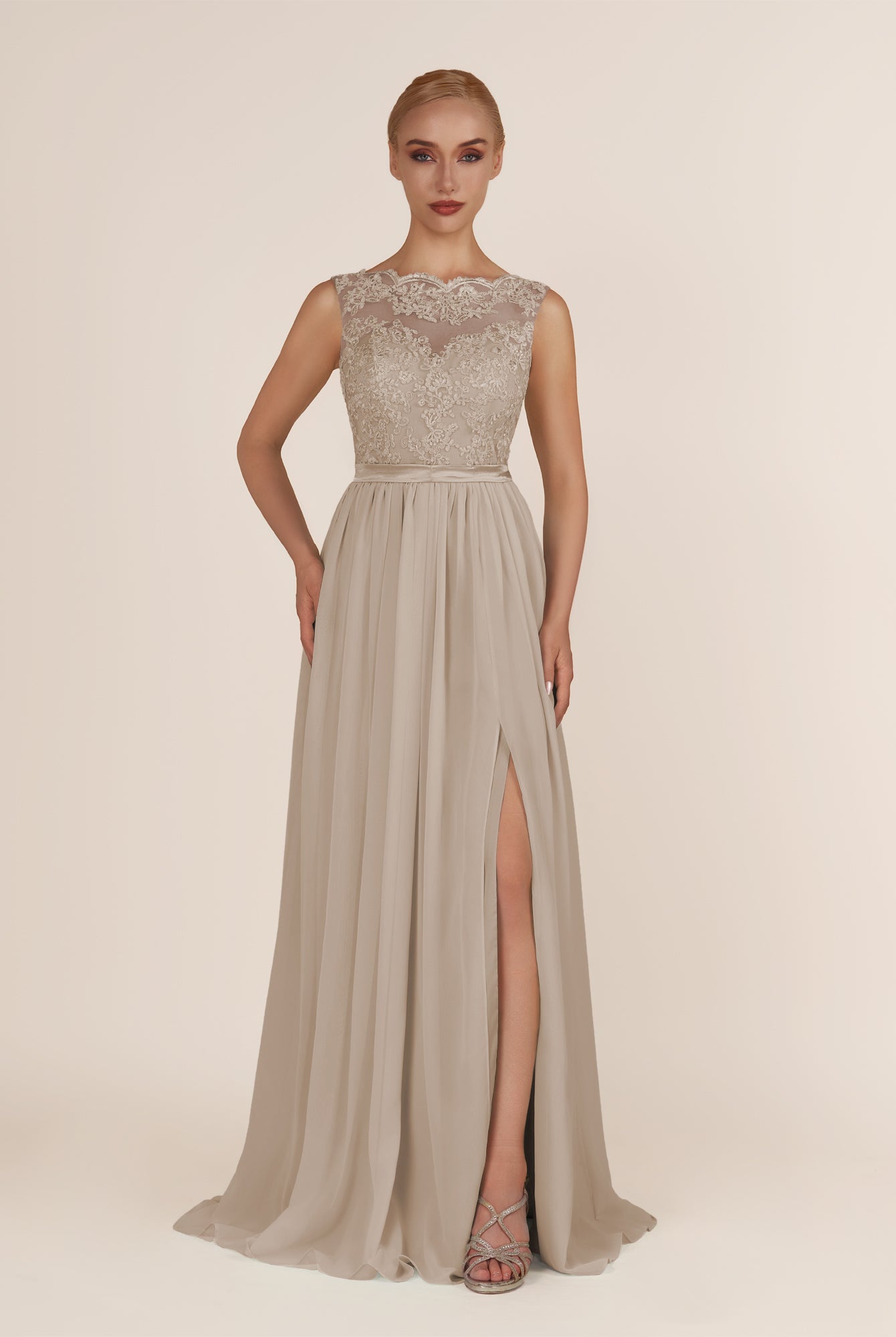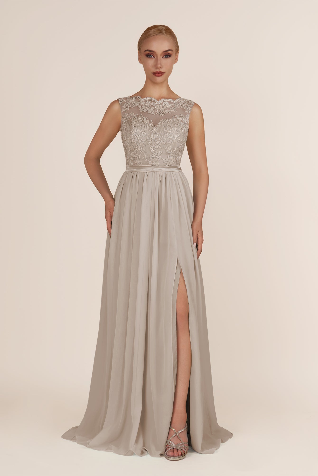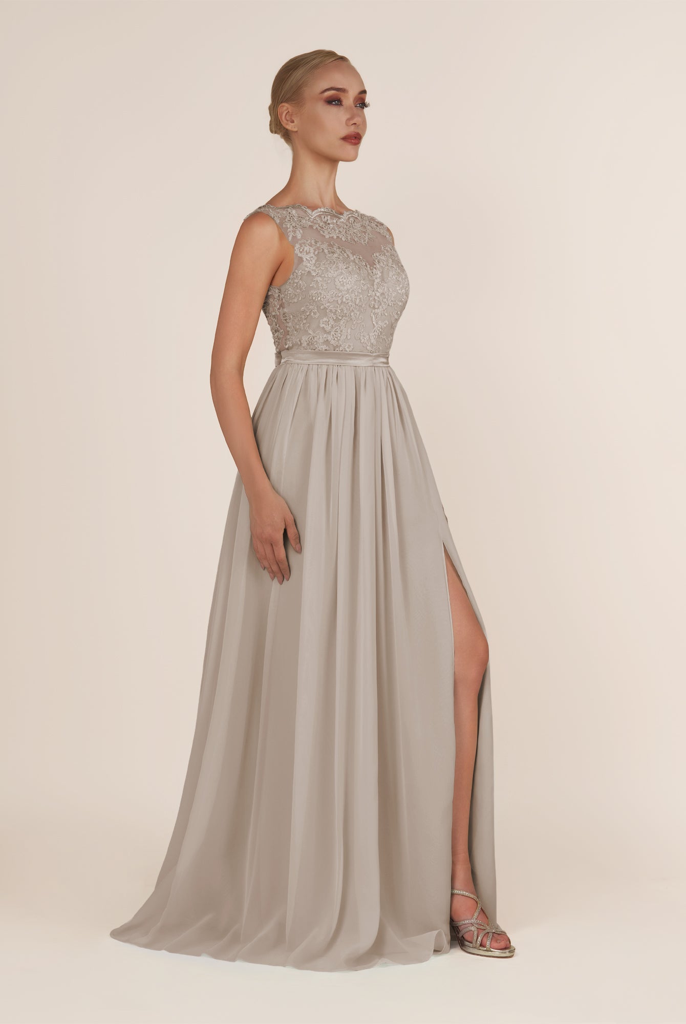Sable | Dove Gray - A-Line Illusion Neck Chiffon Long Bridesmaid Dress with Lace Appliques