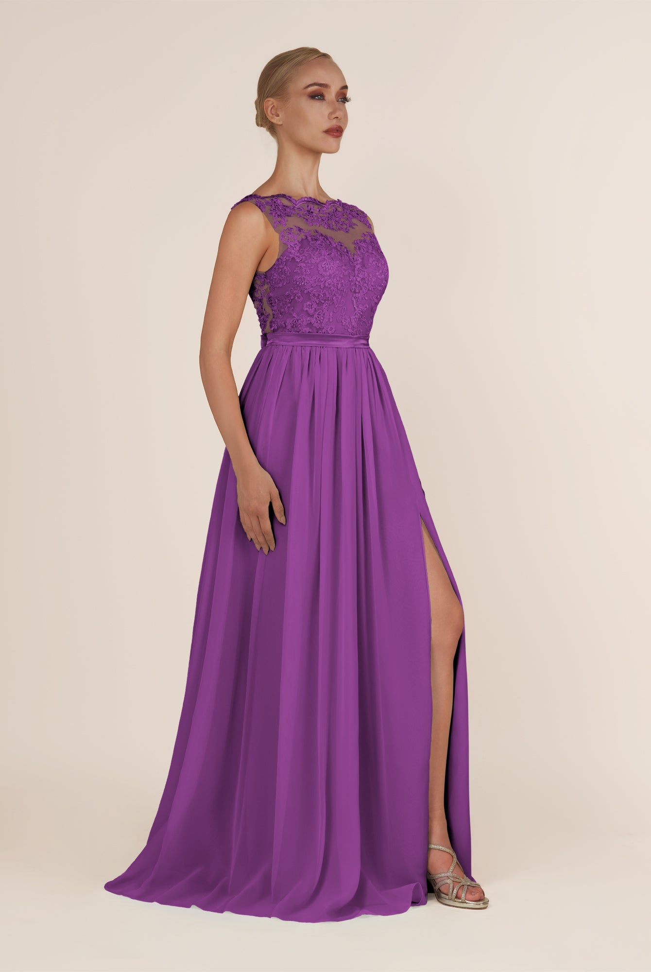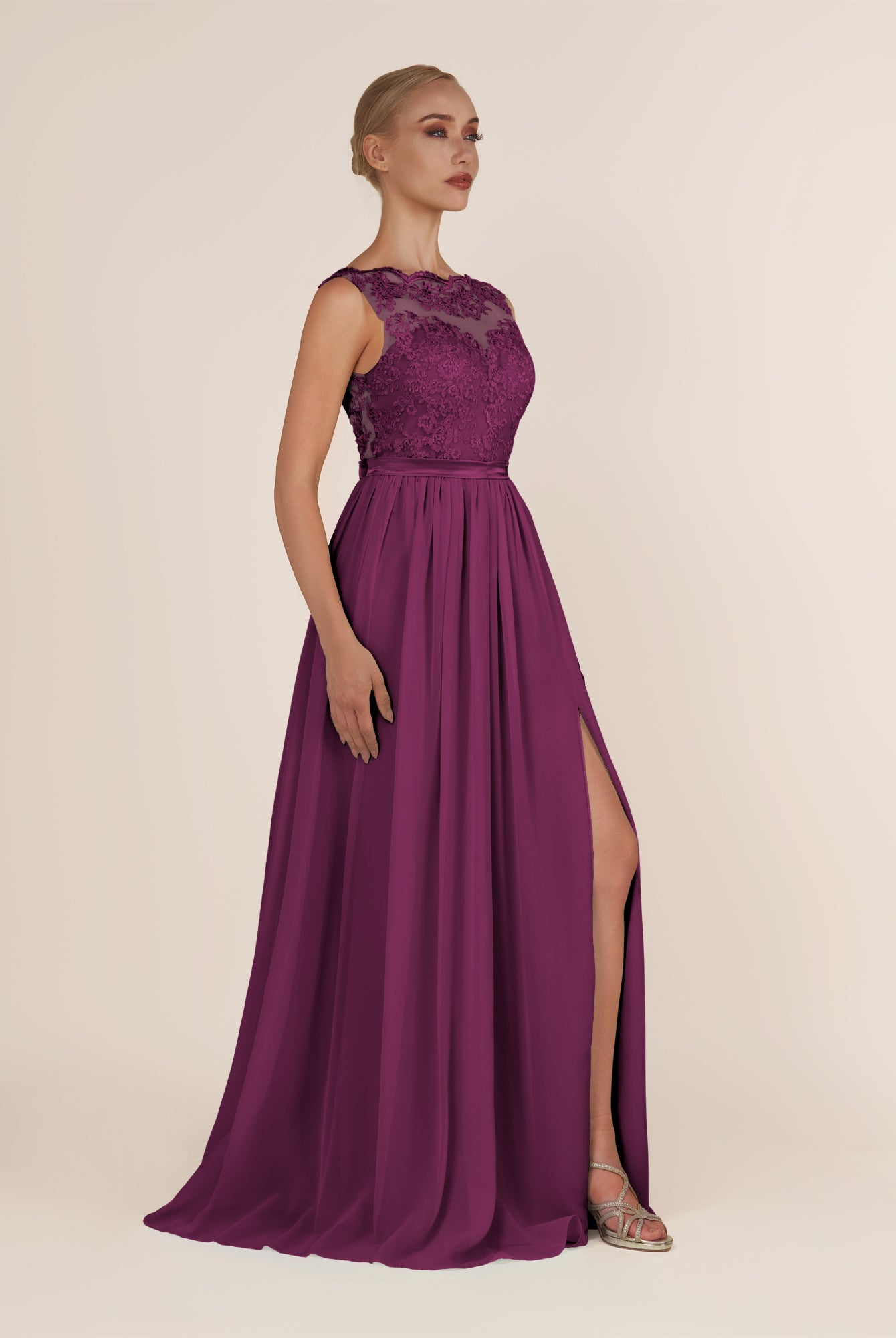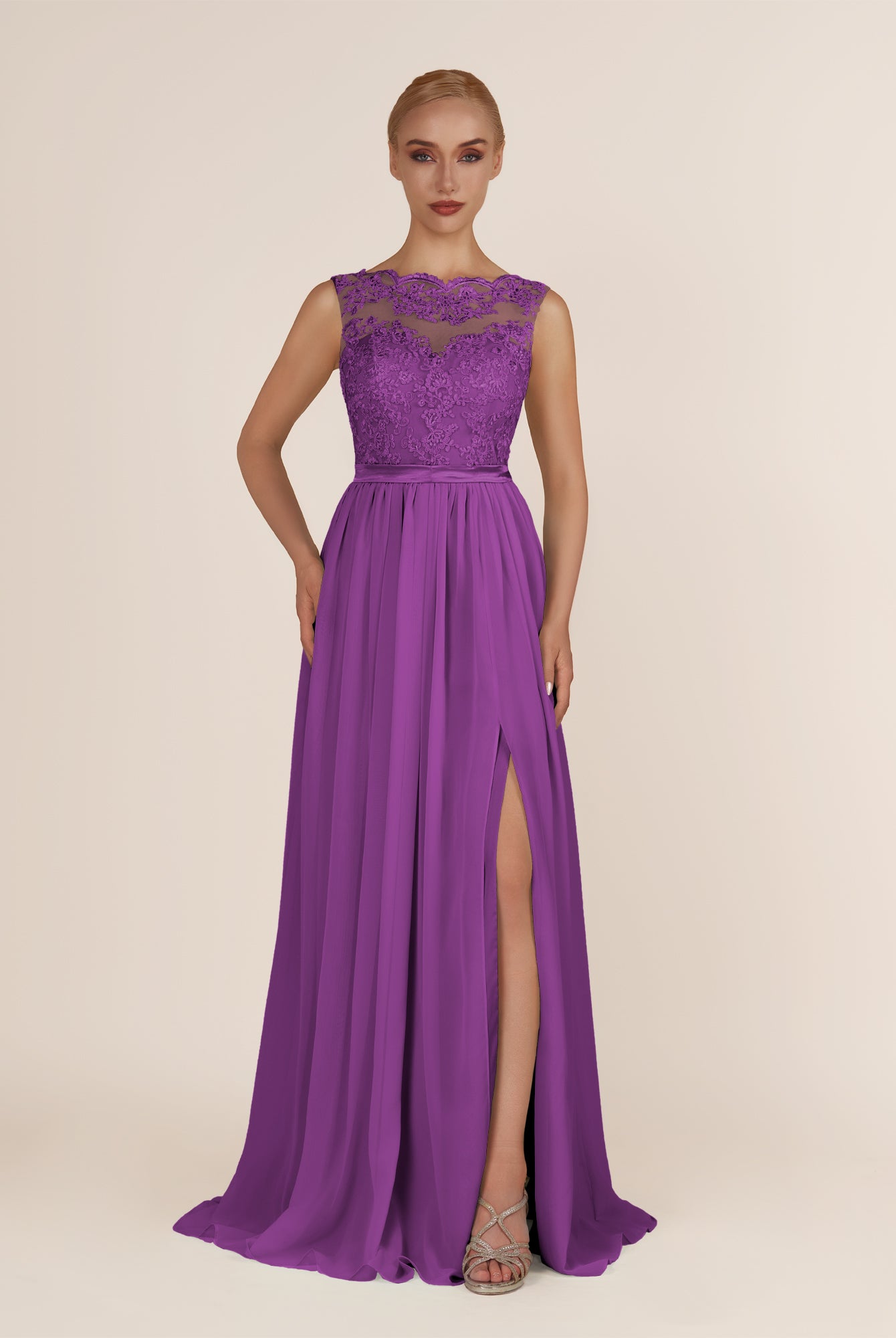 Sable | Amethyst - A-Line Illusion Neck Chiffon Long Bridesmaid Dress with Lace Appliques