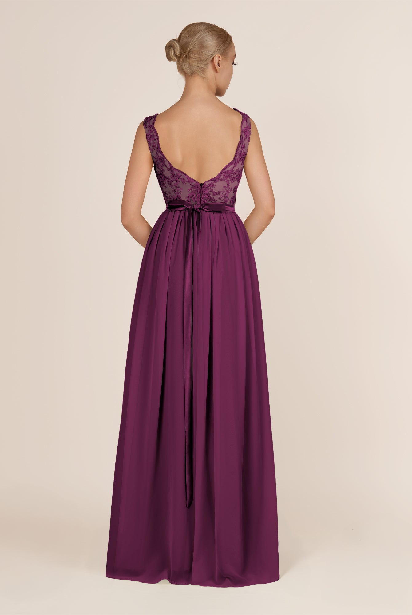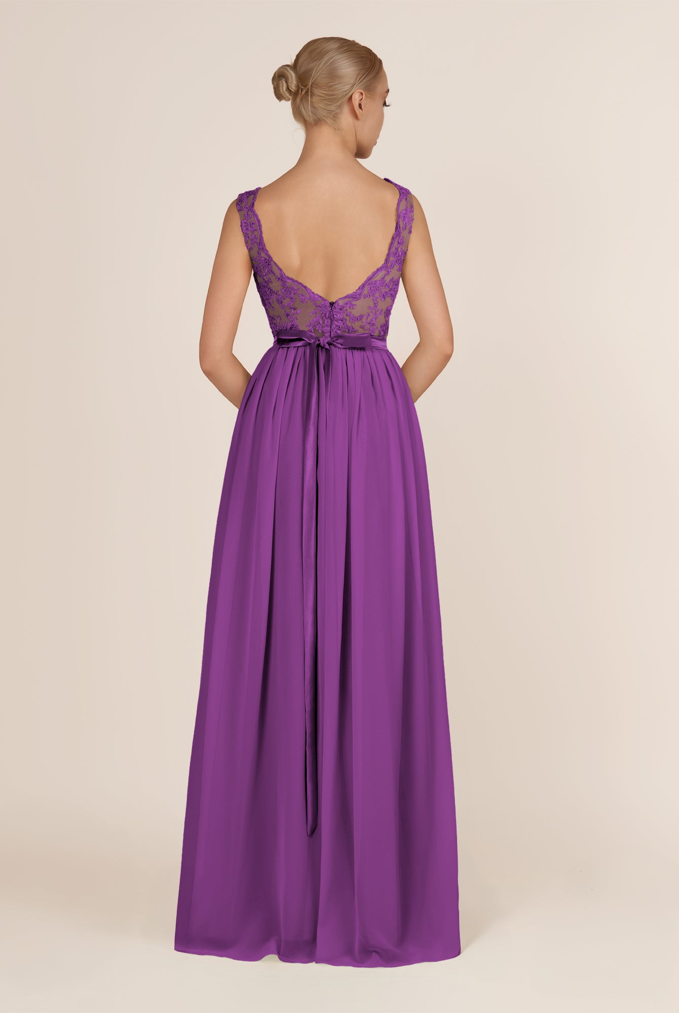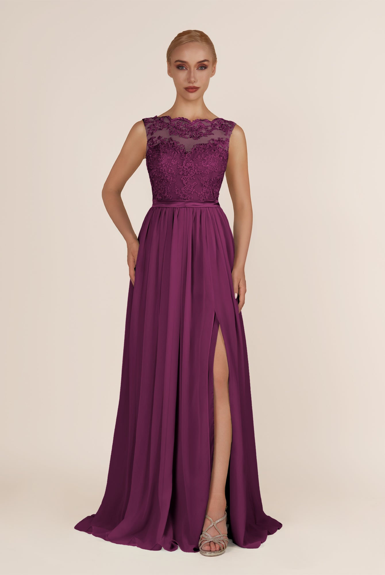 Sable | Amethyst - A-Line Illusion Neck Chiffon Long Bridesmaid Dress with Lace Appliques