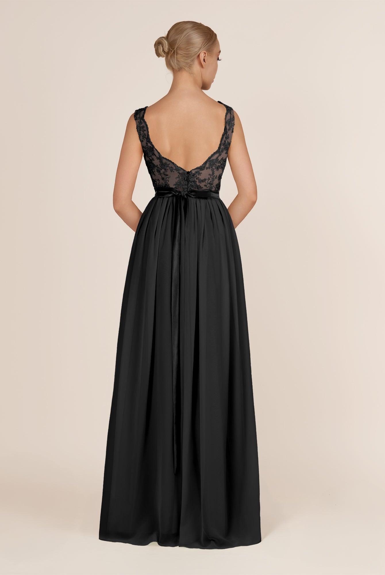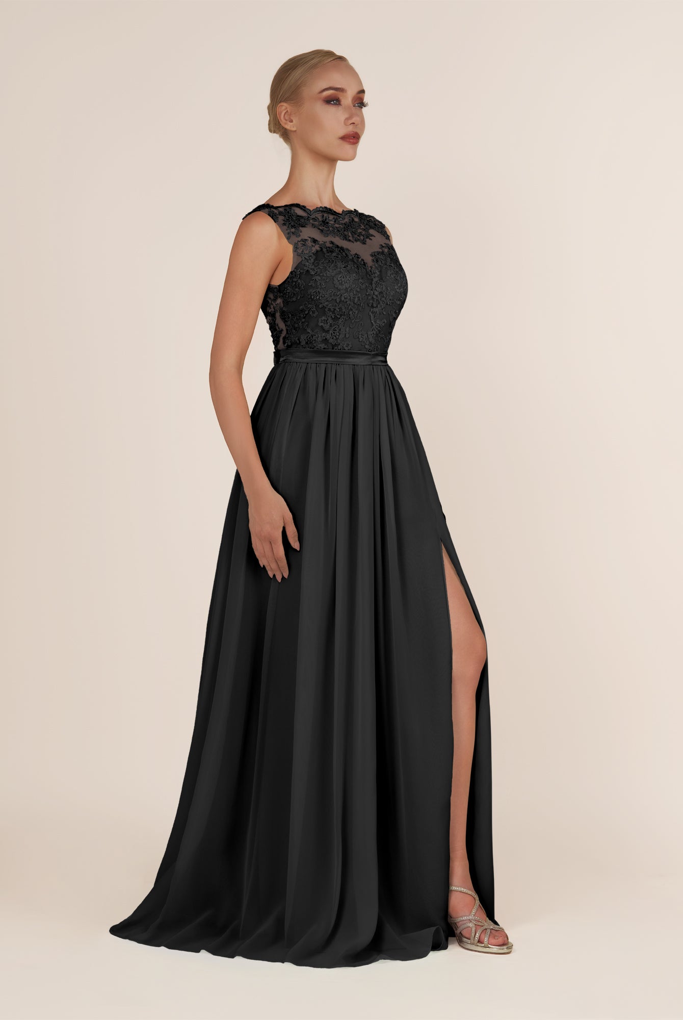 Sable | Black - A-Line Illusion Neck Chiffon Long Bridesmaid Dress with Lace Appliques