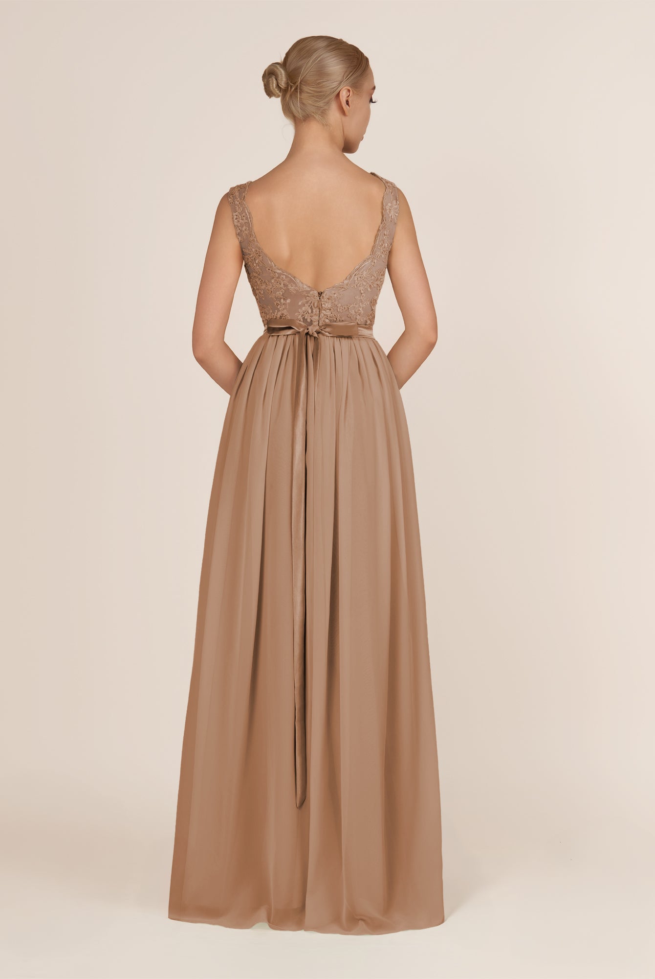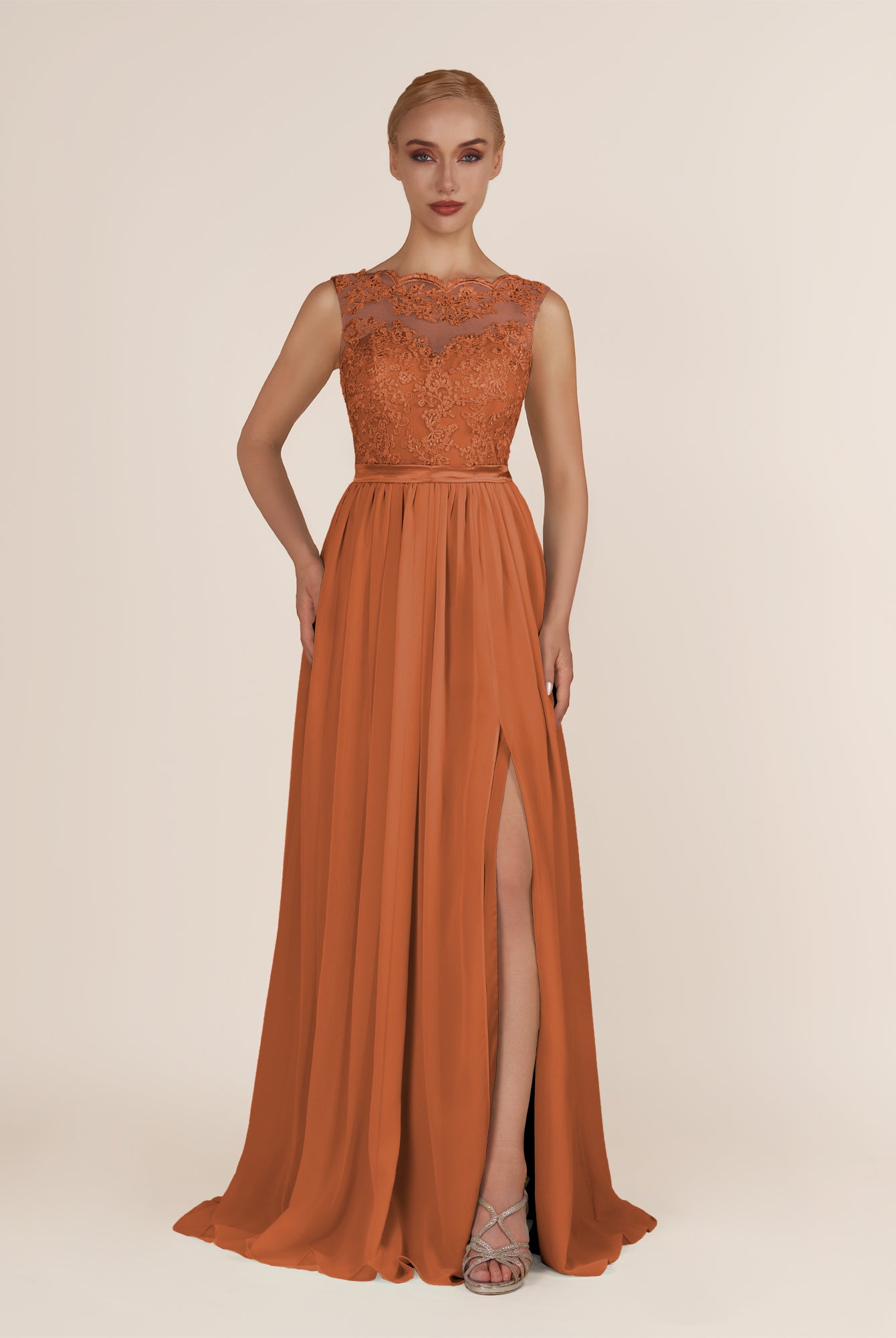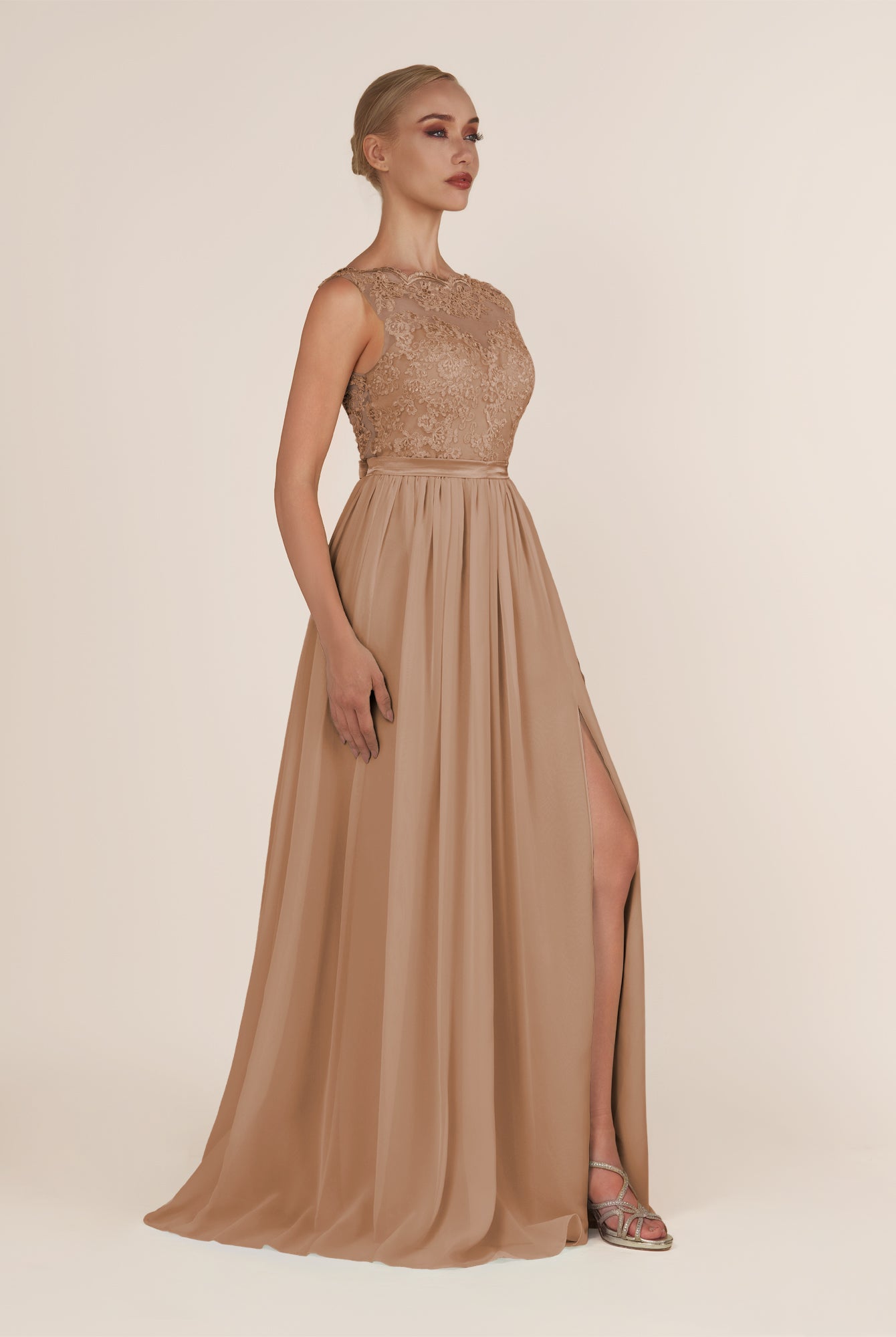 Sable | Toffee - A-Line Illusion Neck Chiffon Long Bridesmaid Dress with Lace Appliques