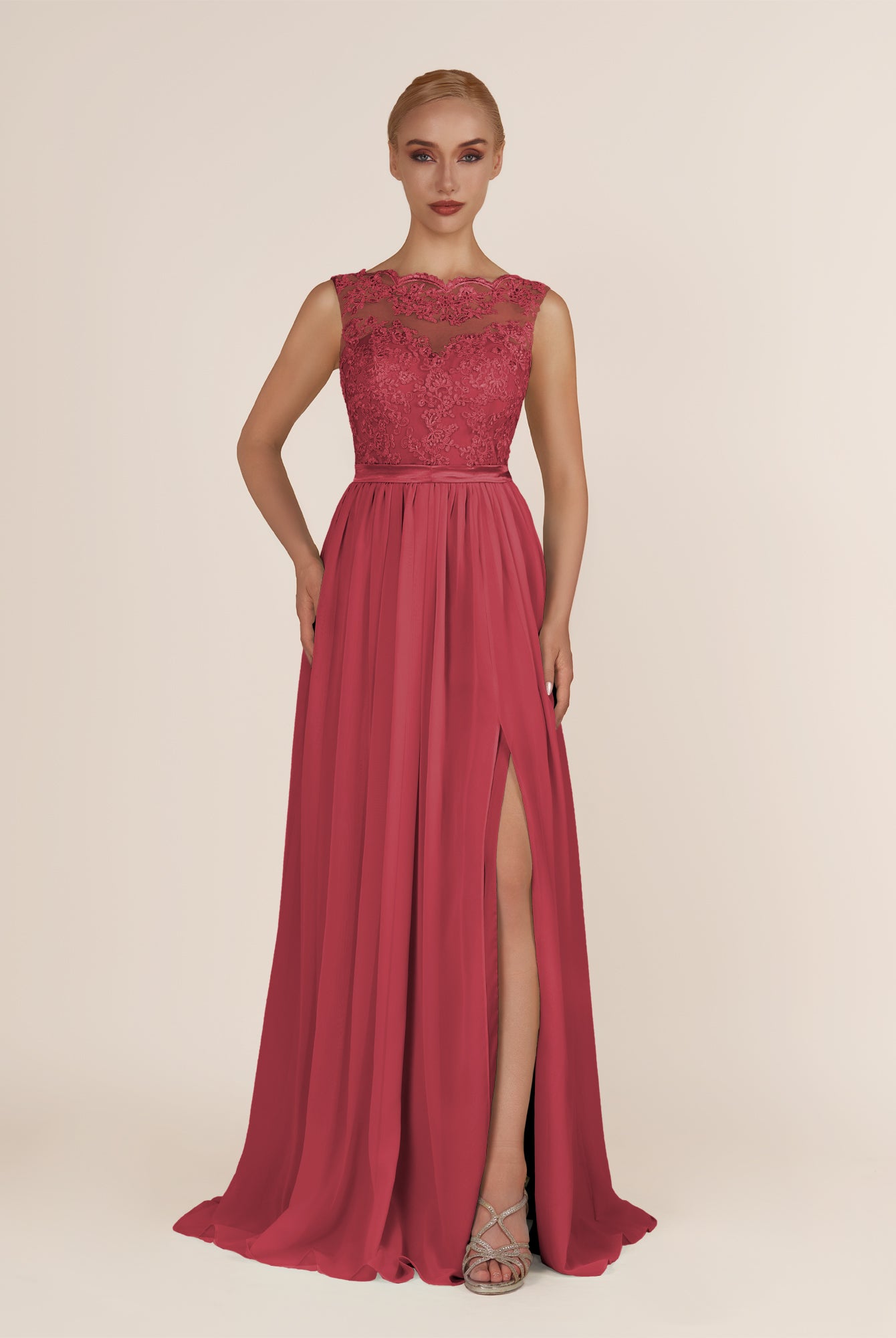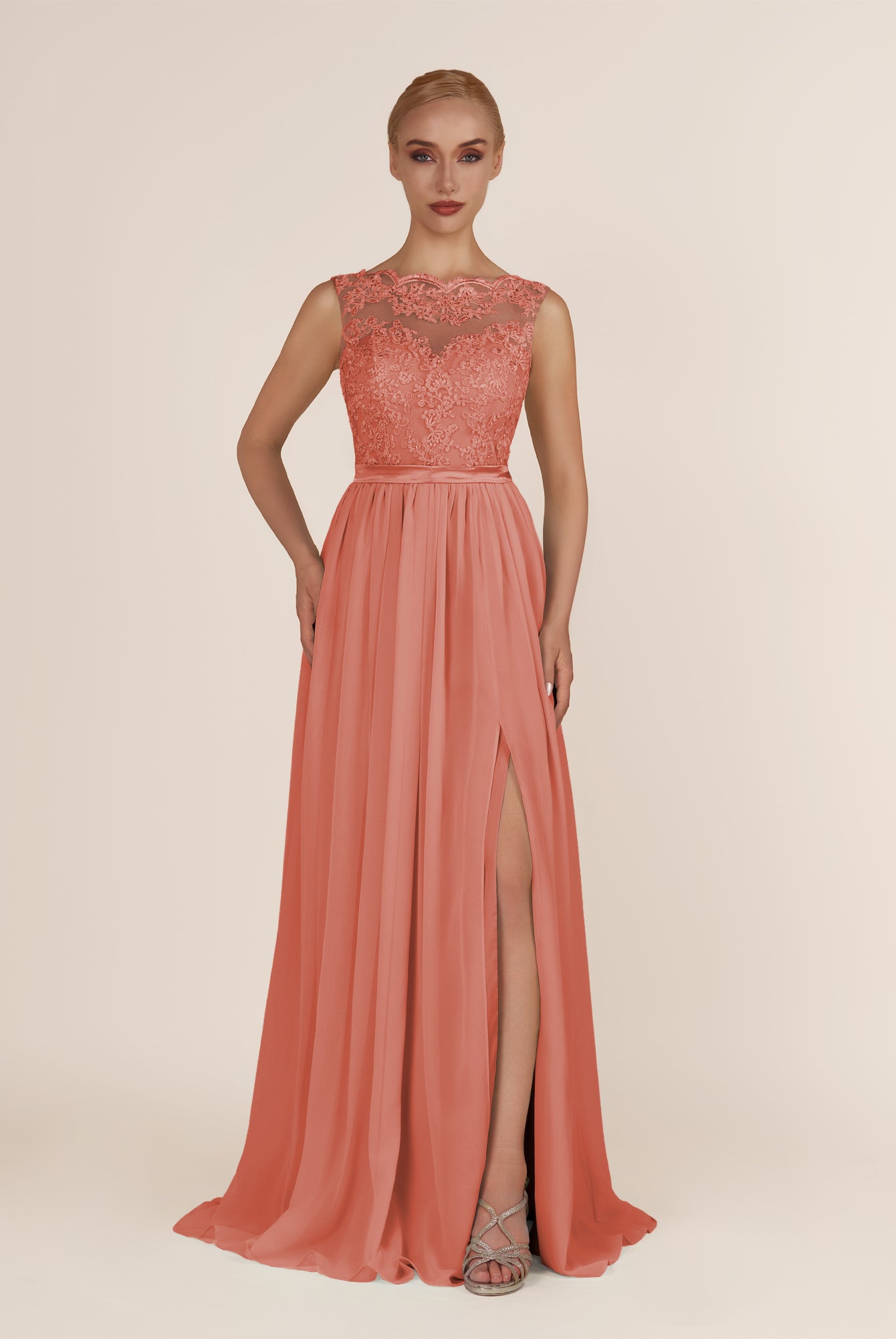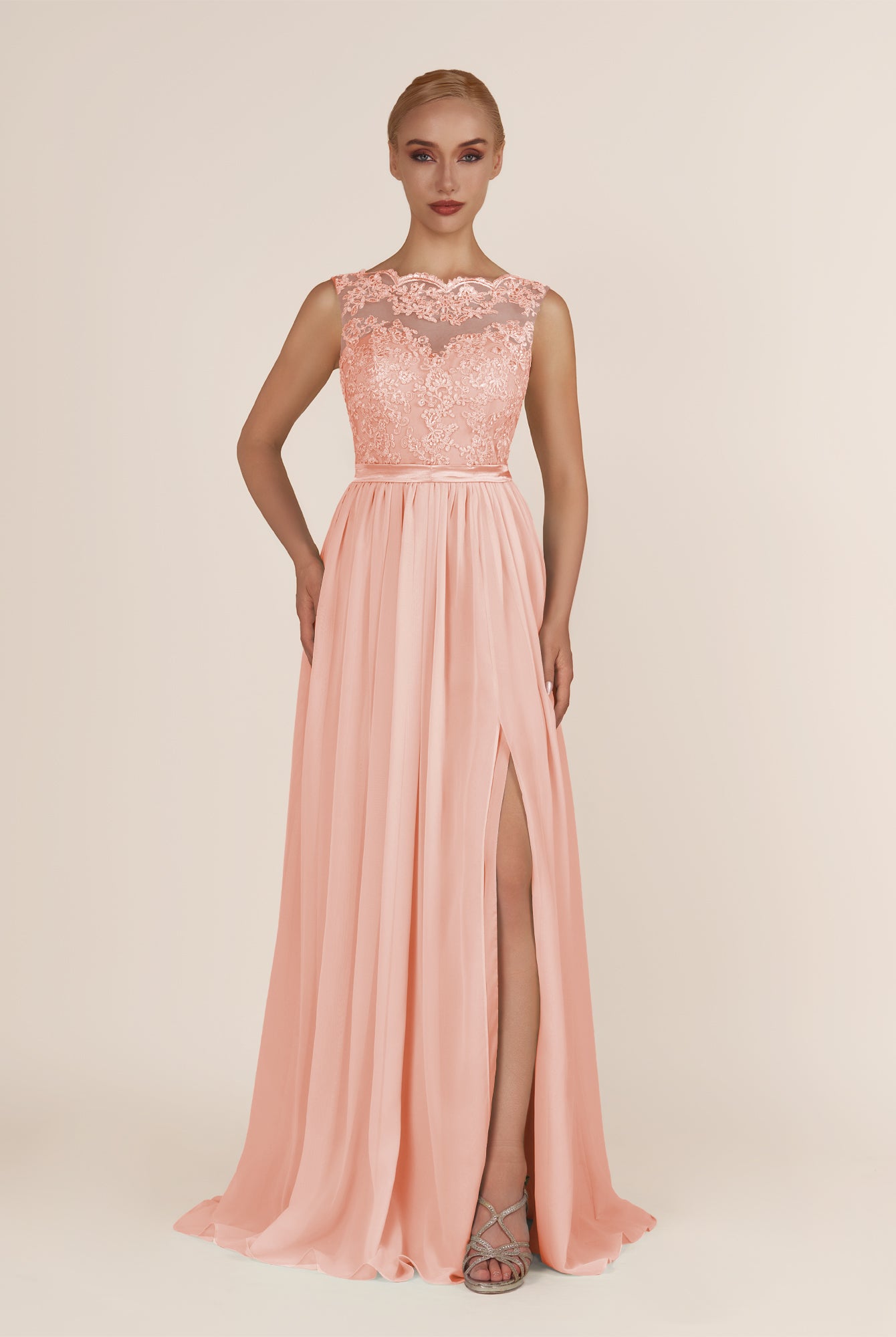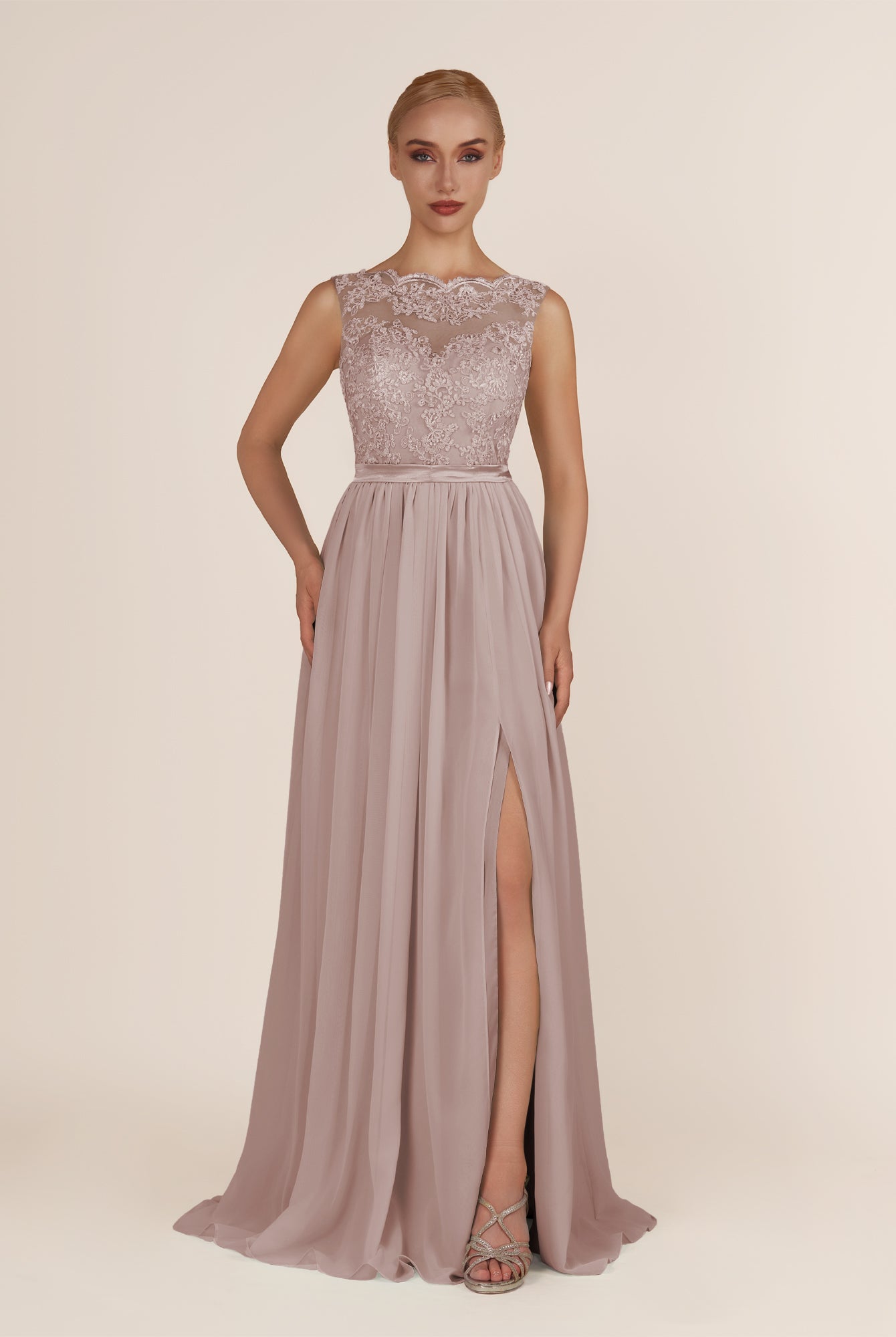 Sable | Desert Rose - A-Line Illusion Neck Chiffon Long Bridesmaid Dress with Lace Appliques