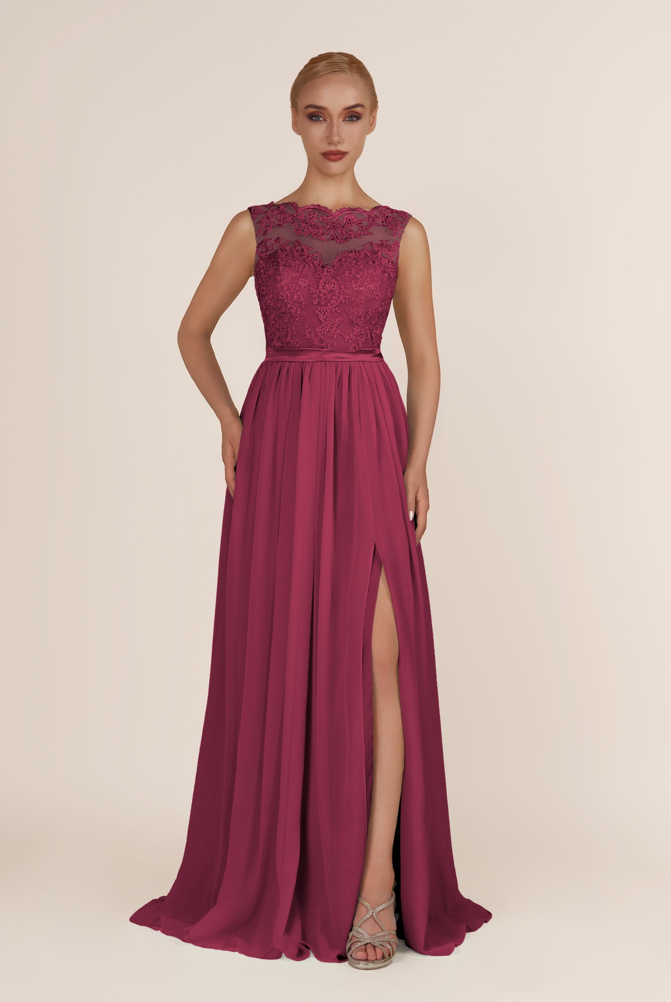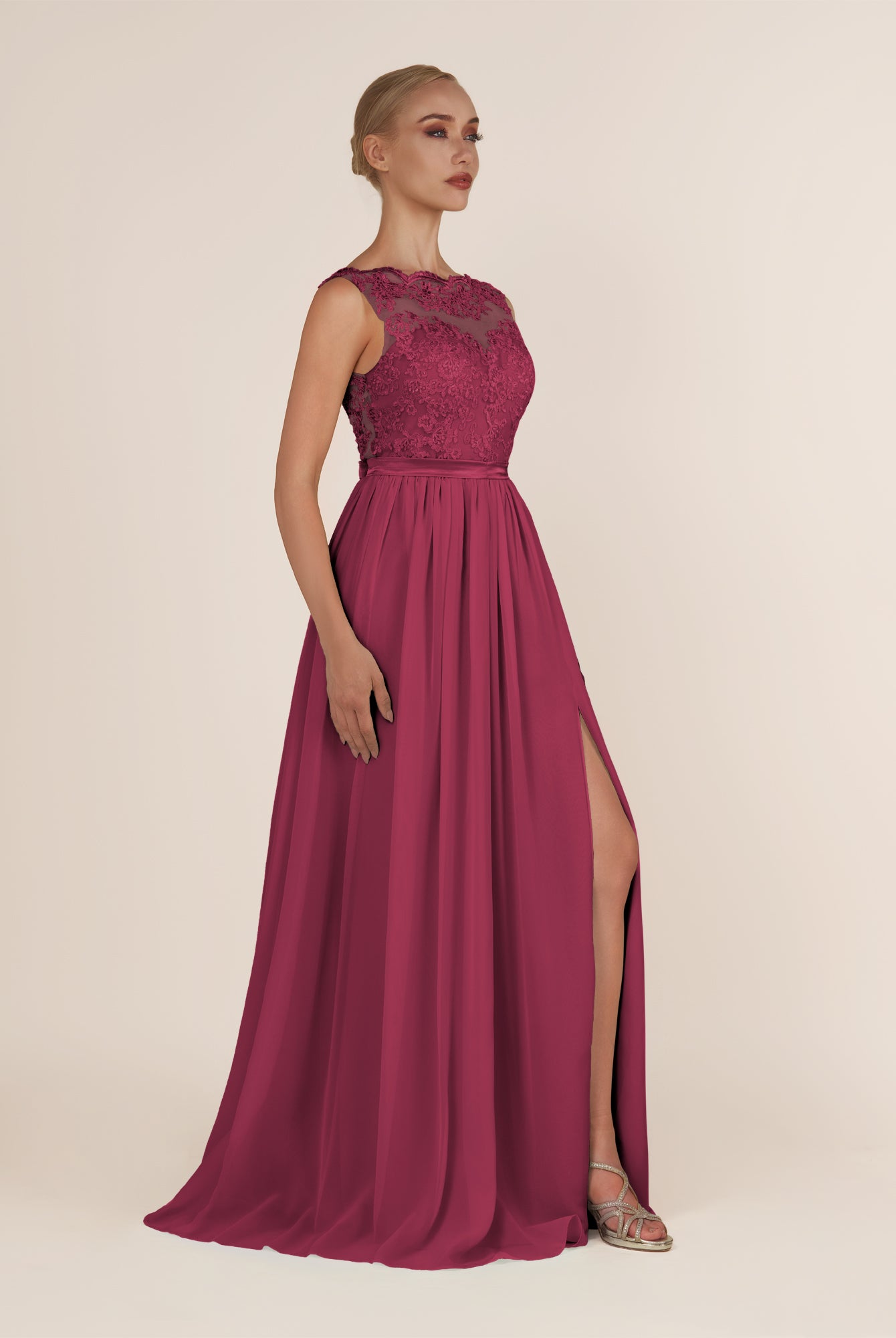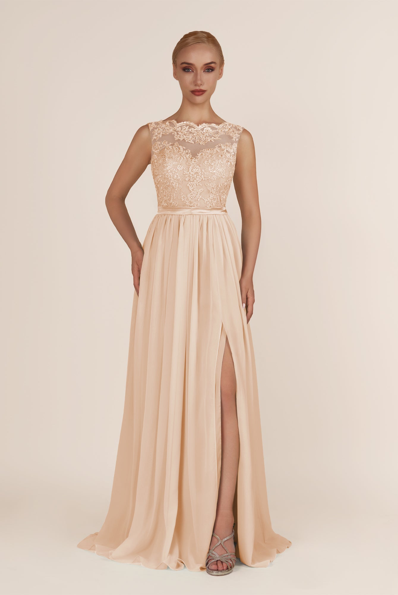 Sable | Desert Rose - A-Line Illusion Neck Chiffon Long Bridesmaid Dress with Lace Appliques