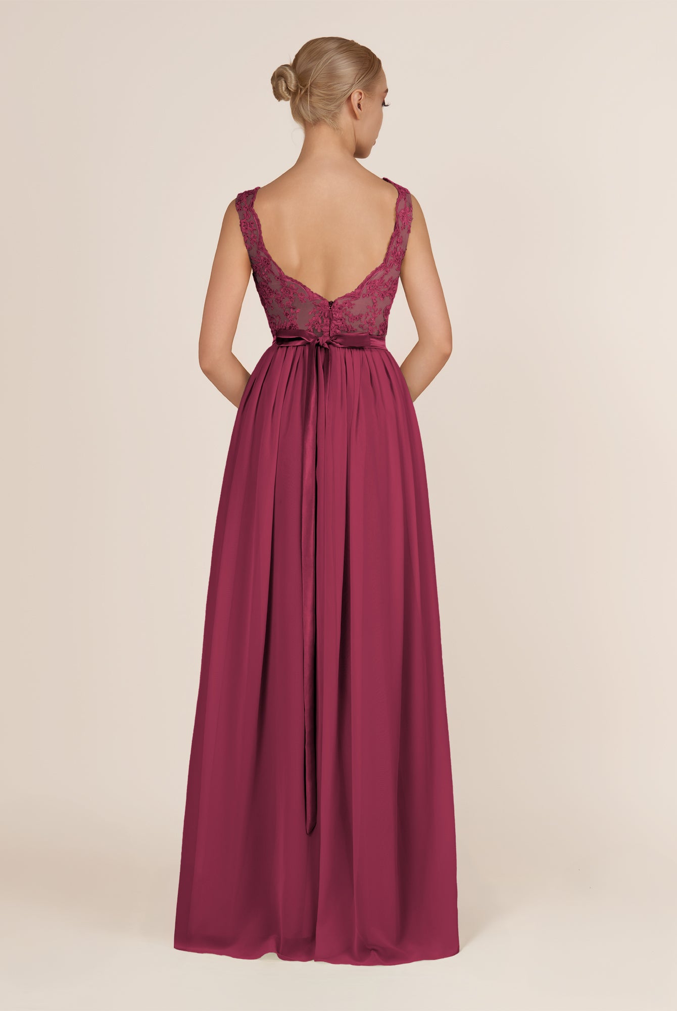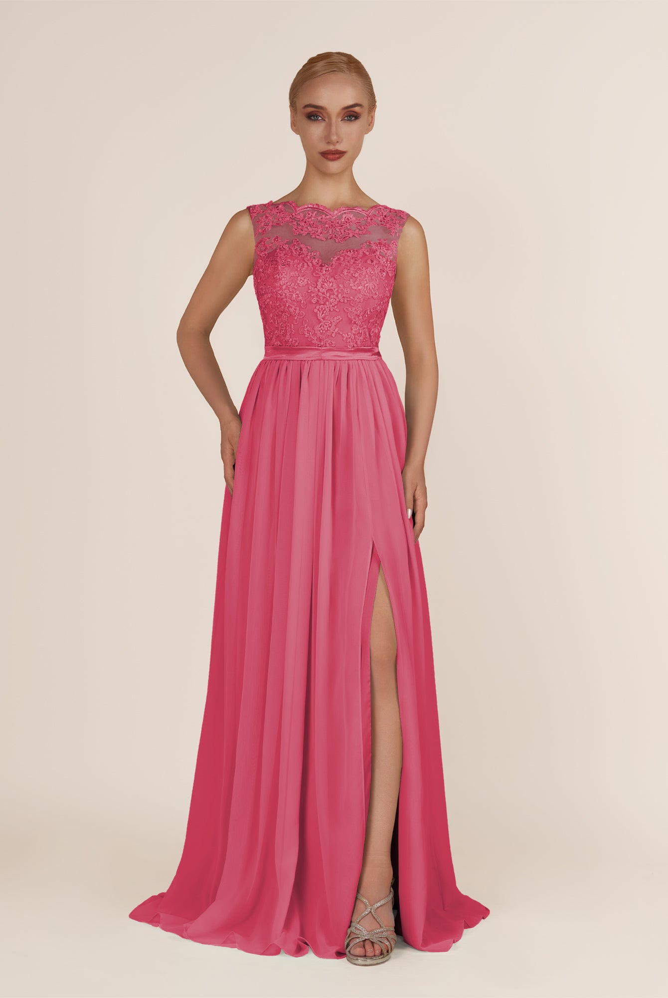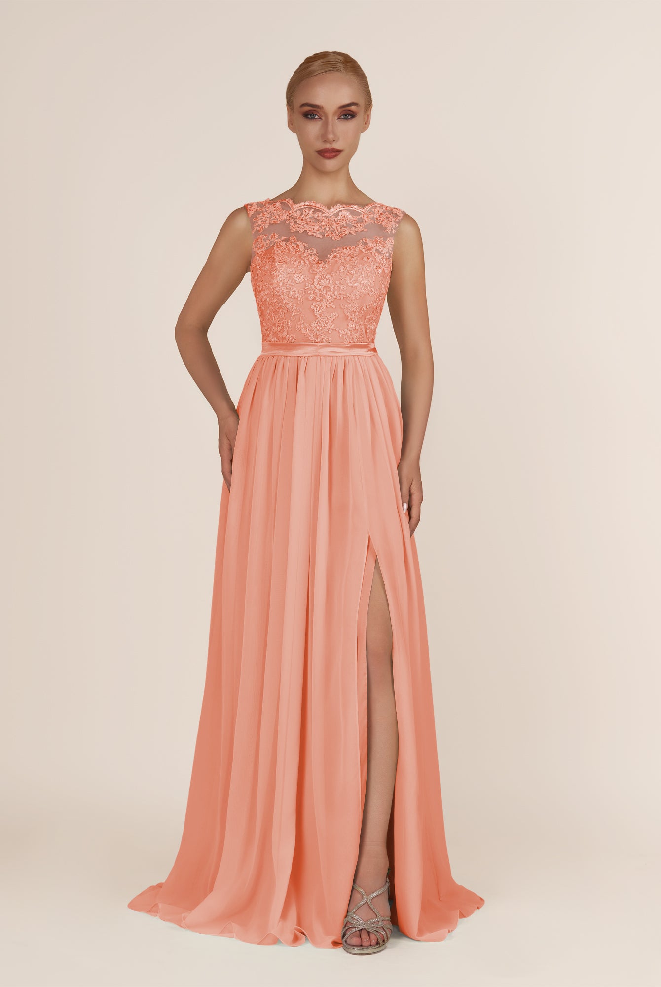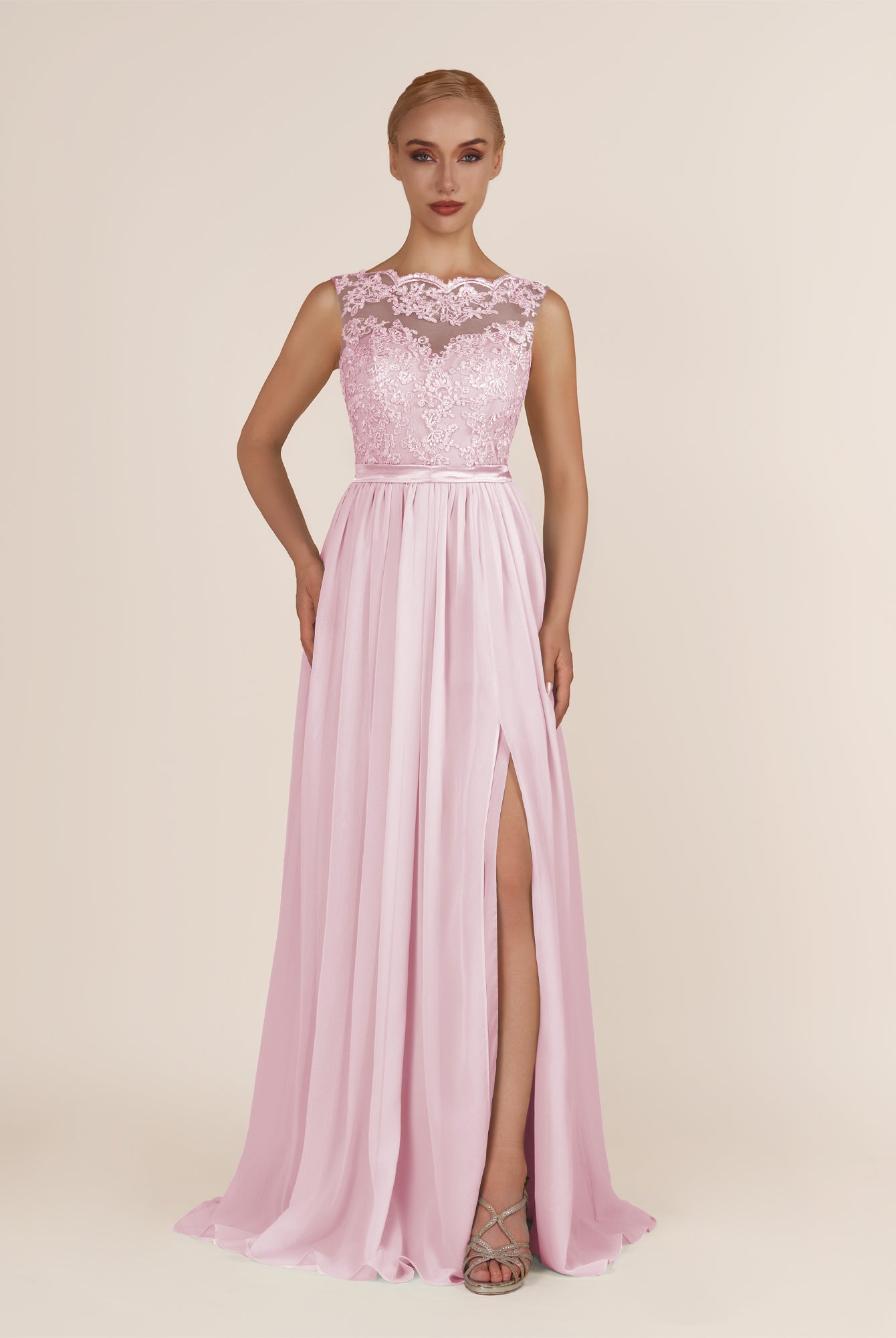 Sable | Desert Rose - A-Line Illusion Neck Chiffon Long Bridesmaid Dress with Lace Appliques