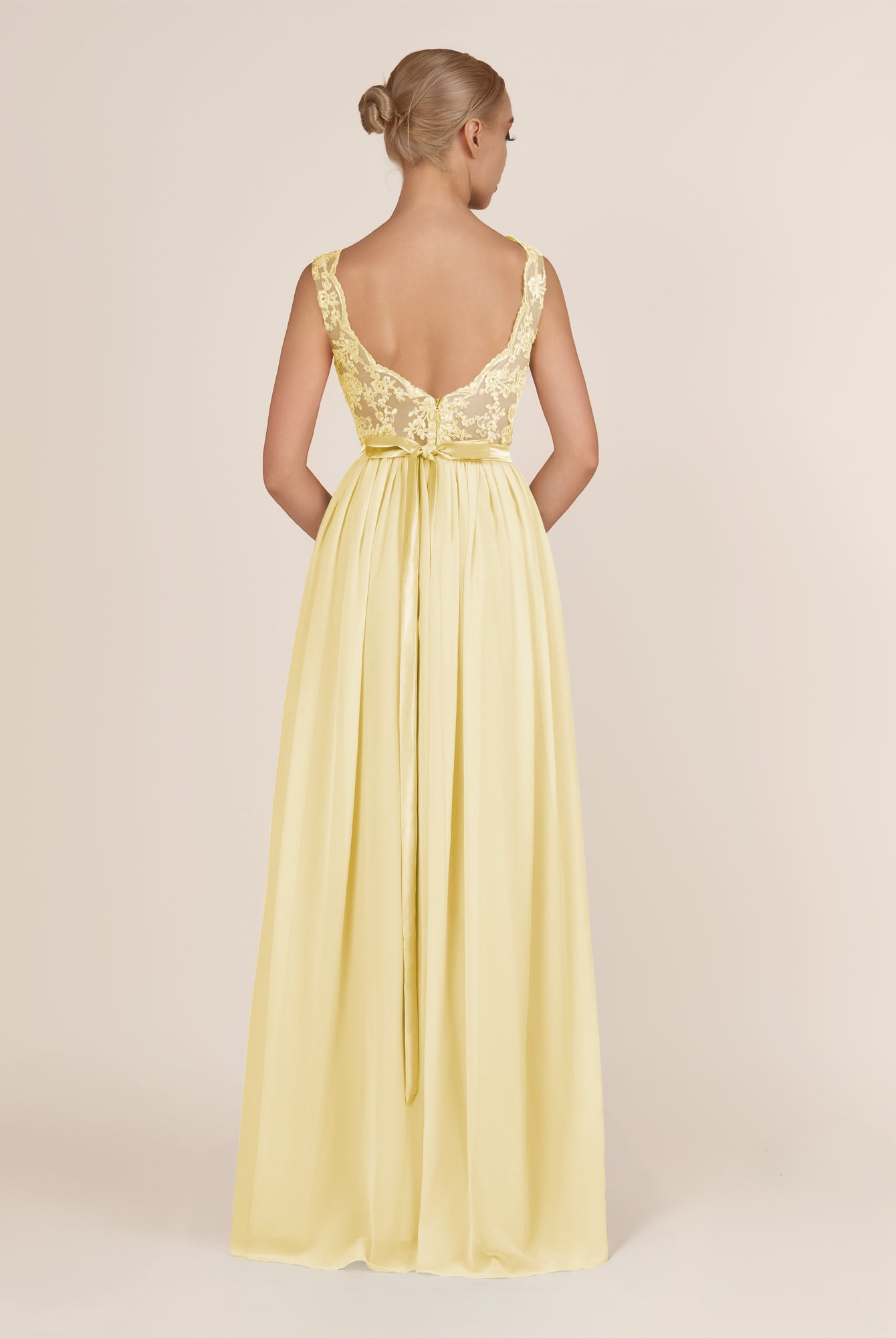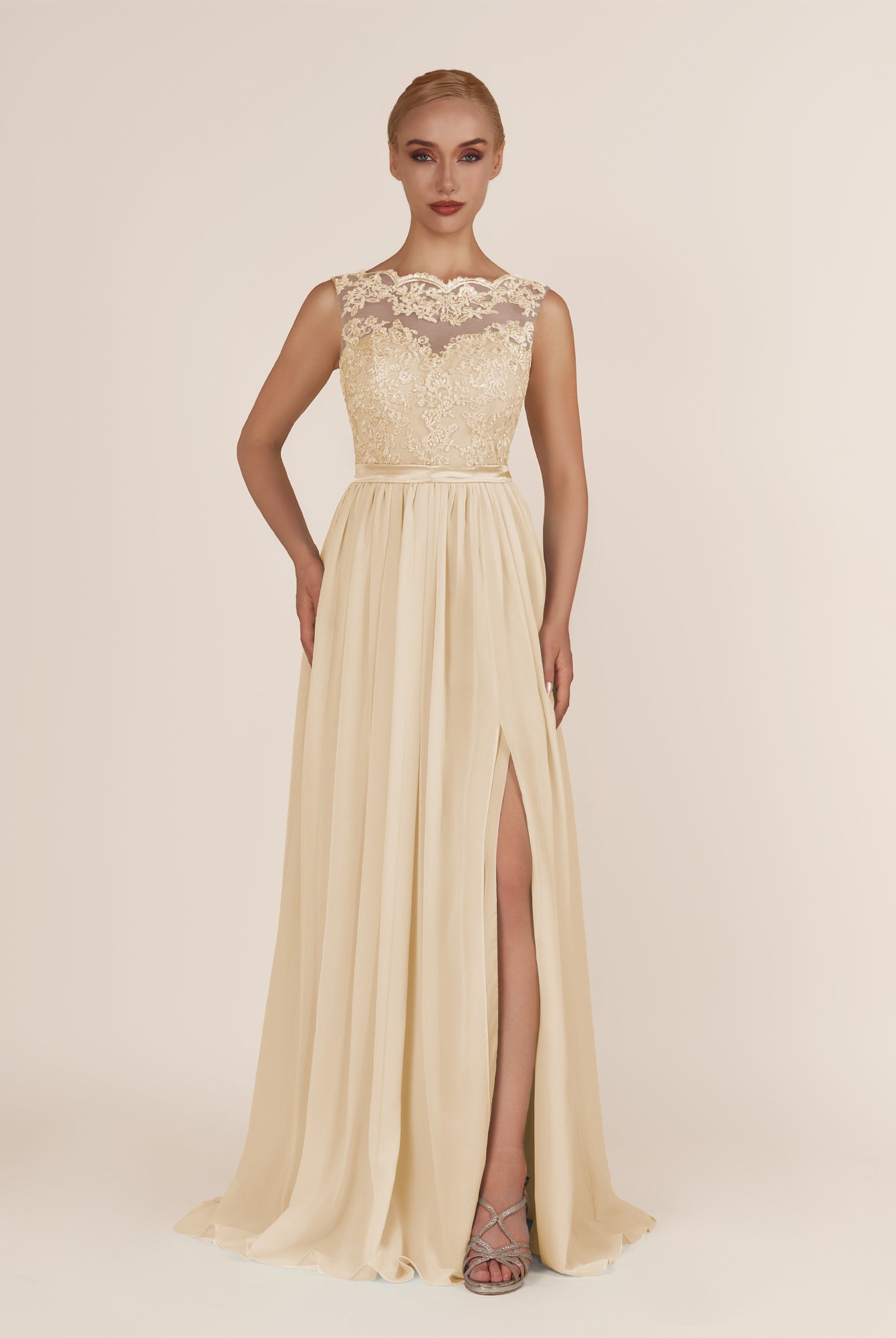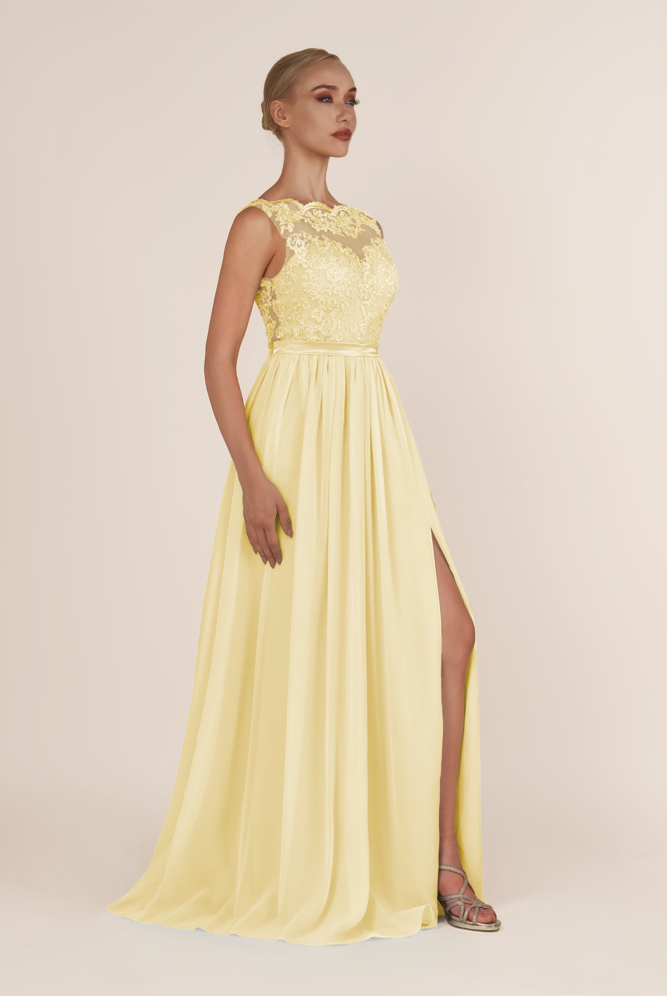 Sable | Pastel Yellow - A-Line Illusion Neck Chiffon Long Bridesmaid Dress with Lace Appliques