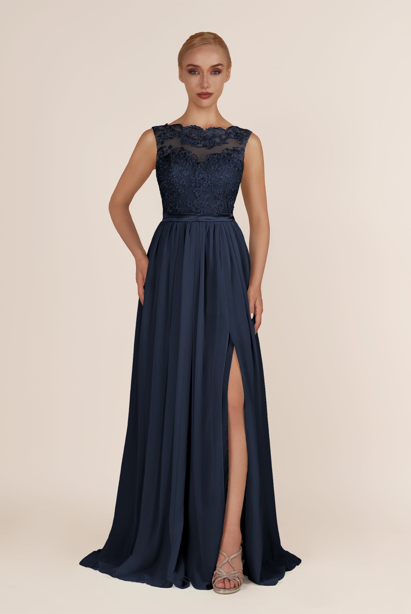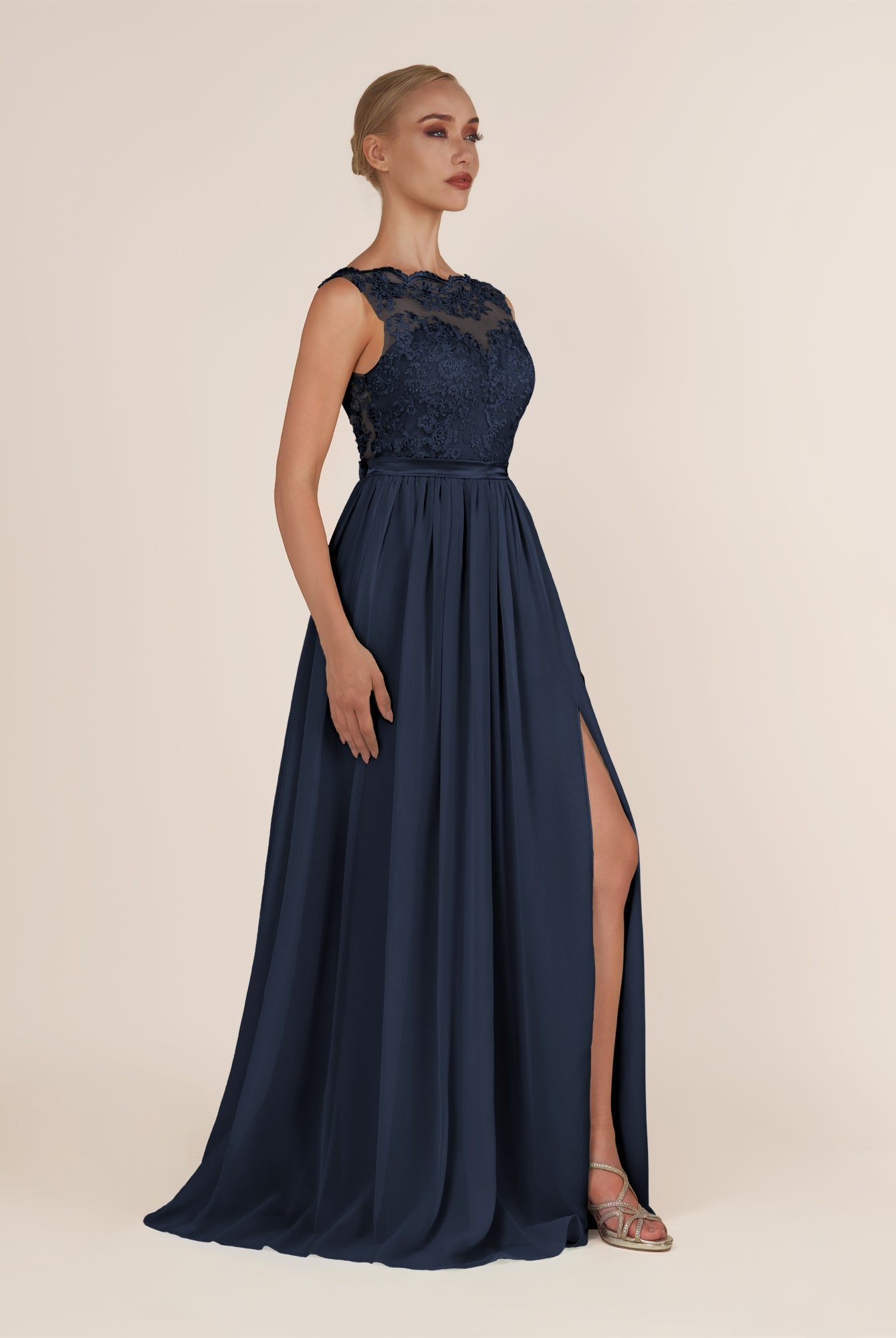 Sable | Navy - A-Line Illusion Neck Chiffon Long Bridesmaid Dress with Lace Appliques