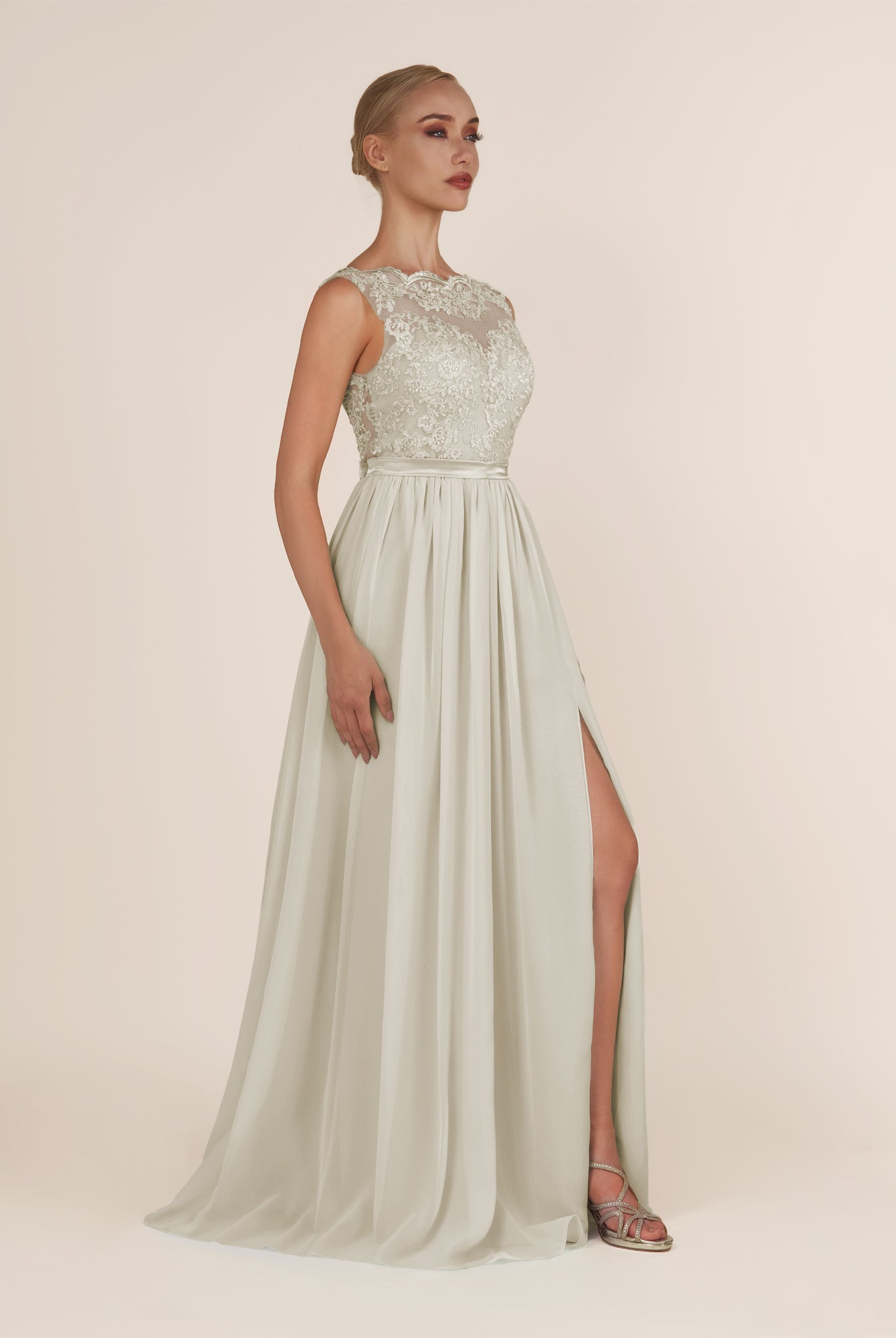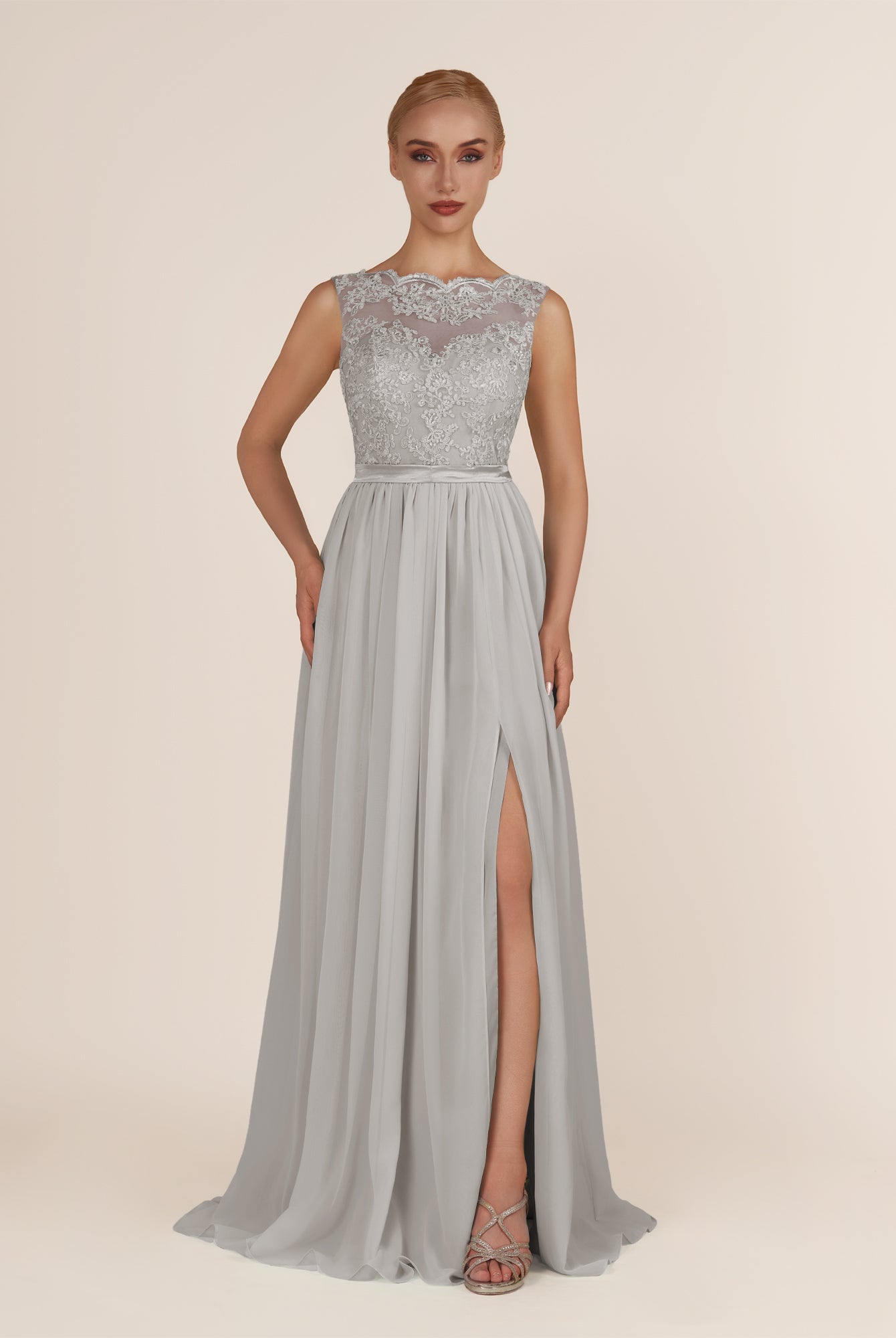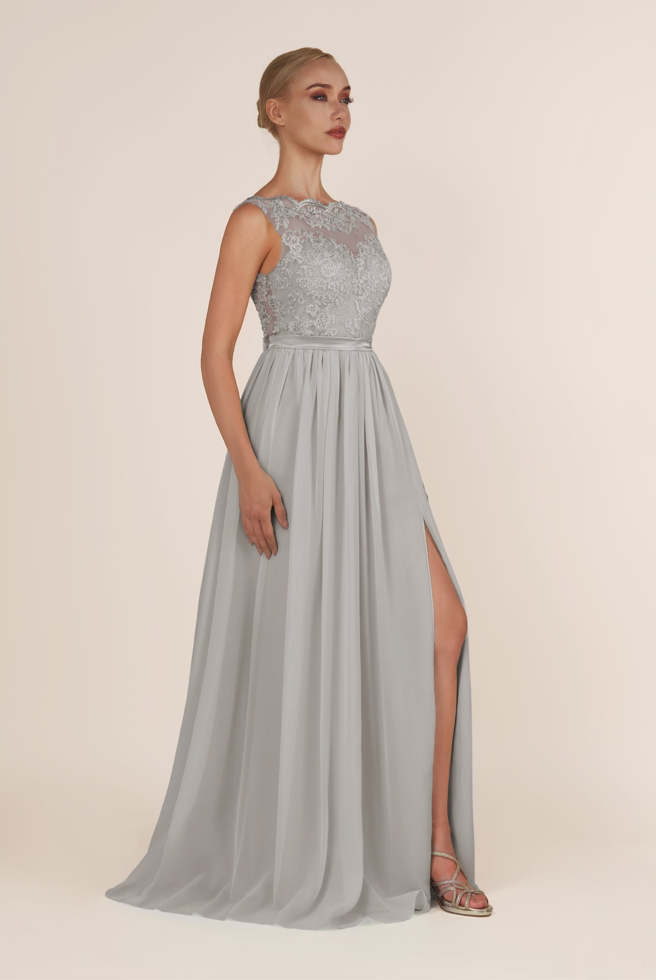 Sable | Silver - A-Line Illusion Neck Chiffon Long Bridesmaid Dress with Lace Appliques