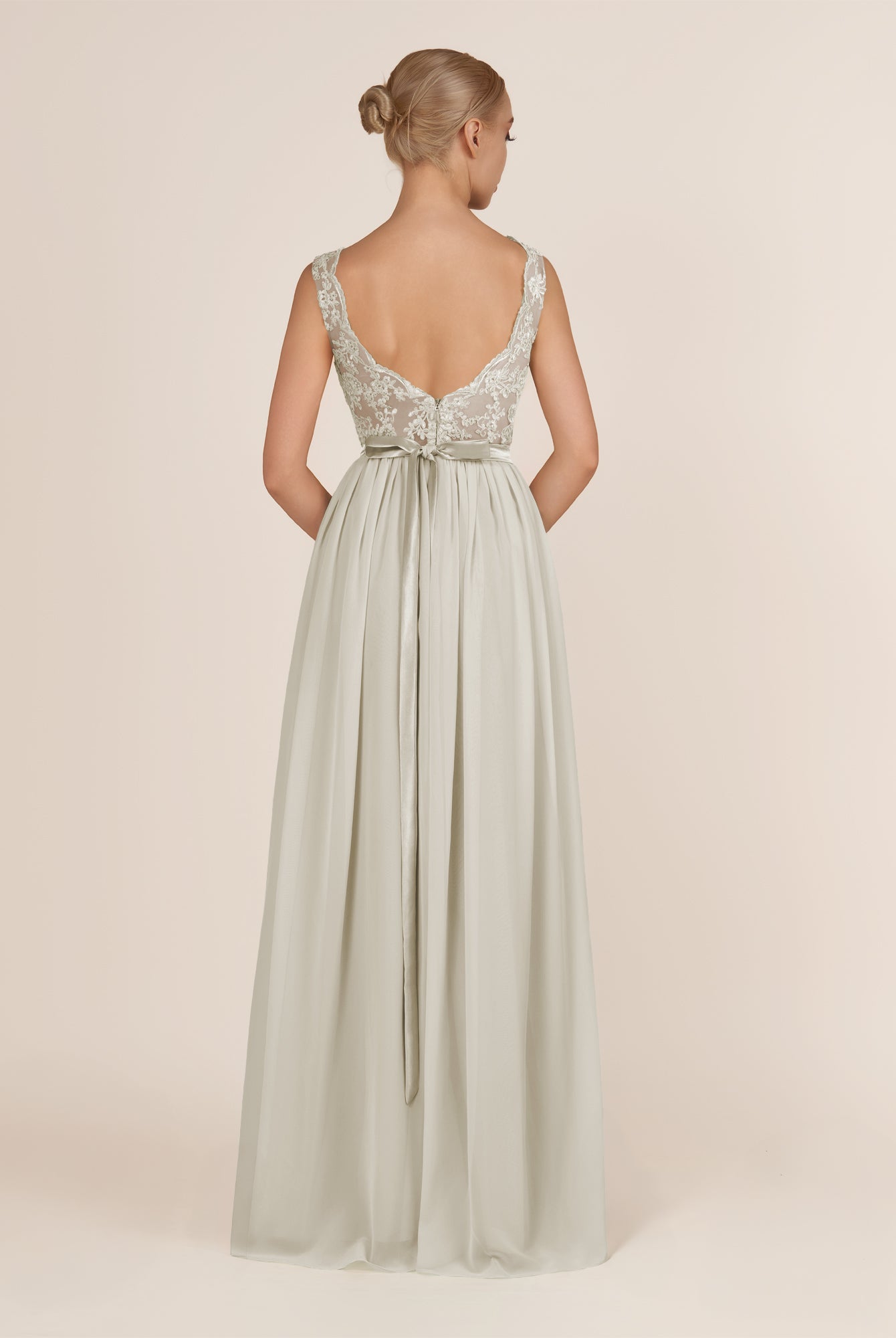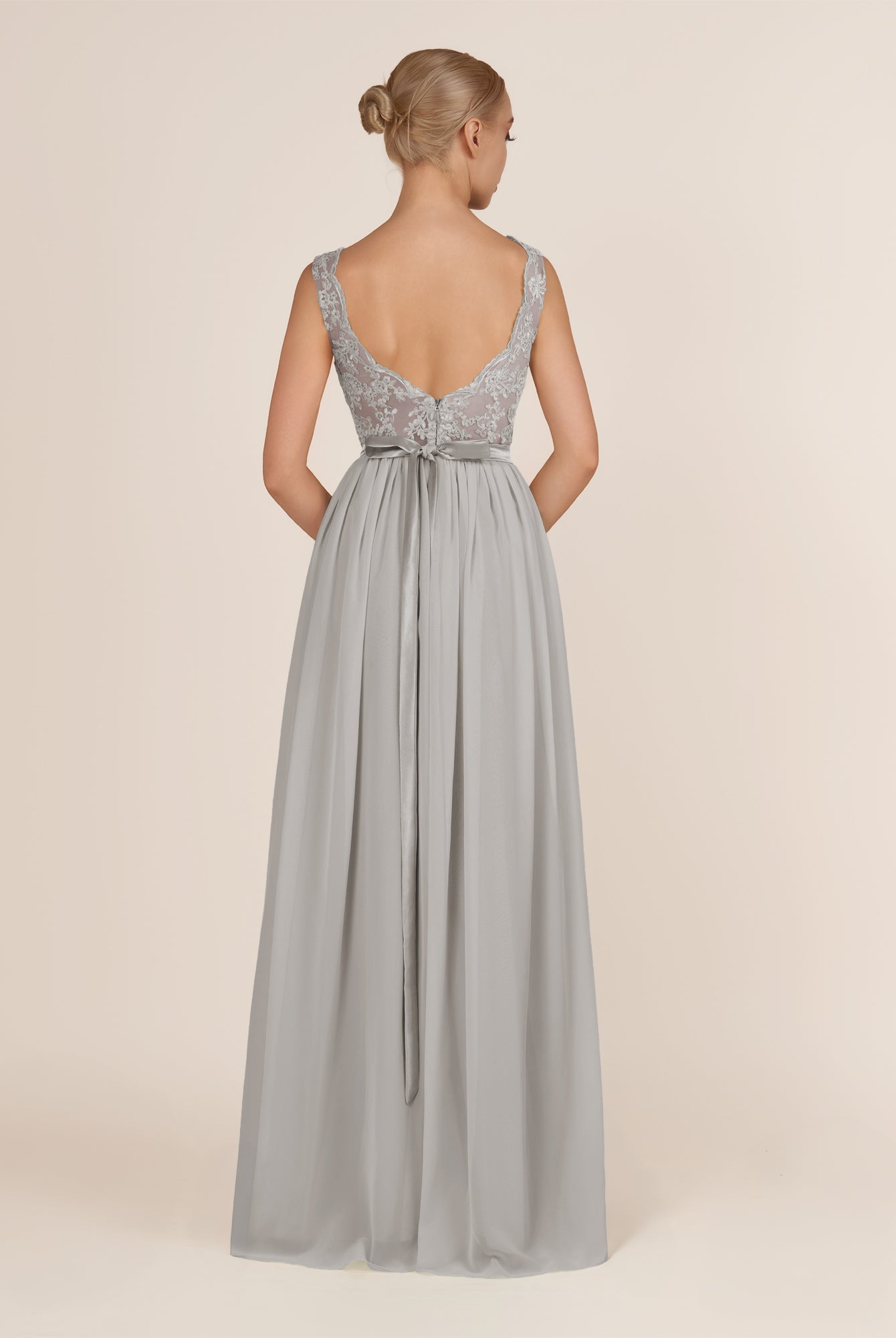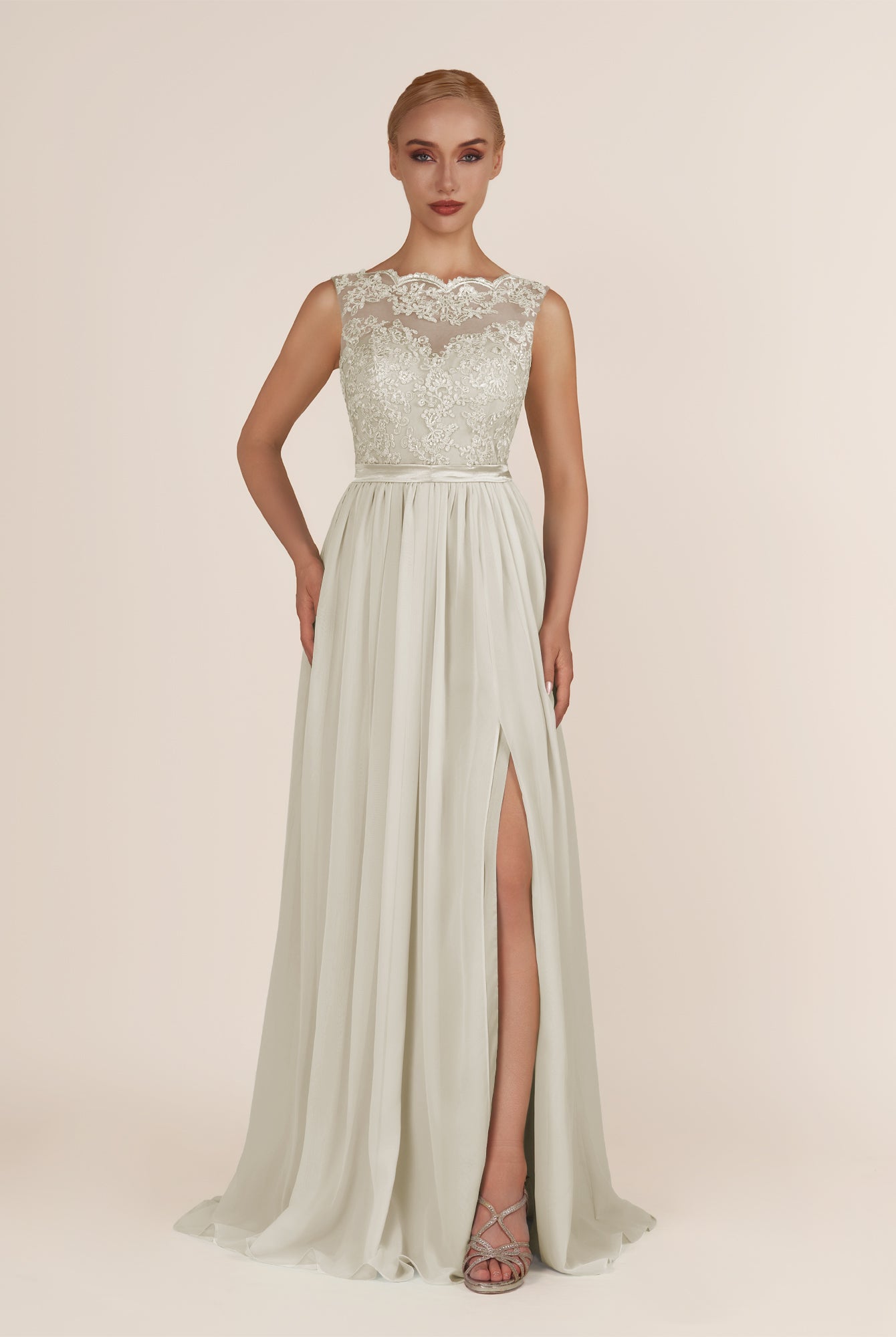 Sable | Silver - A-Line Illusion Neck Chiffon Long Bridesmaid Dress with Lace Appliques