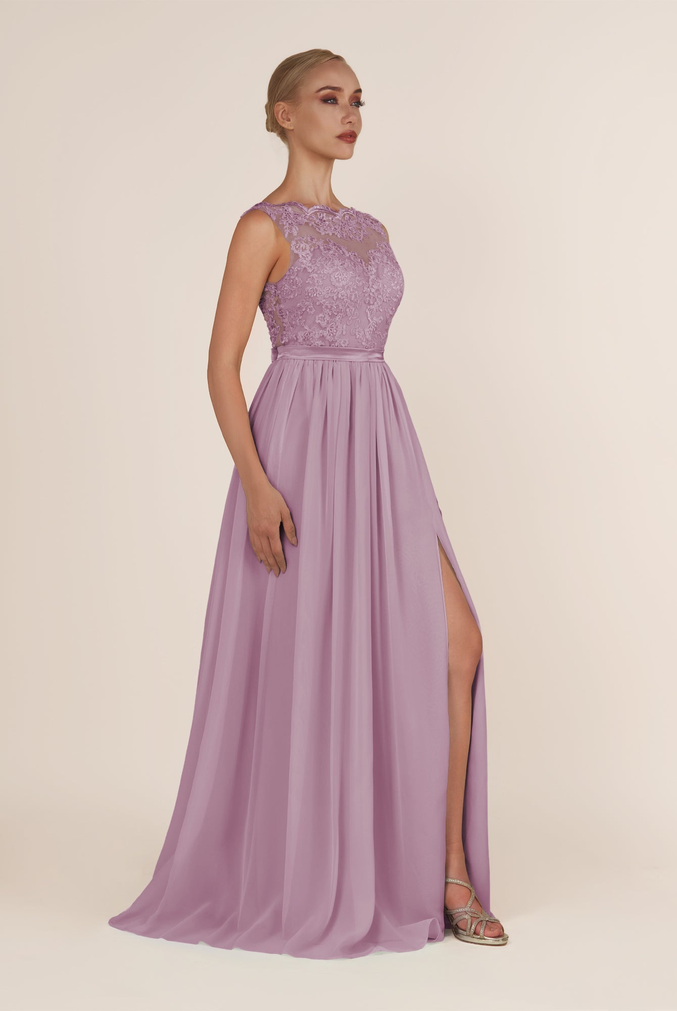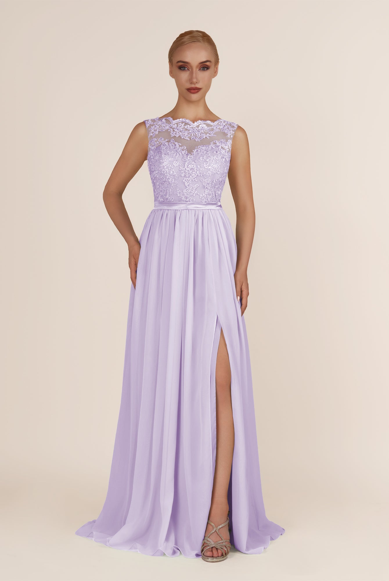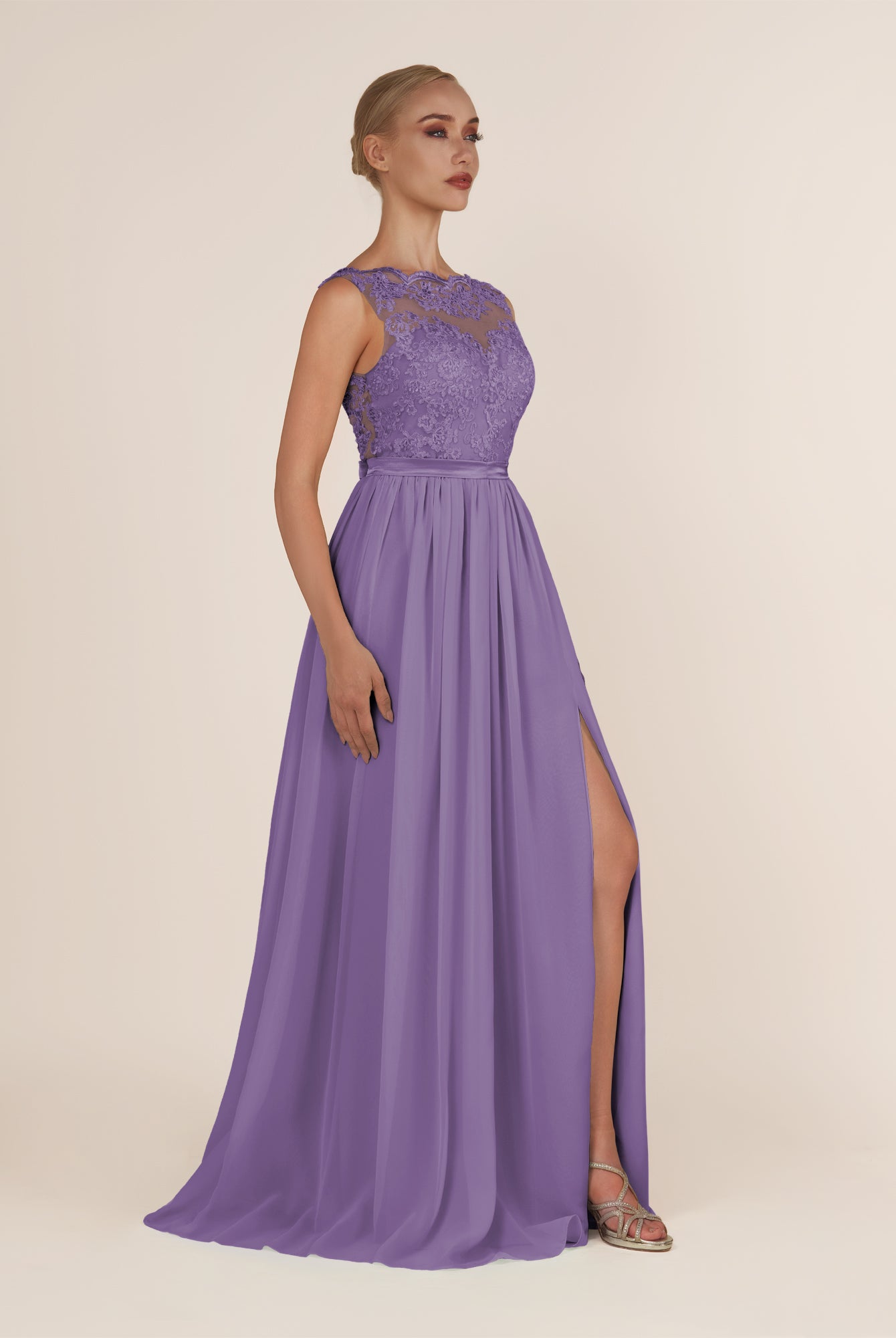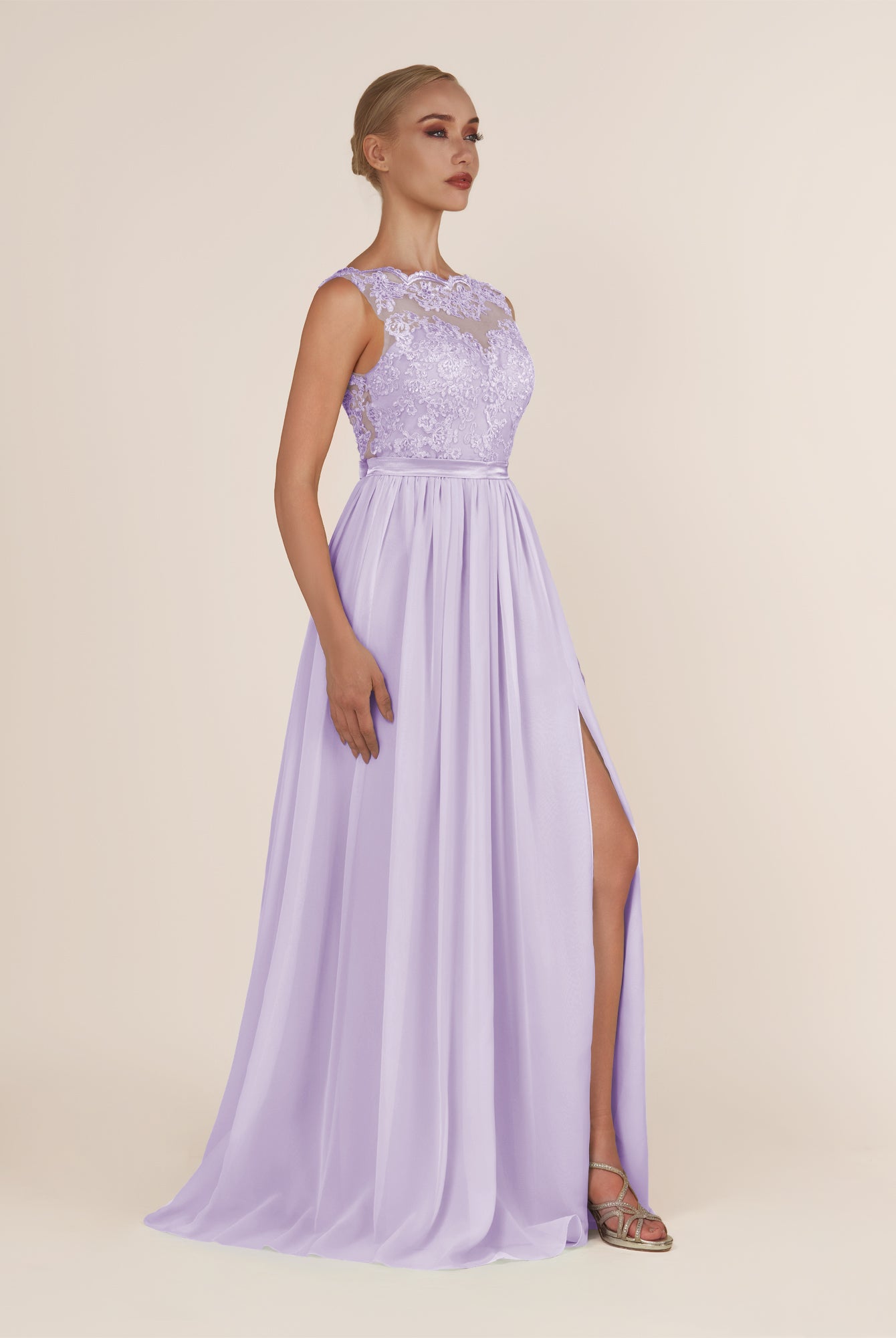 Sable | Lavender - A-Line Illusion Neck Chiffon Long Bridesmaid Dress with Lace Appliques