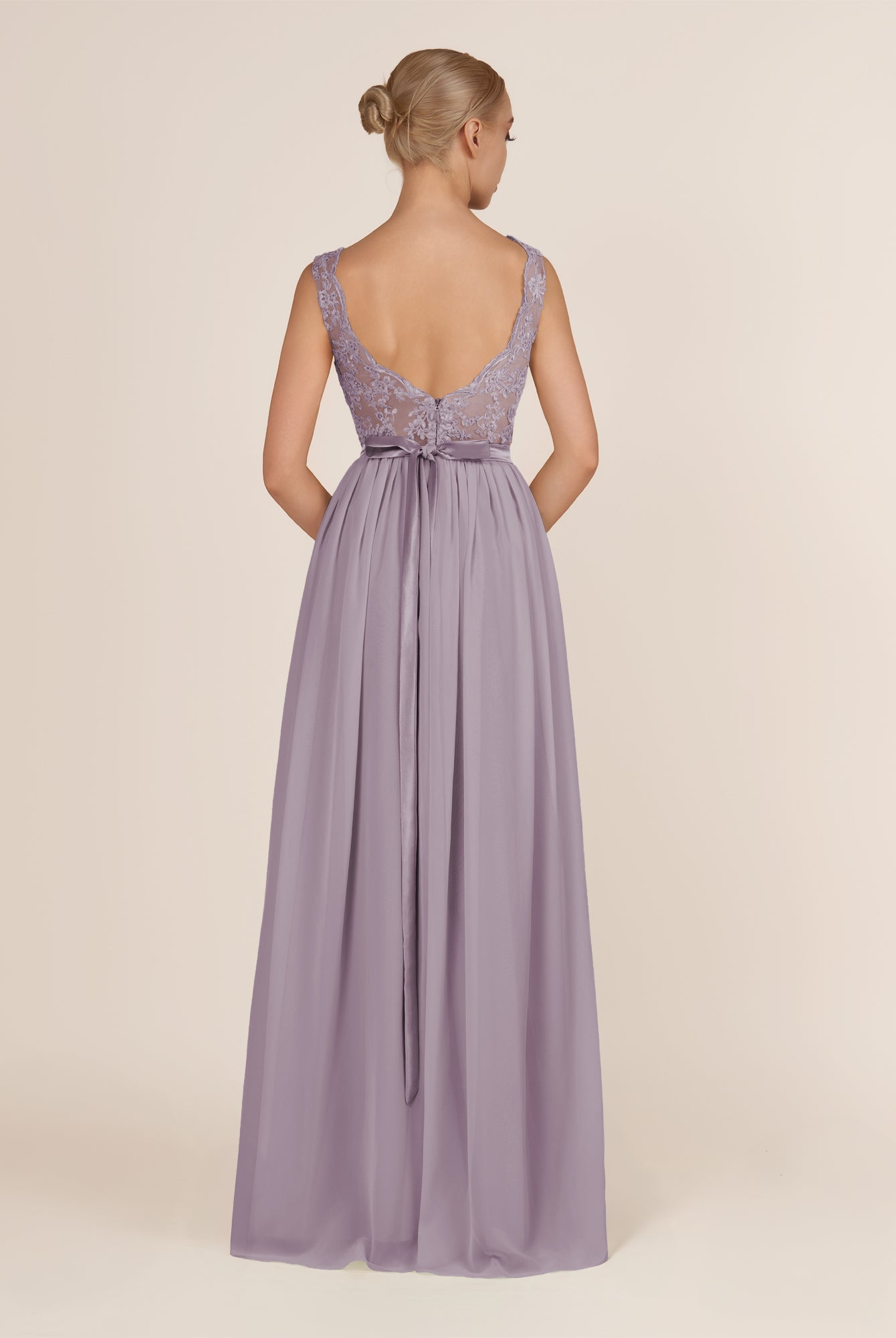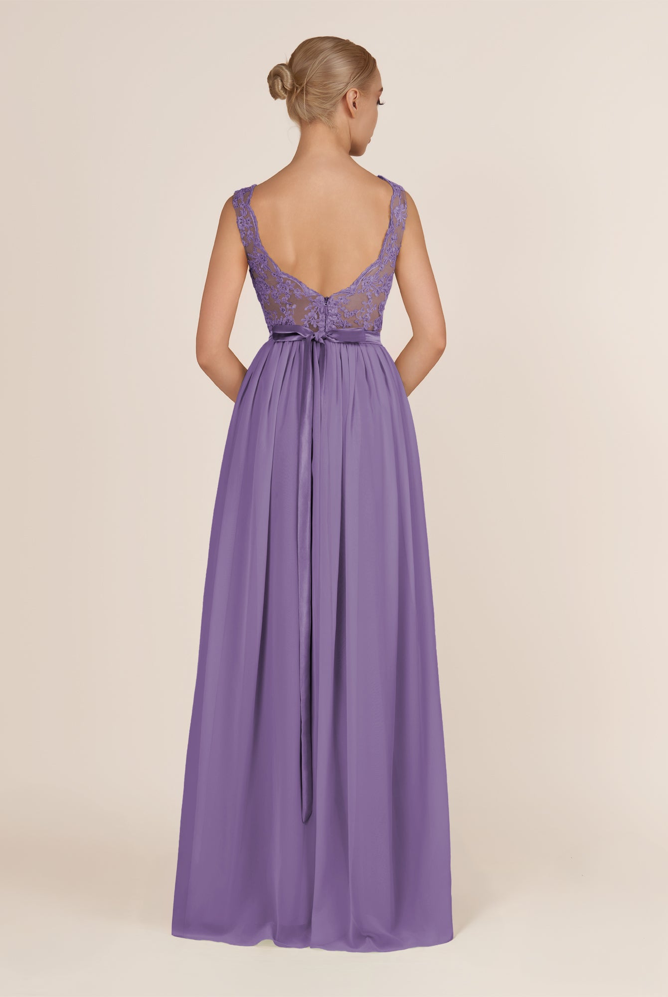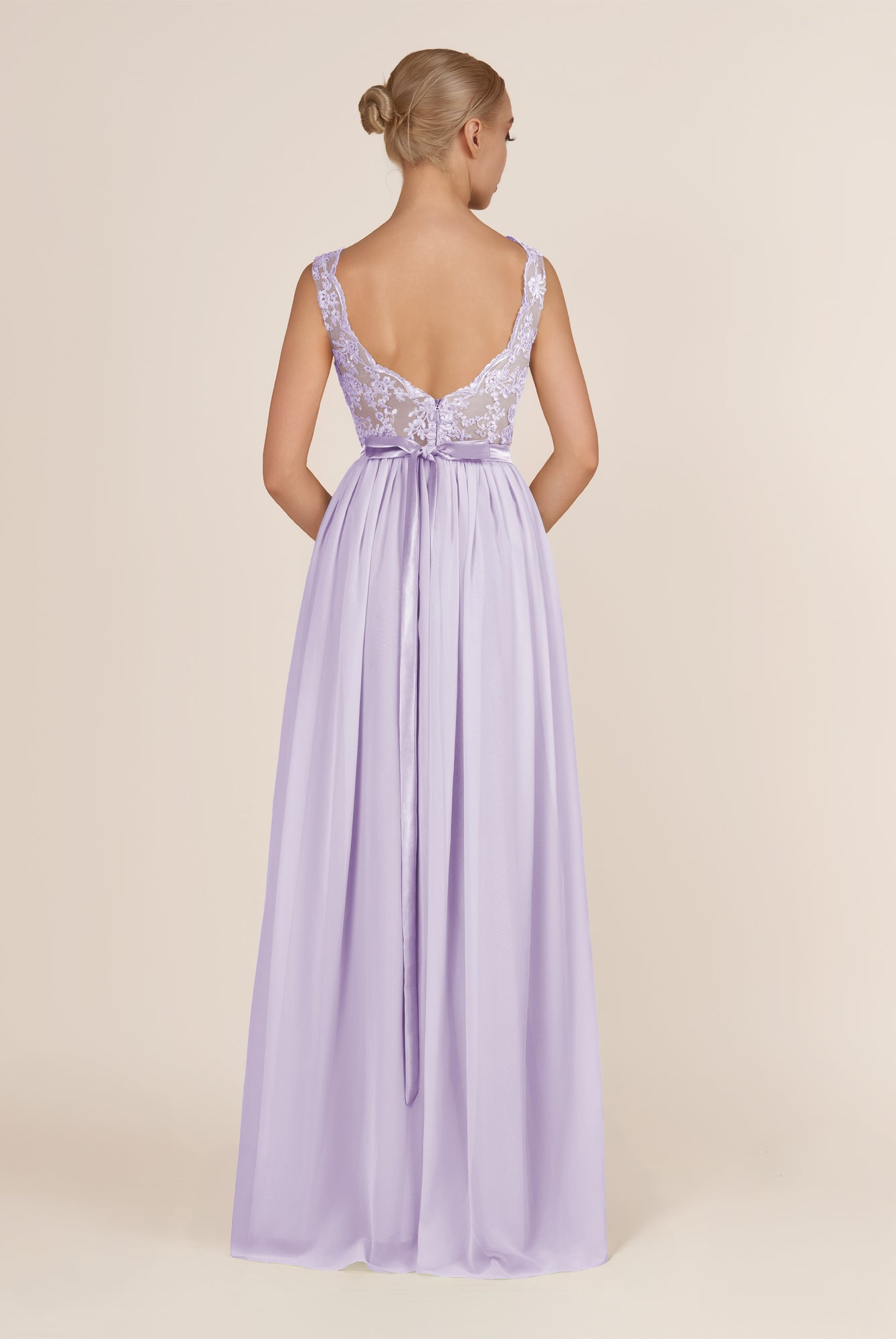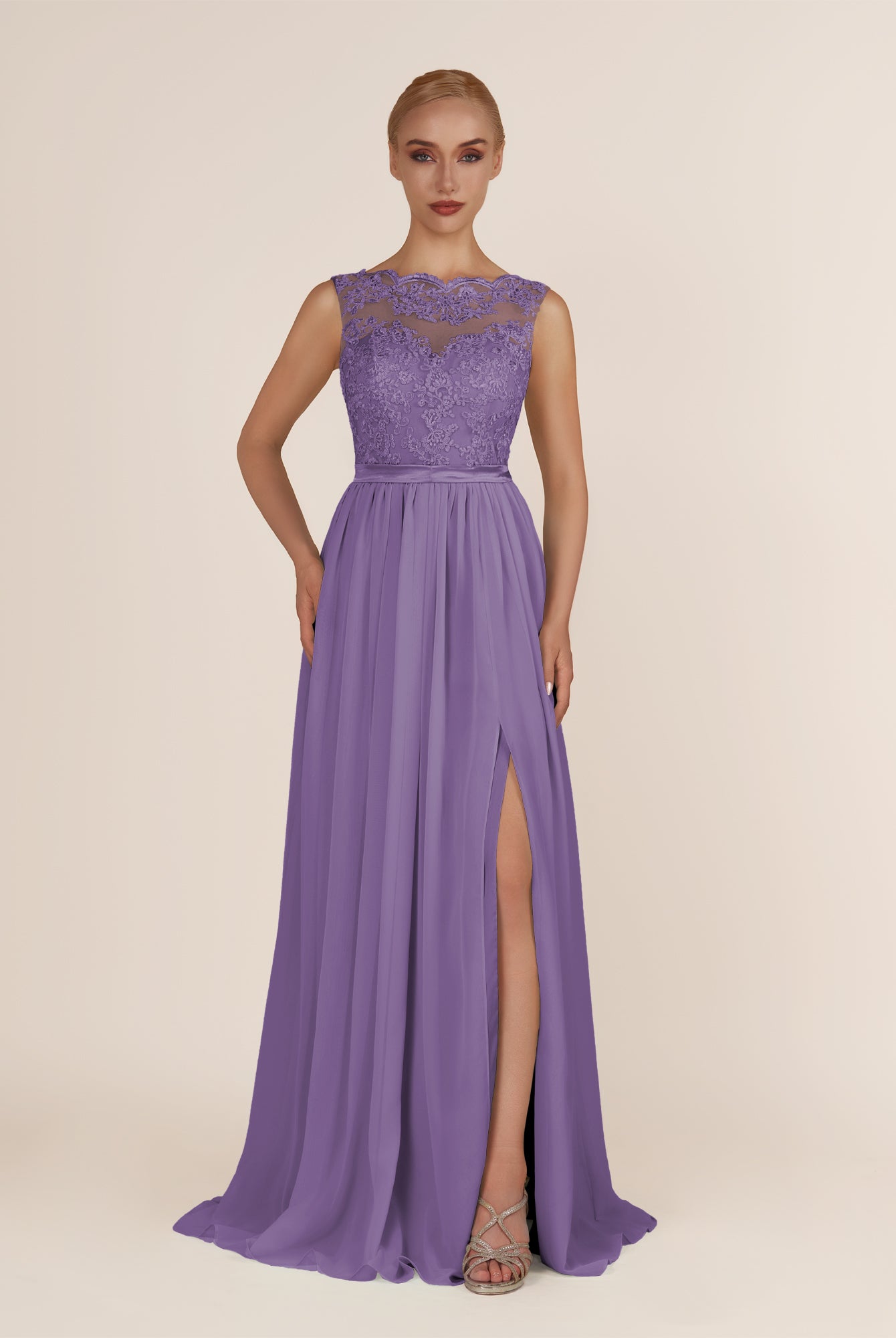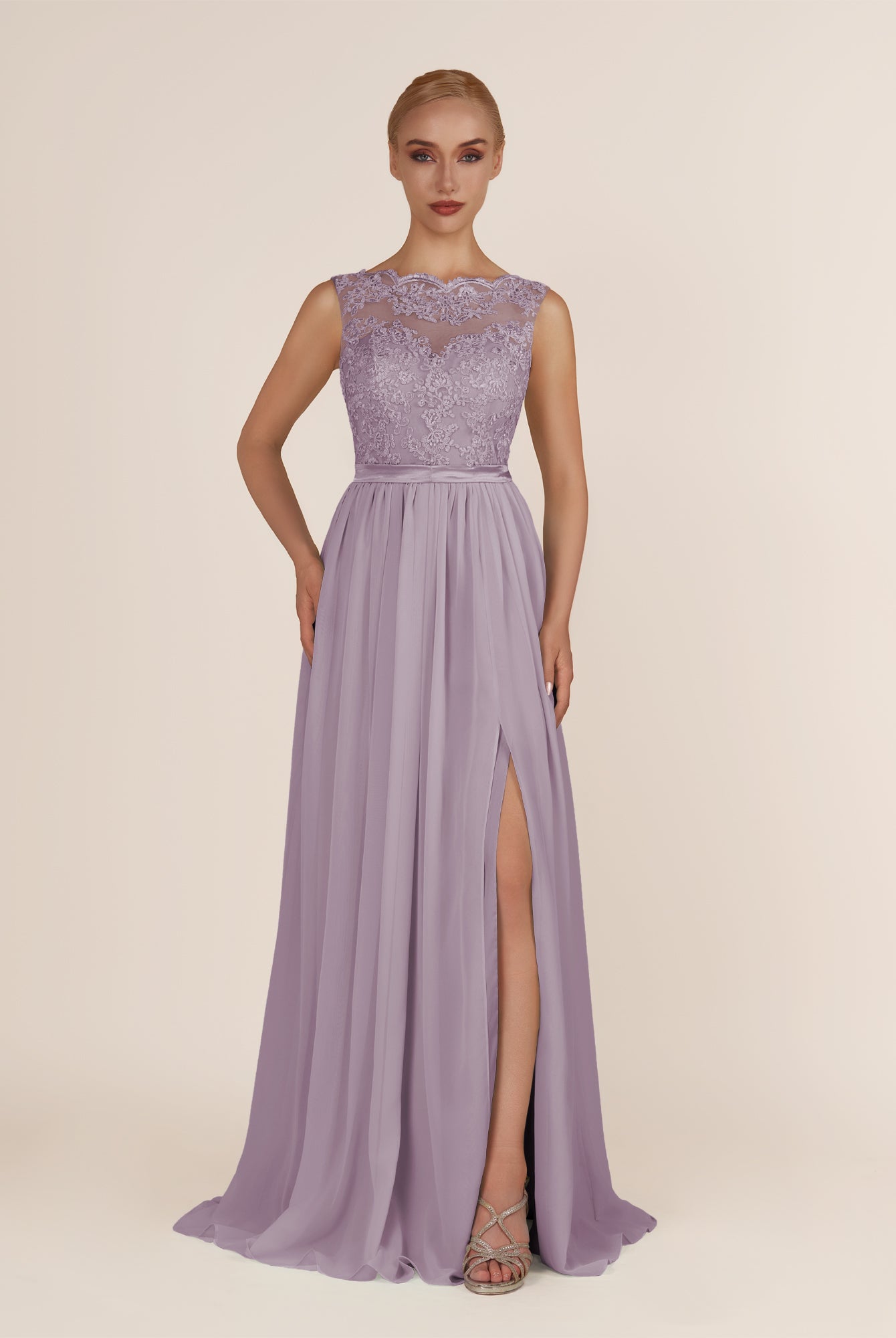 Sable | Lavender - A-Line Illusion Neck Chiffon Long Bridesmaid Dress with Lace Appliques