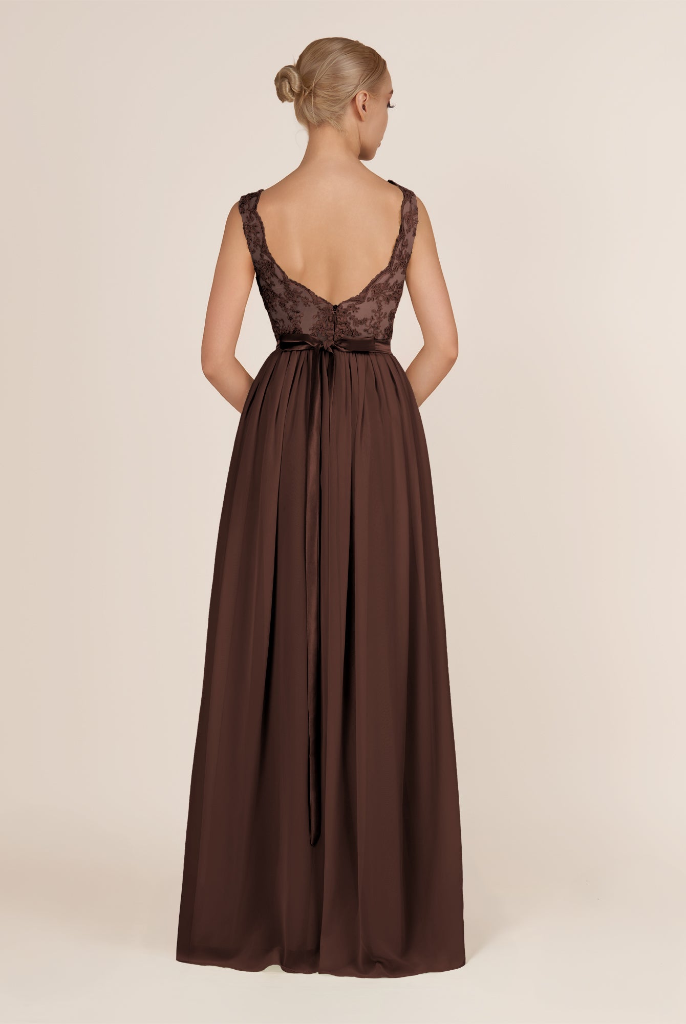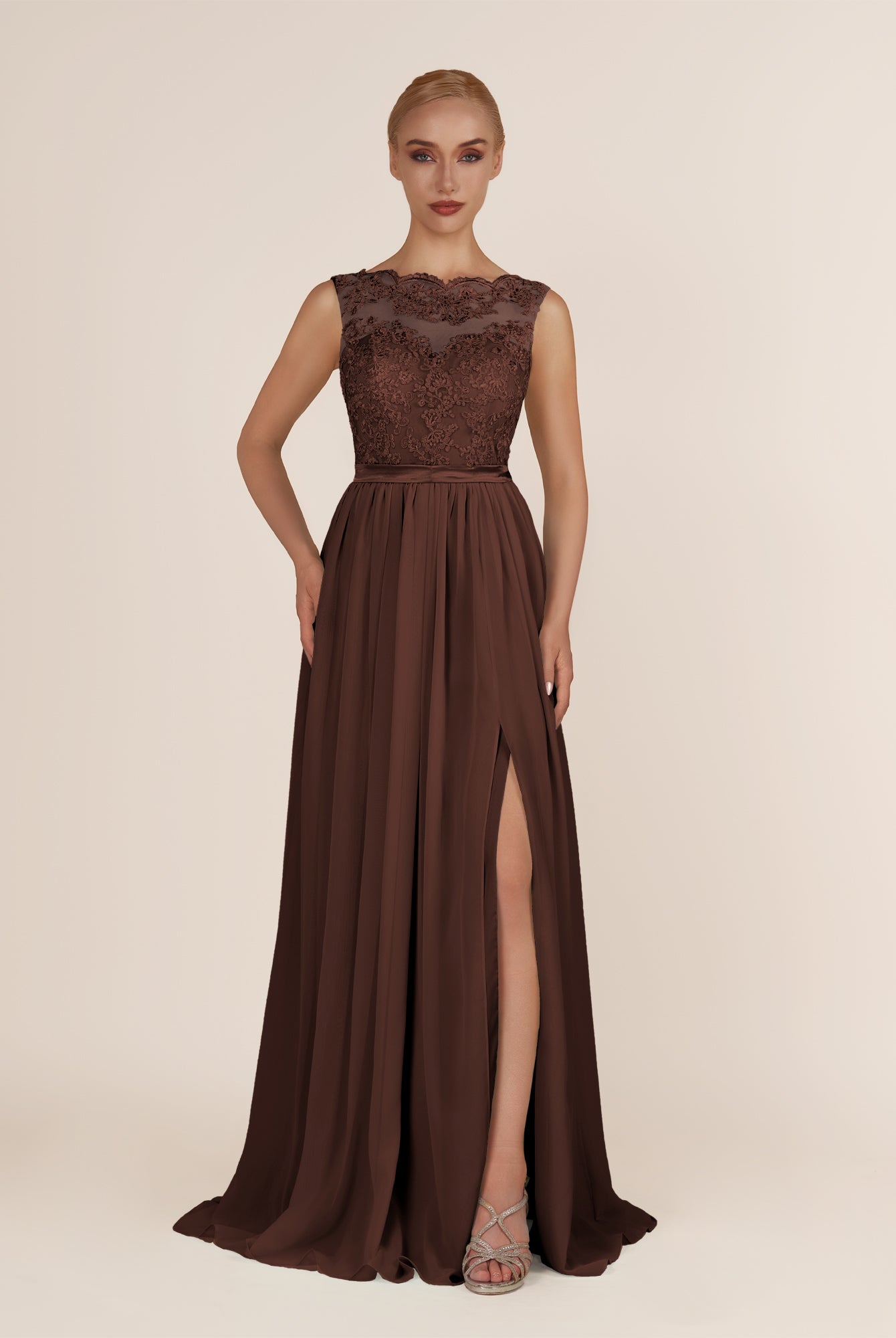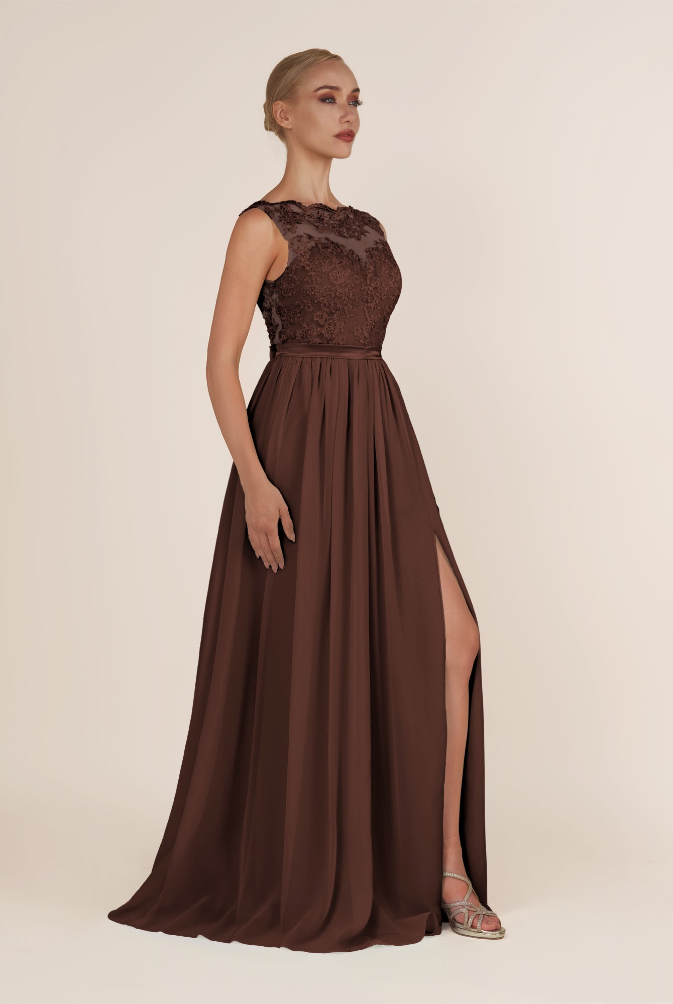 Sable | Espresso - A-Line Illusion Neck Chiffon Long Bridesmaid Dress with Lace Appliques