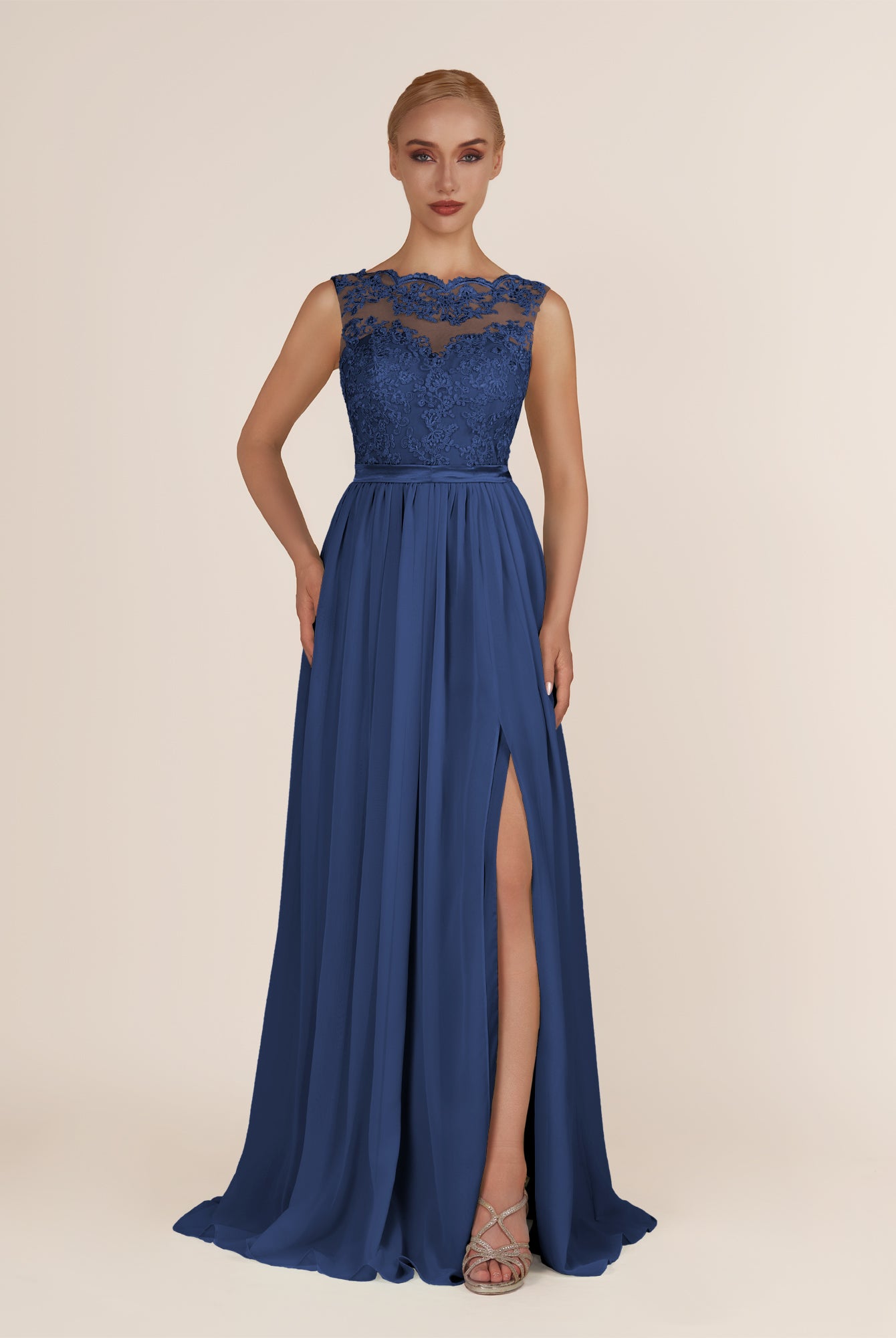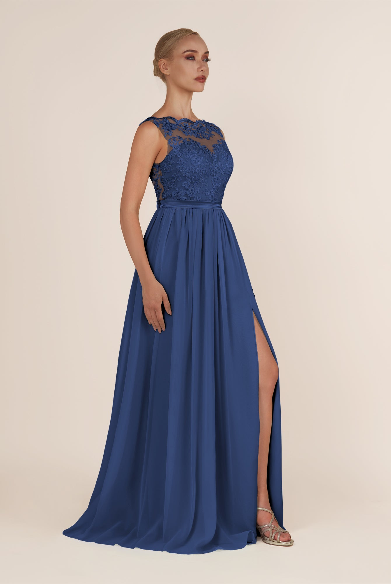 Sable | Dusk Blue - A-Line Illusion Neck Chiffon Long Bridesmaid Dress with Lace Appliques