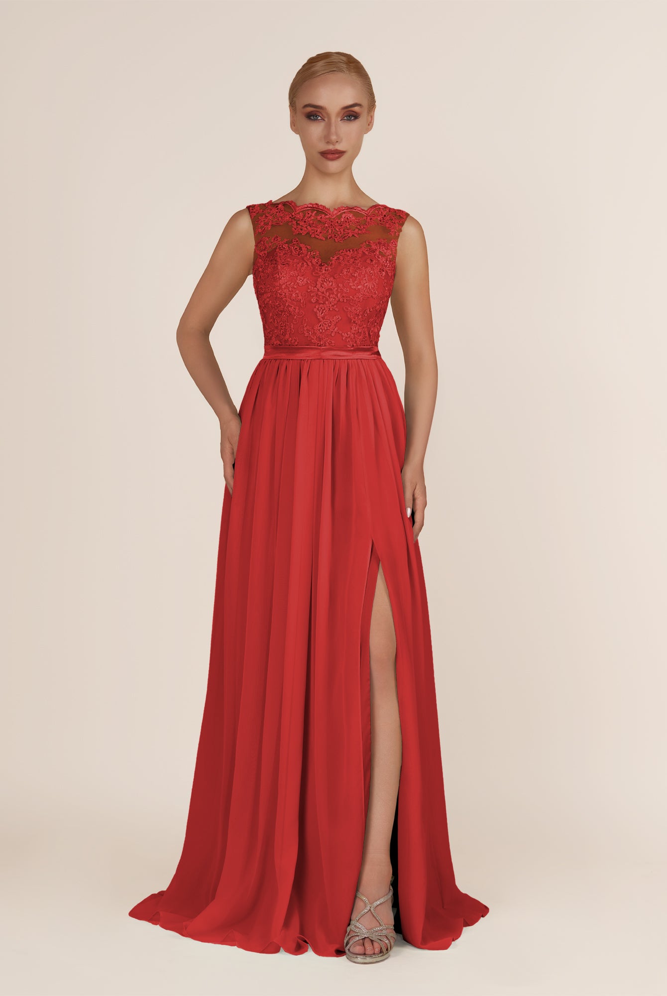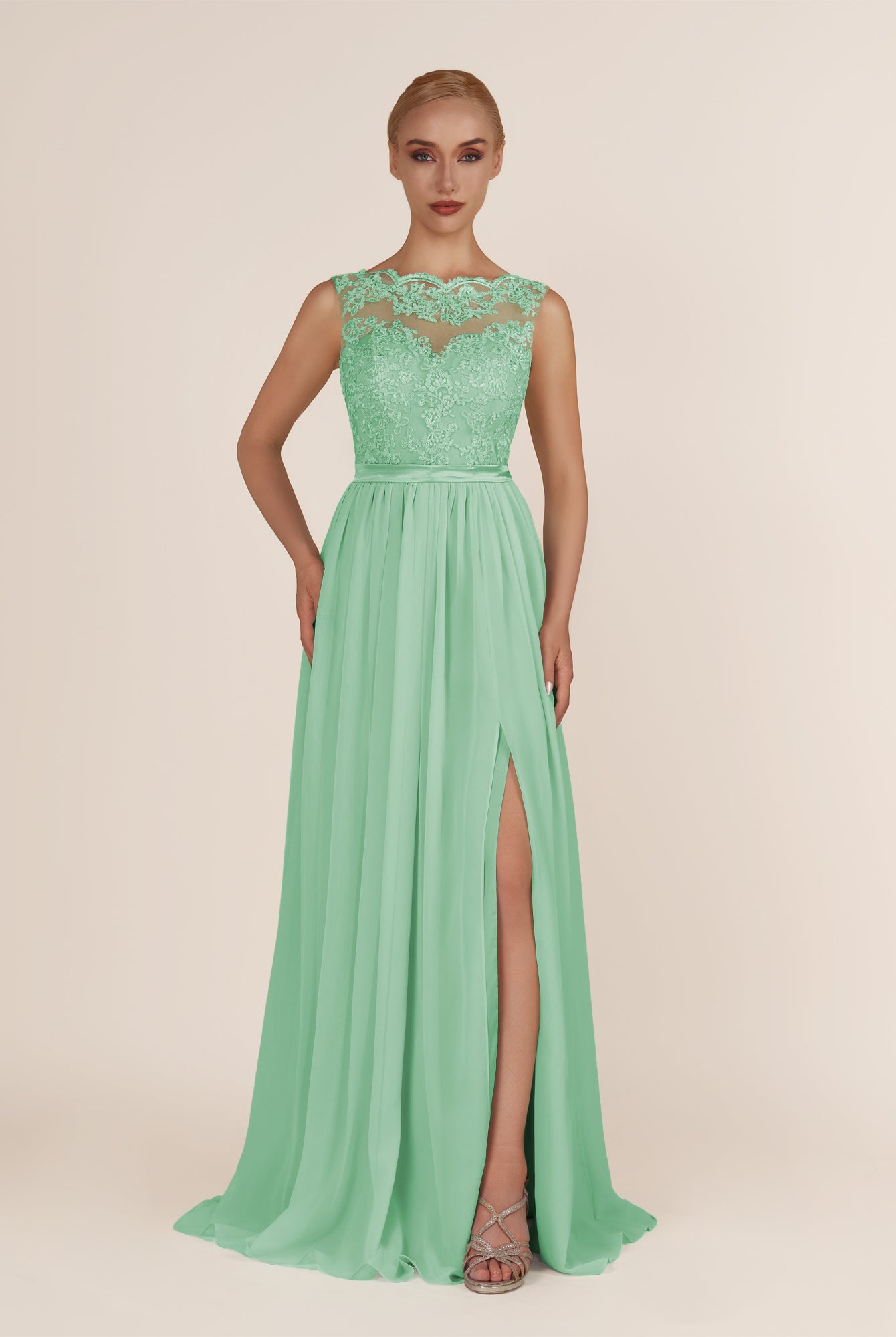 Sable | Tahiti - A-Line Illusion Neck Chiffon Long Bridesmaid Dress with Lace Appliques