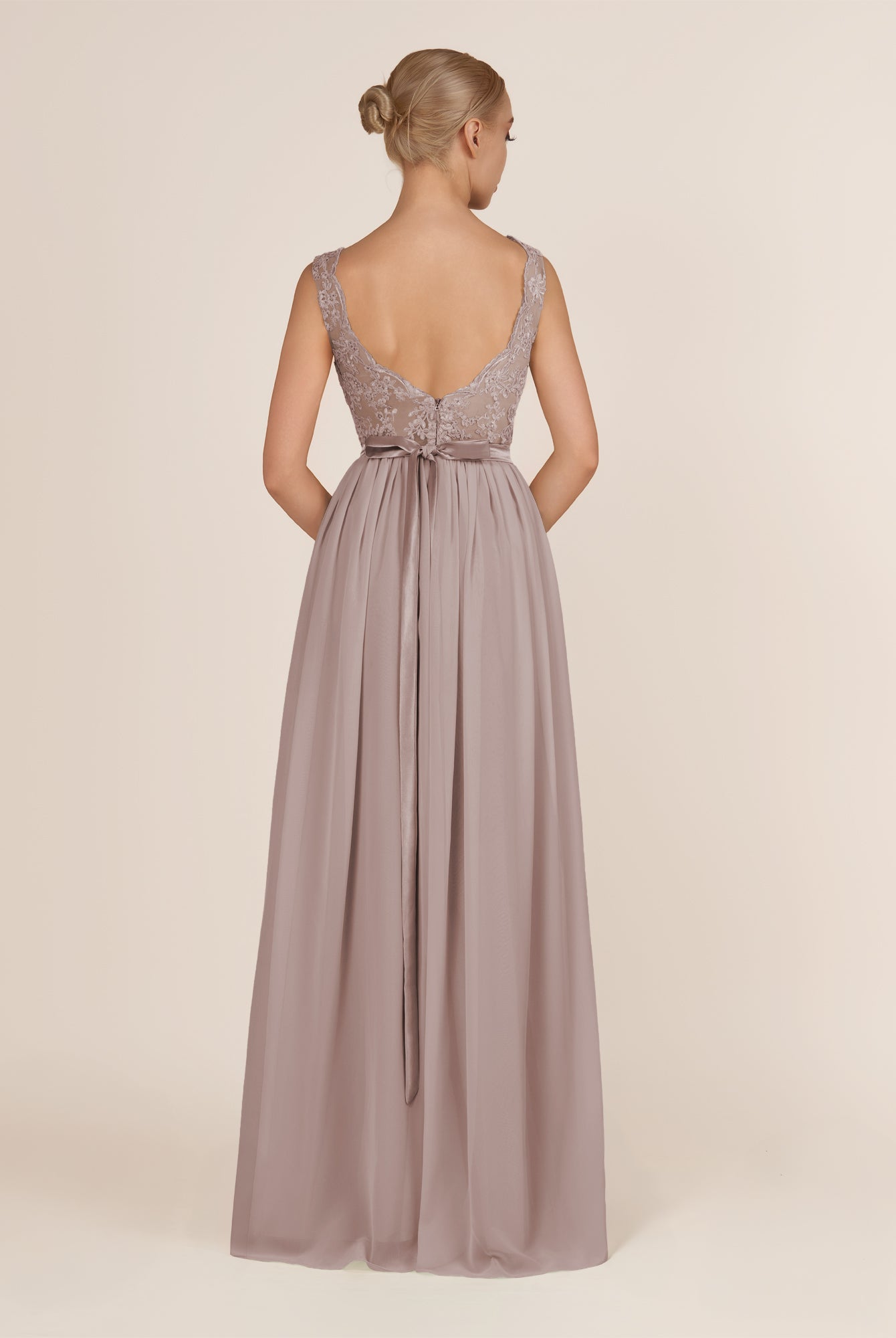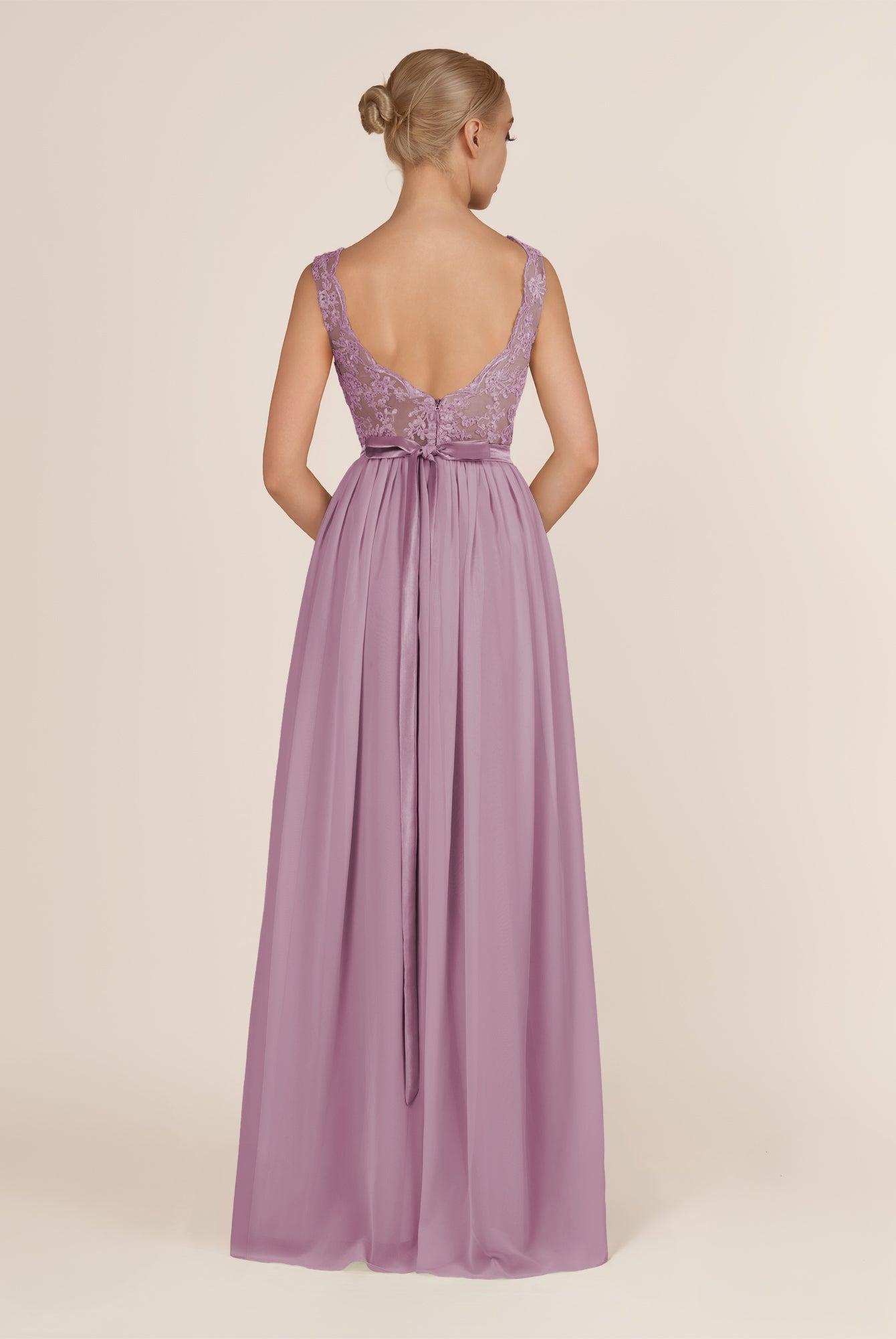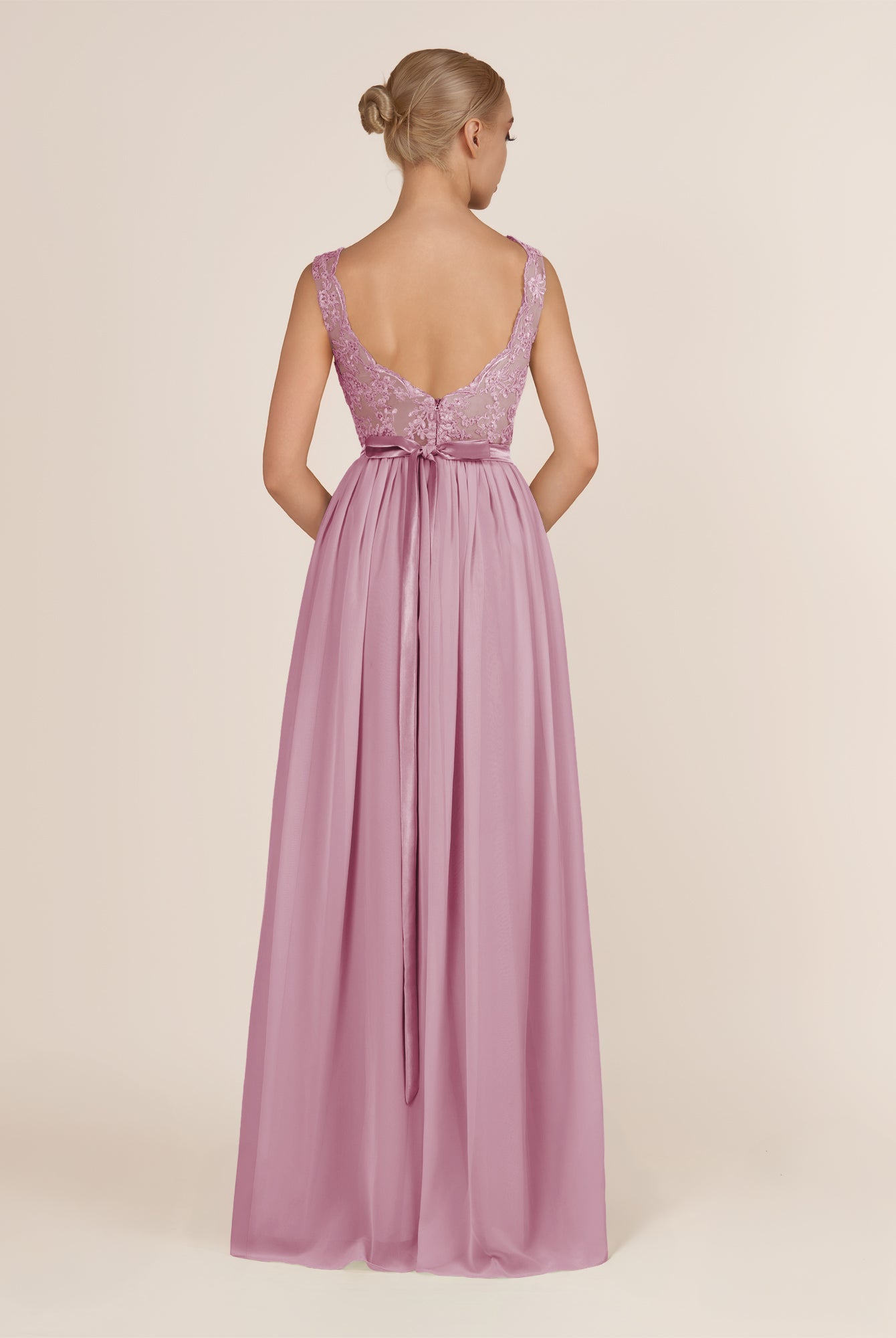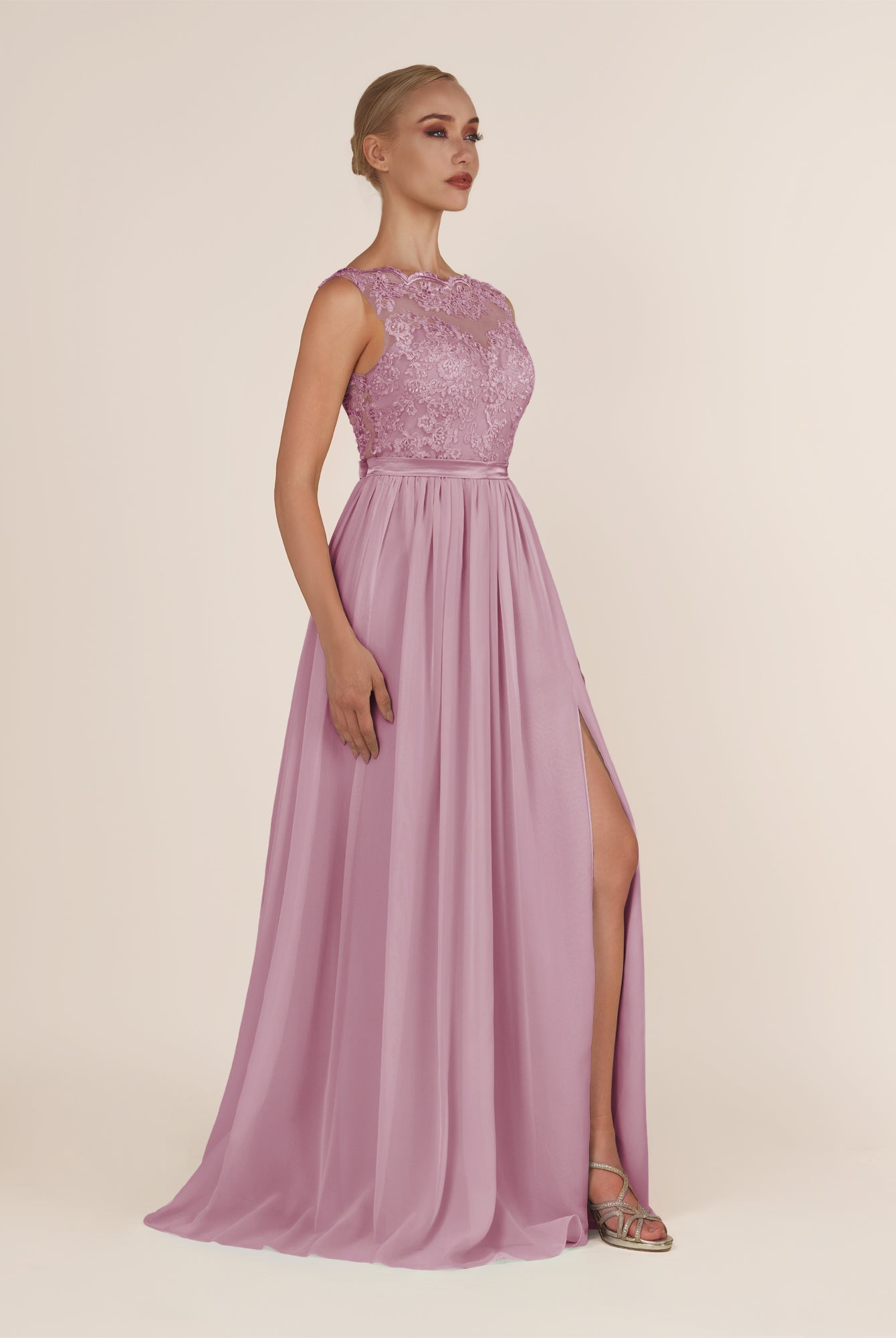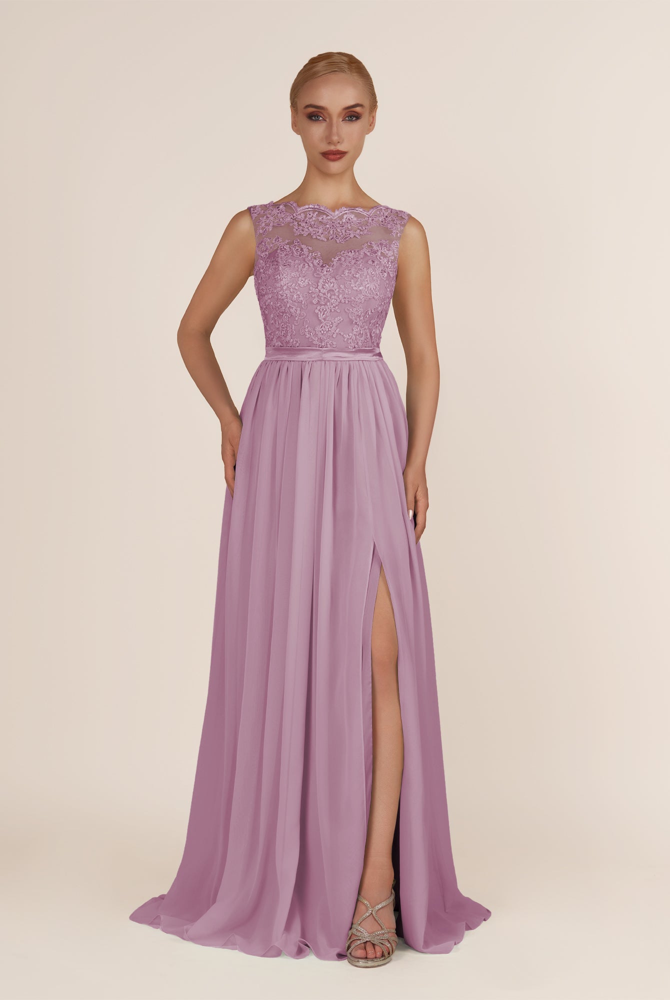 Sable | Vintage Mauve - A-Line Illusion Neck Chiffon Long Bridesmaid Dress with Lace Appliques