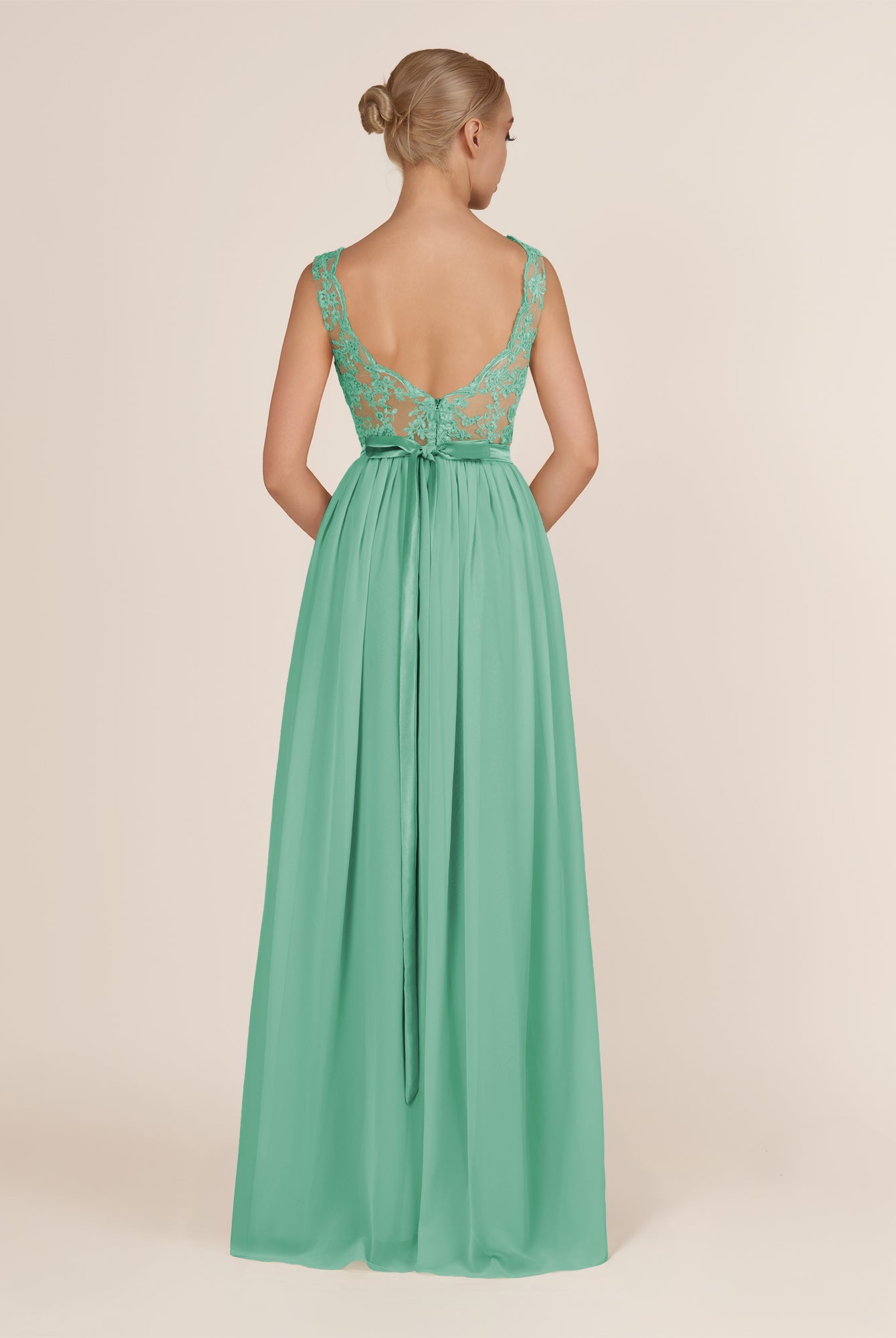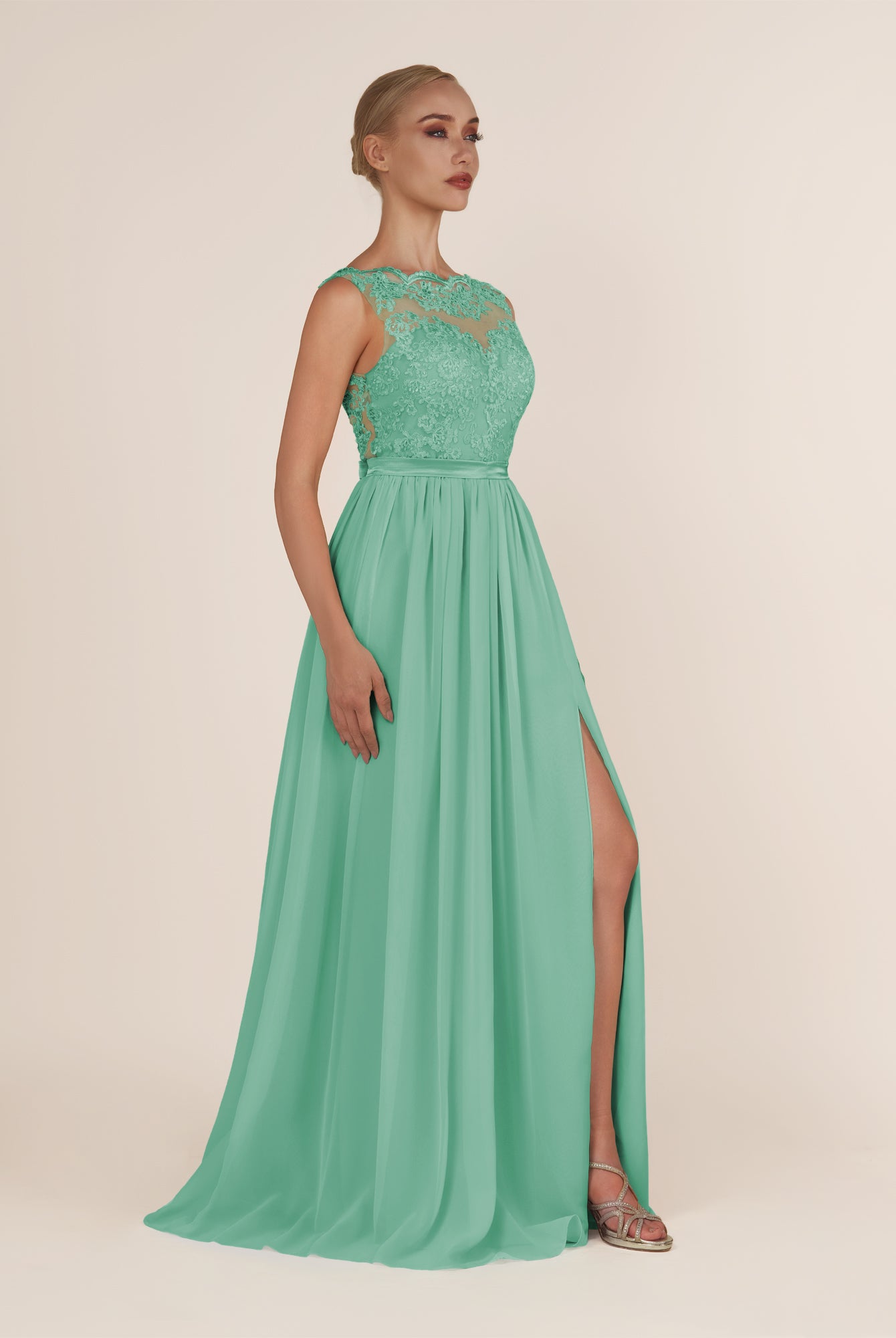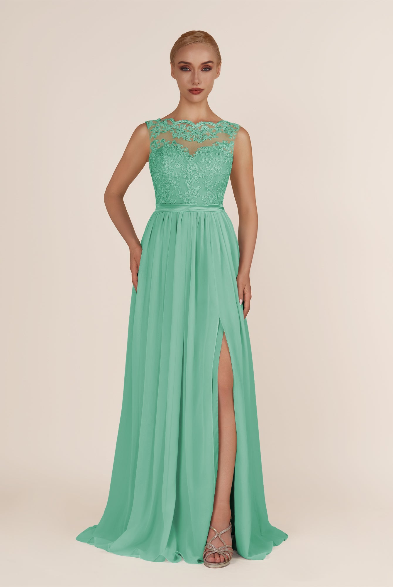Sable | Turquoise - A-Line Illusion Neck Chiffon Long Bridesmaid Dress with Lace Appliques