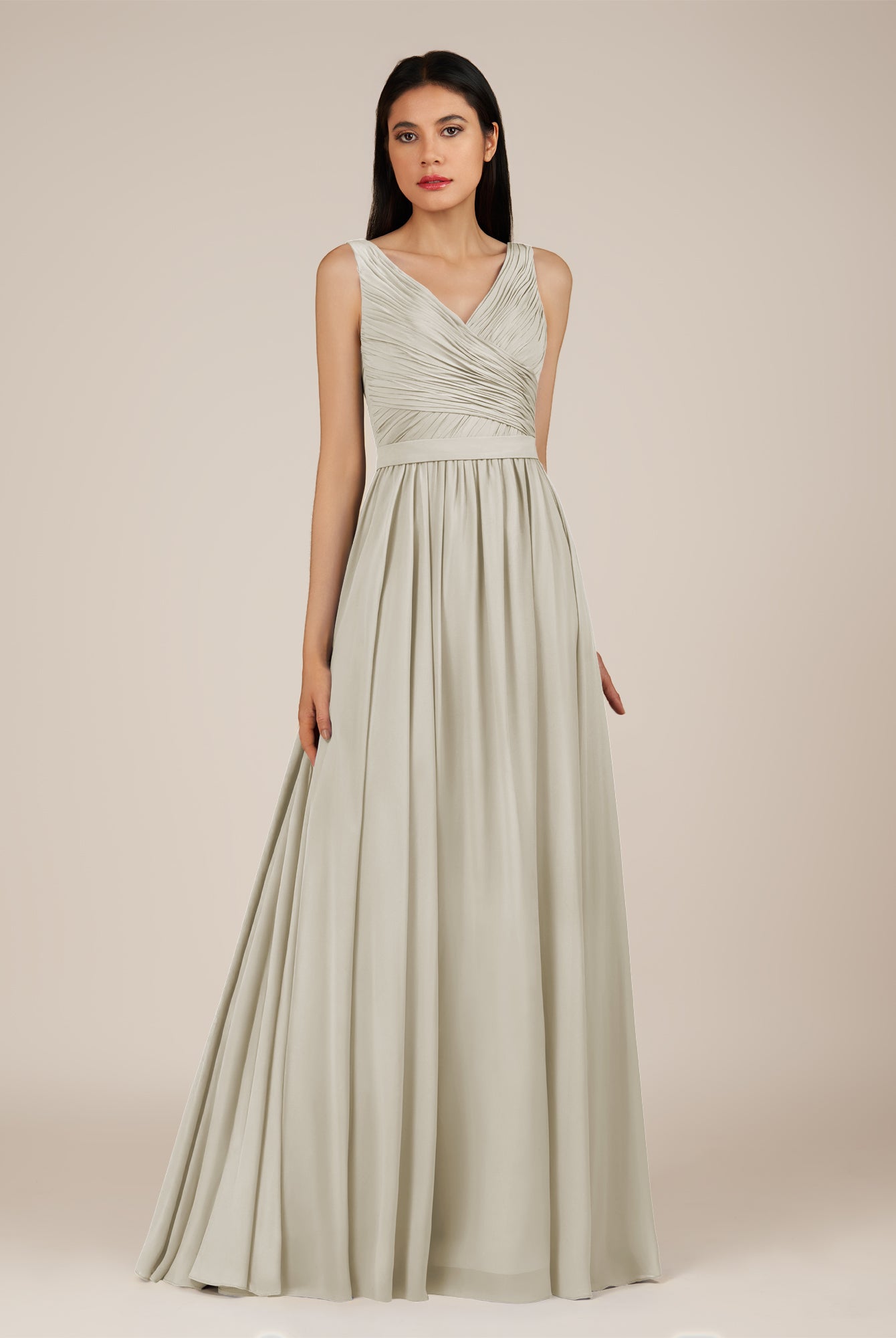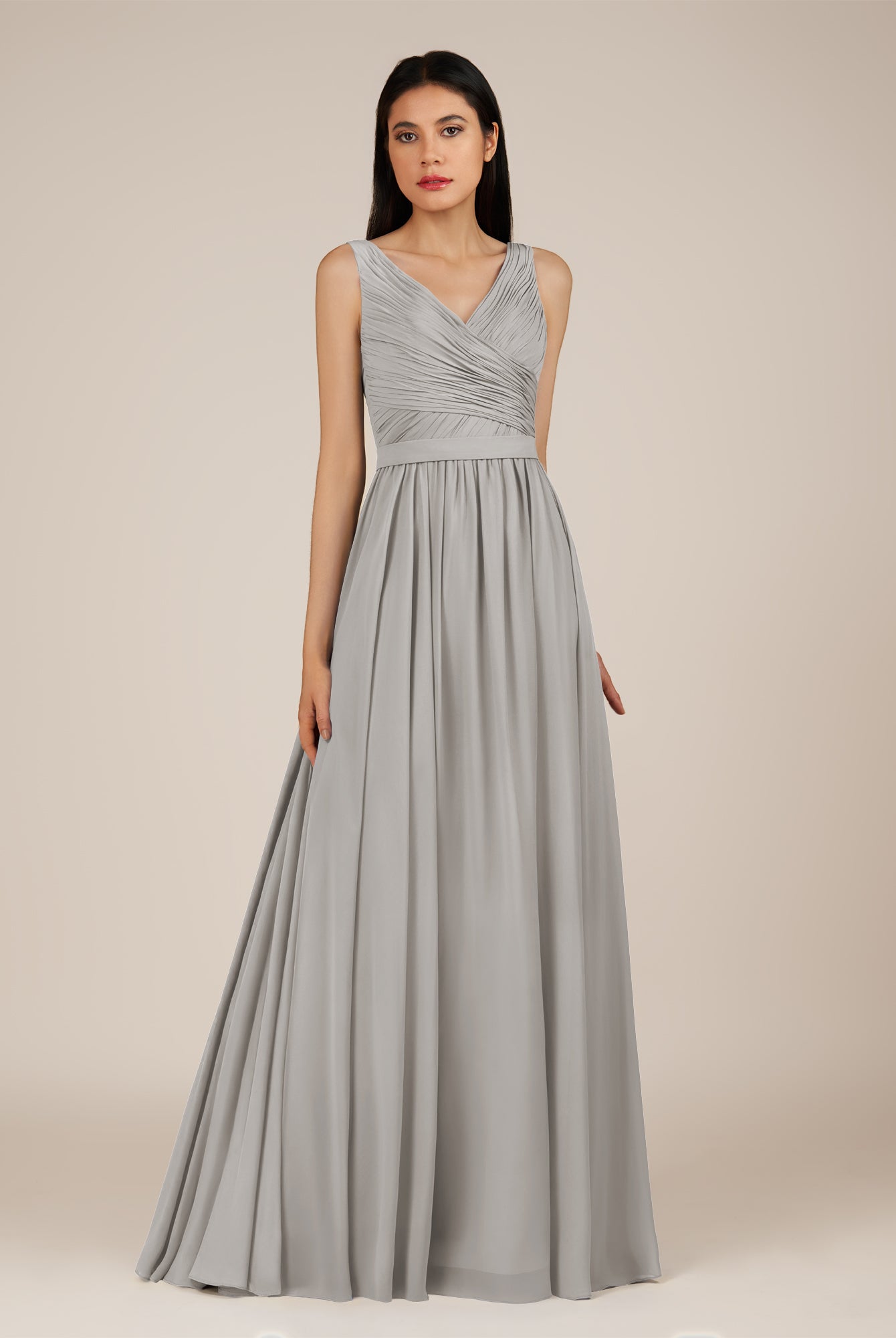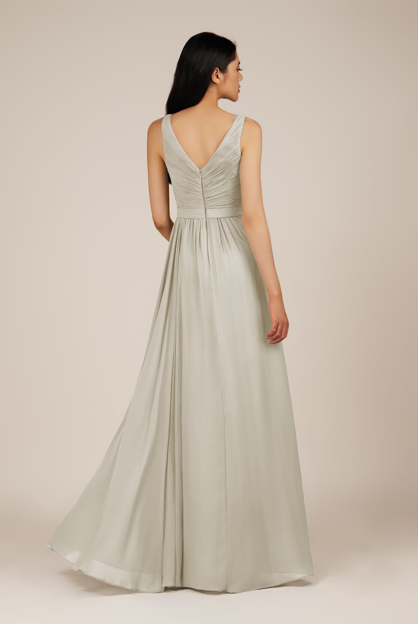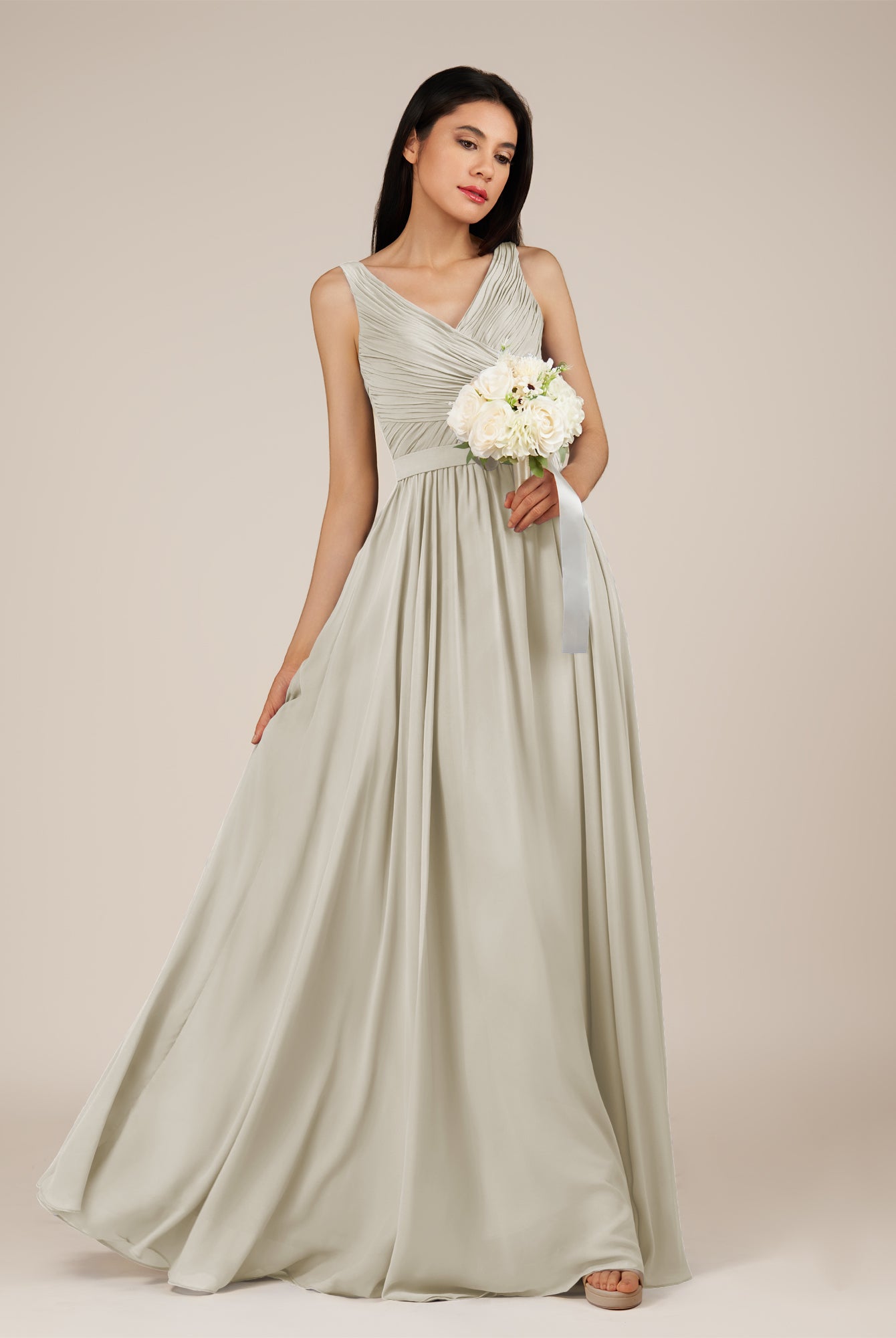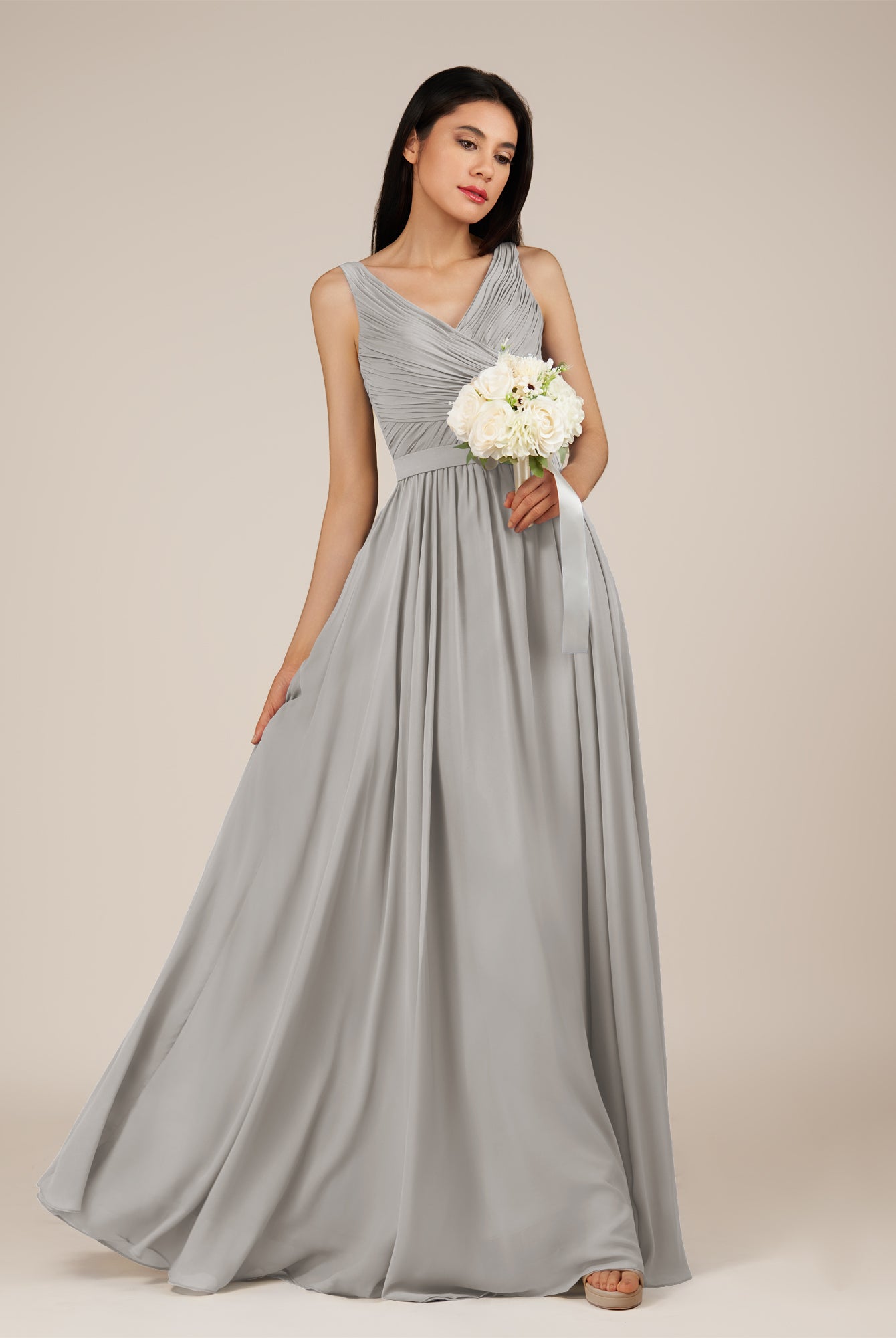 Lysander | Silver - A Line Chiffon V Neck Pleated Long Bridesmaid Dress
