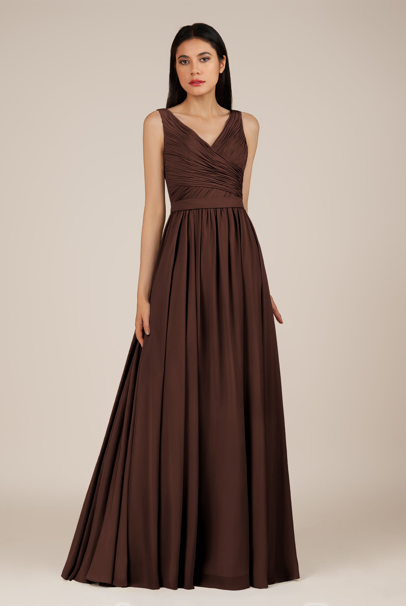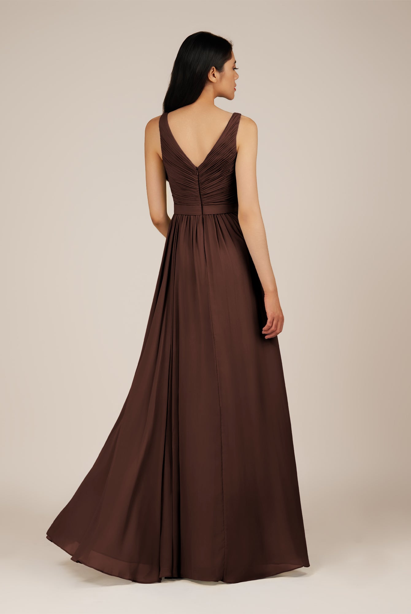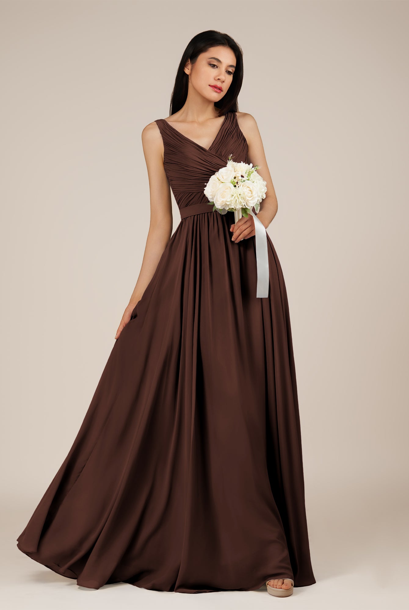 Lysander | Espresso - A Line Chiffon V Neck Pleated Long Bridesmaid Dress