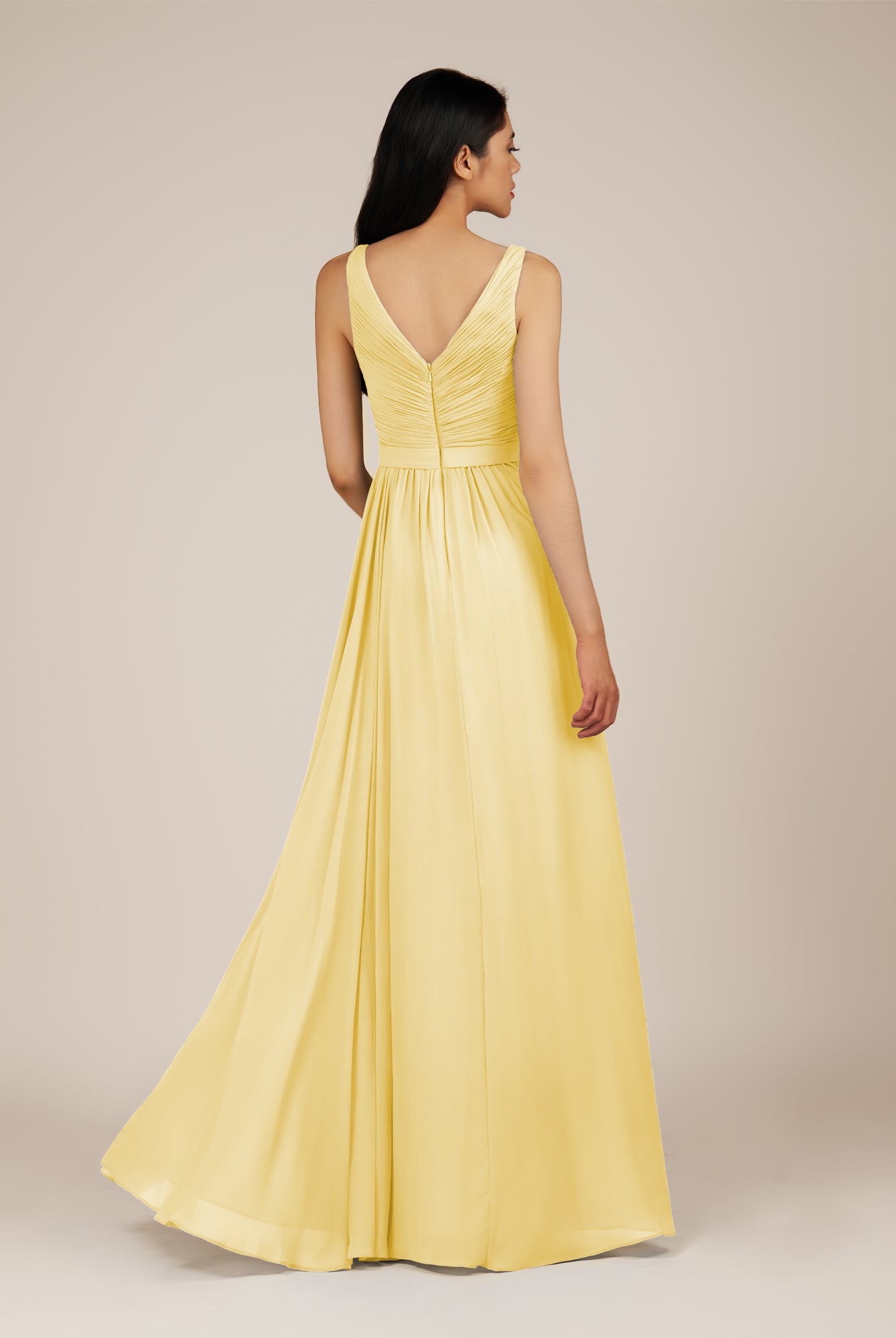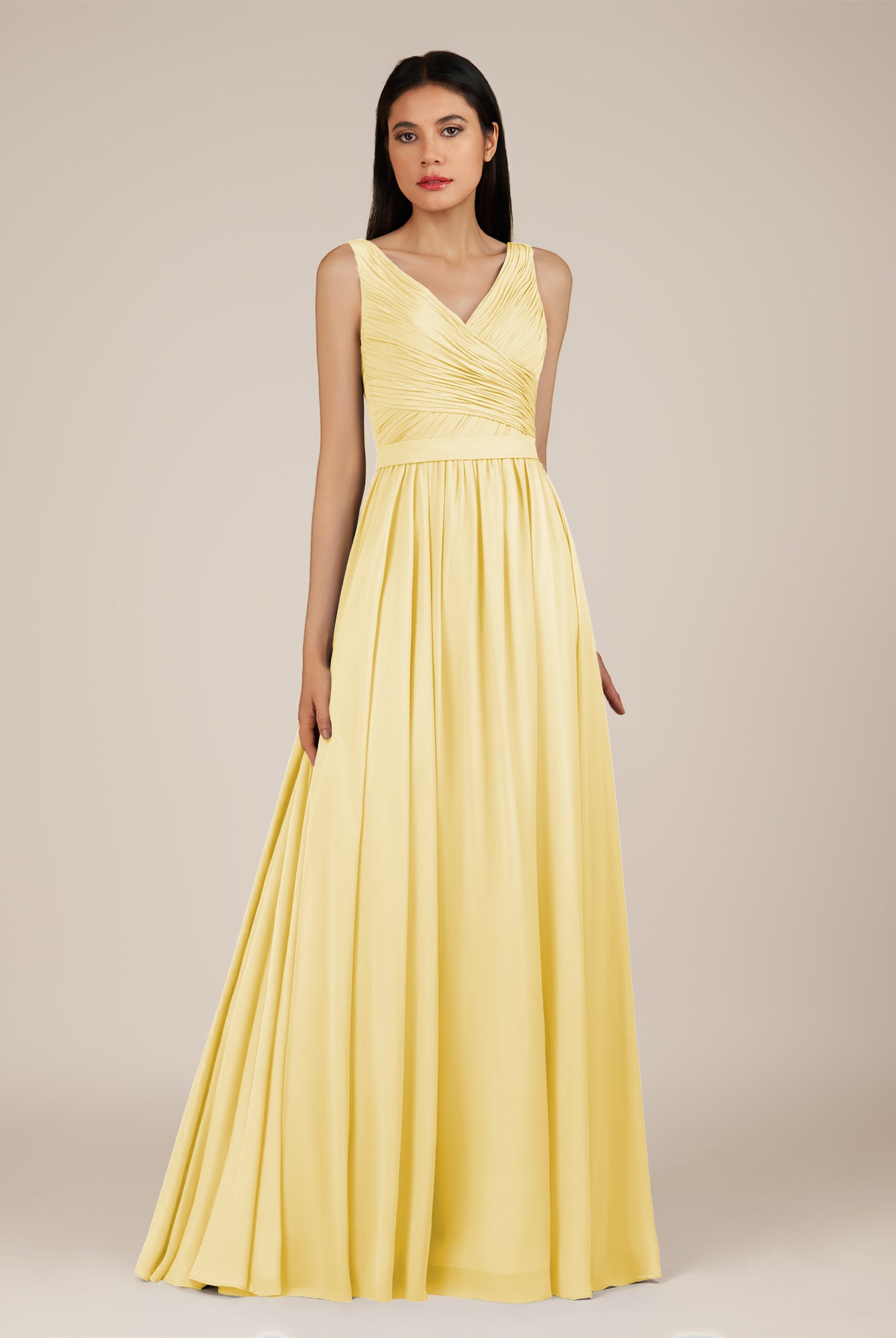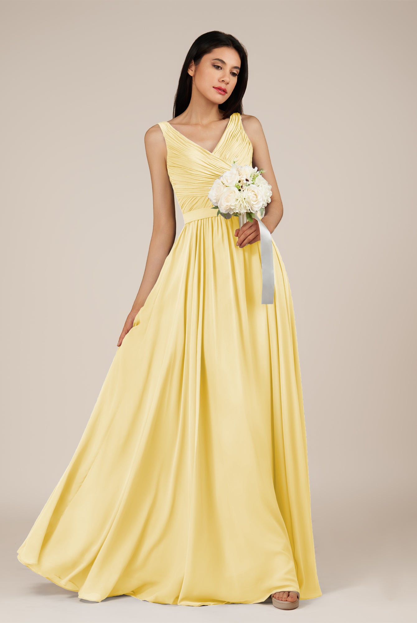 Lysander | Pastel Yellow - A Line Chiffon V Neck Pleated Long Bridesmaid Dress