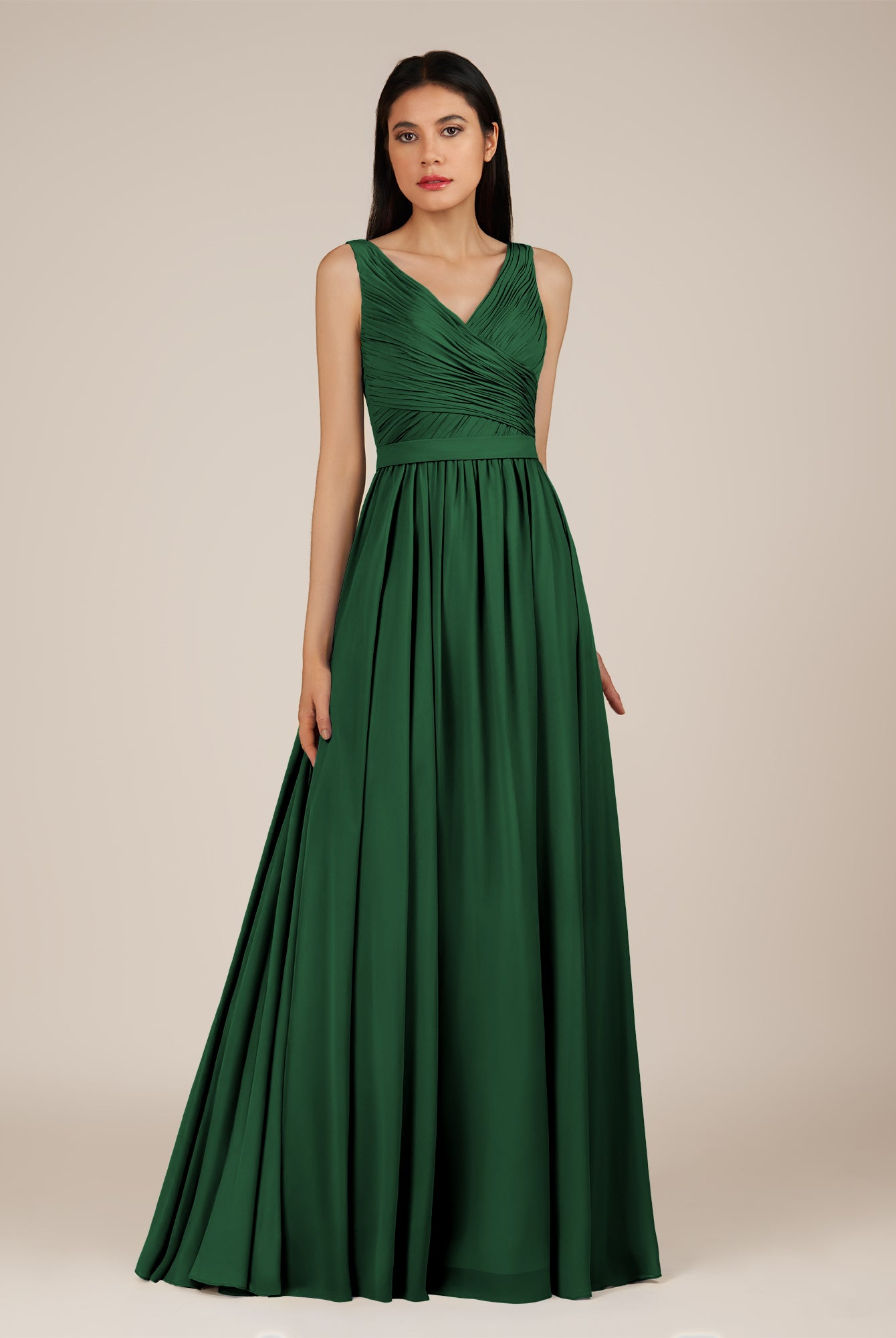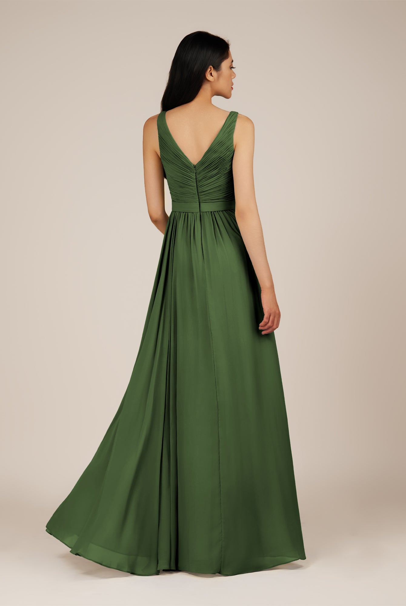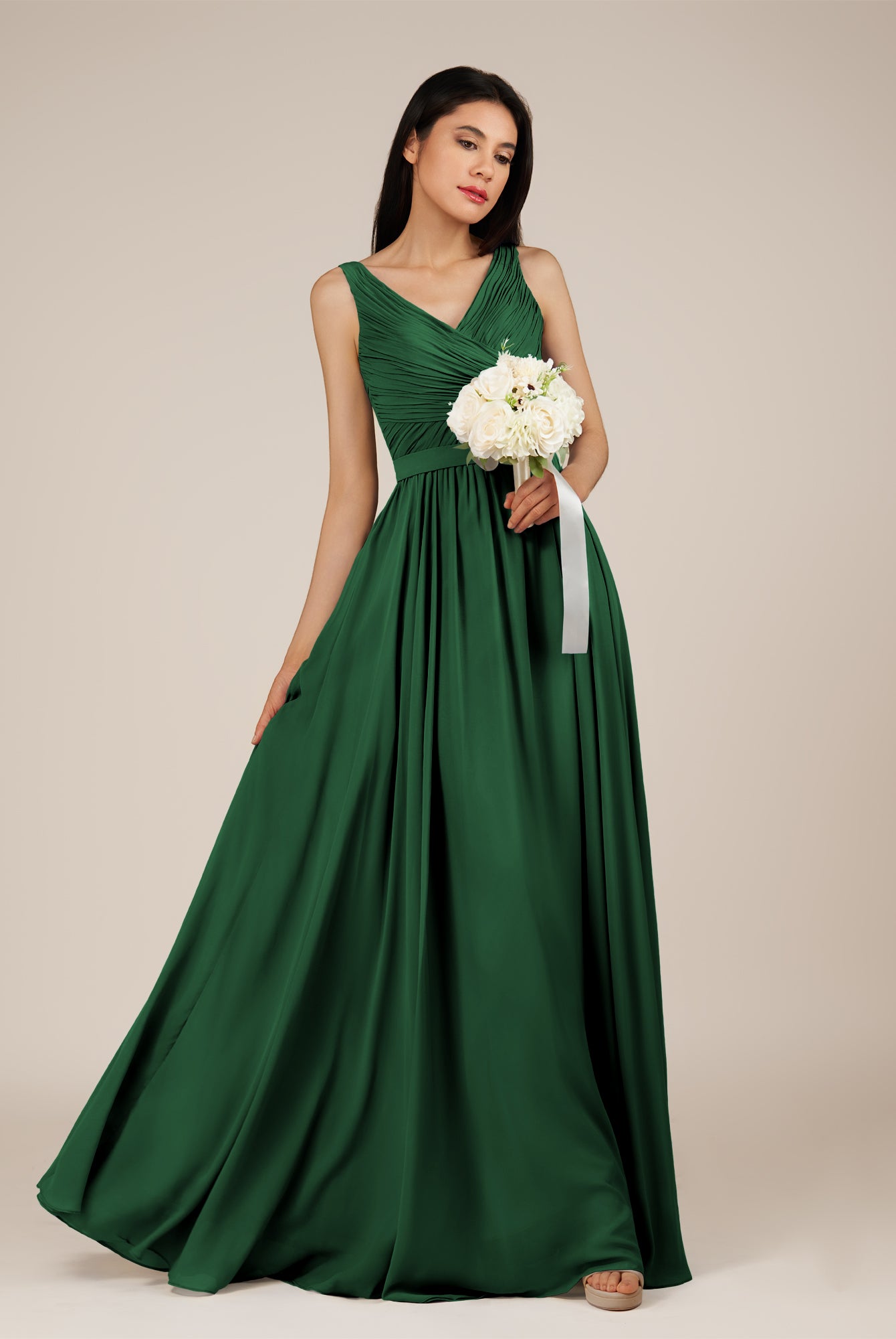 Lysander | Pine - A Line Chiffon V Neck Pleated Long Bridesmaid Dress